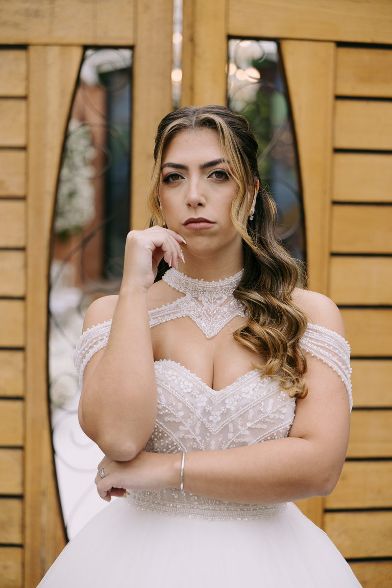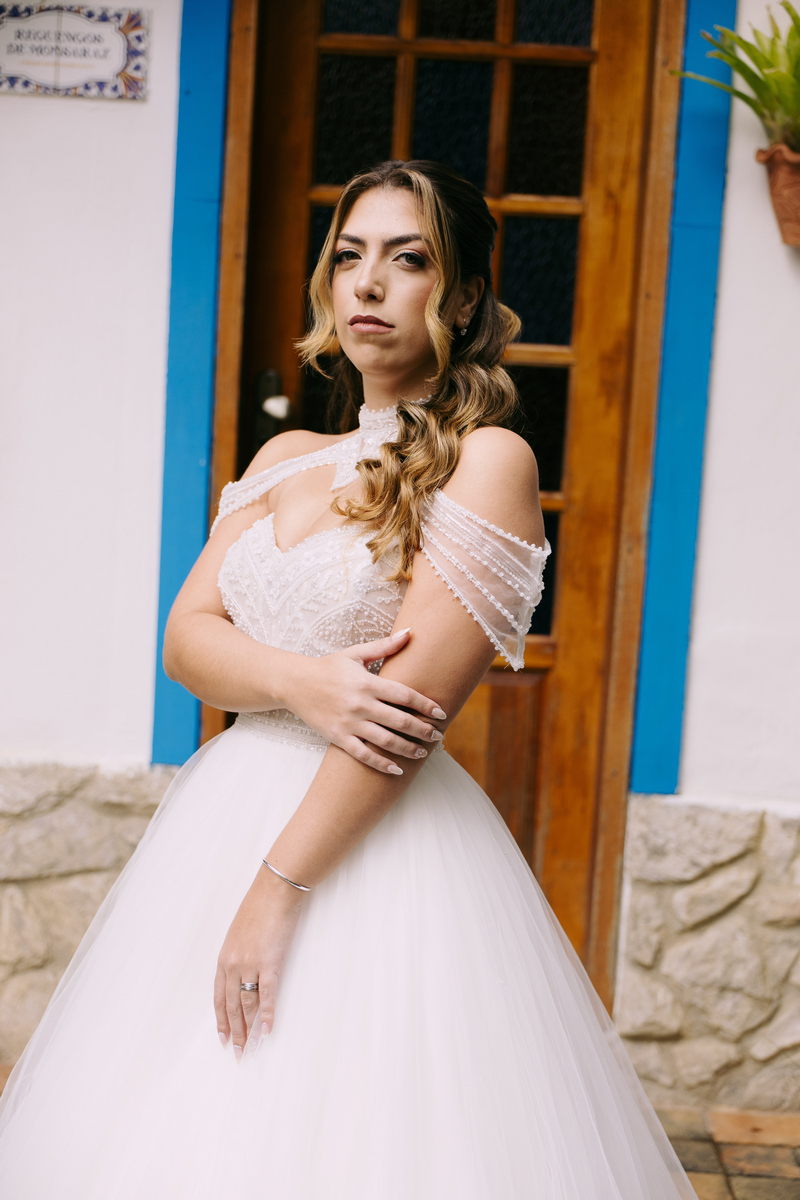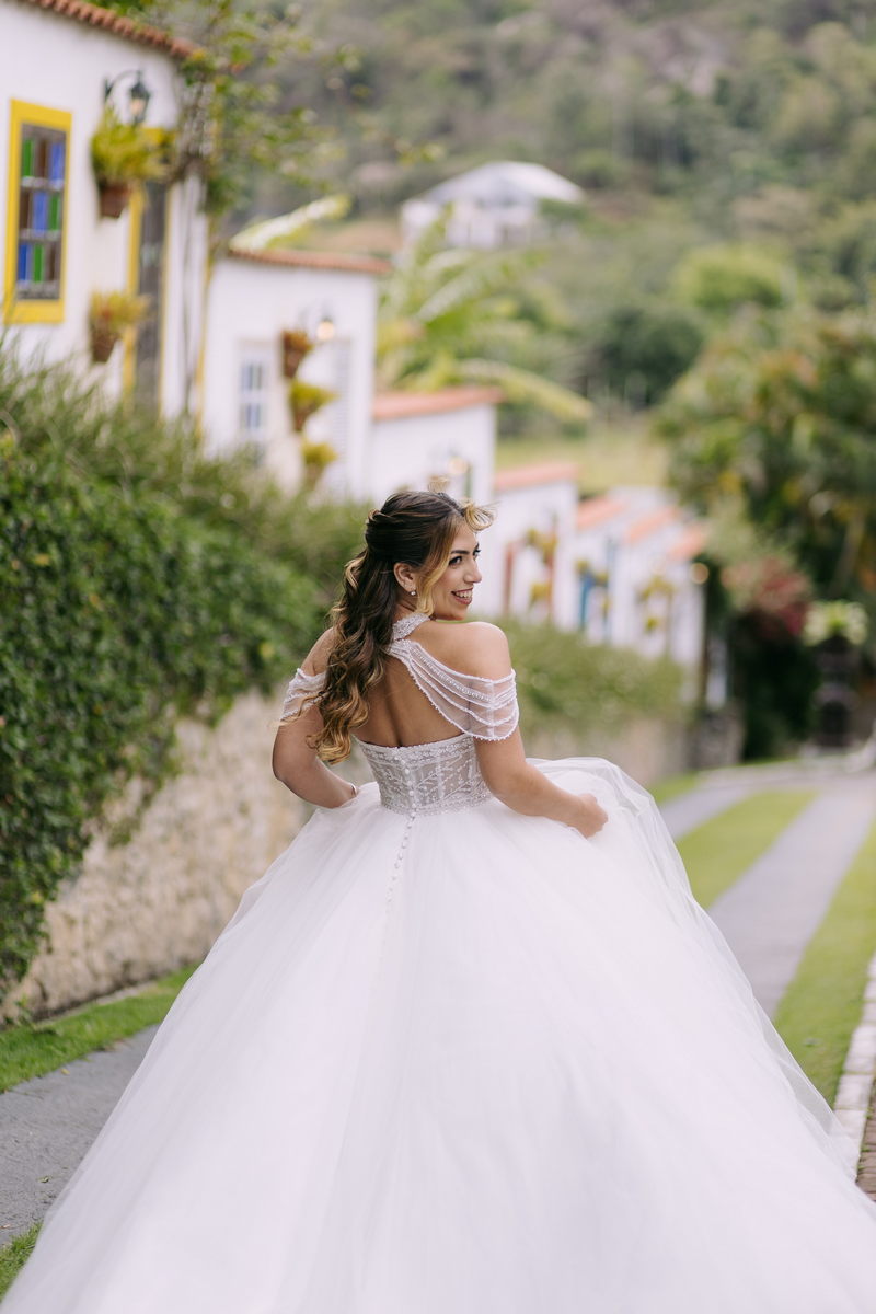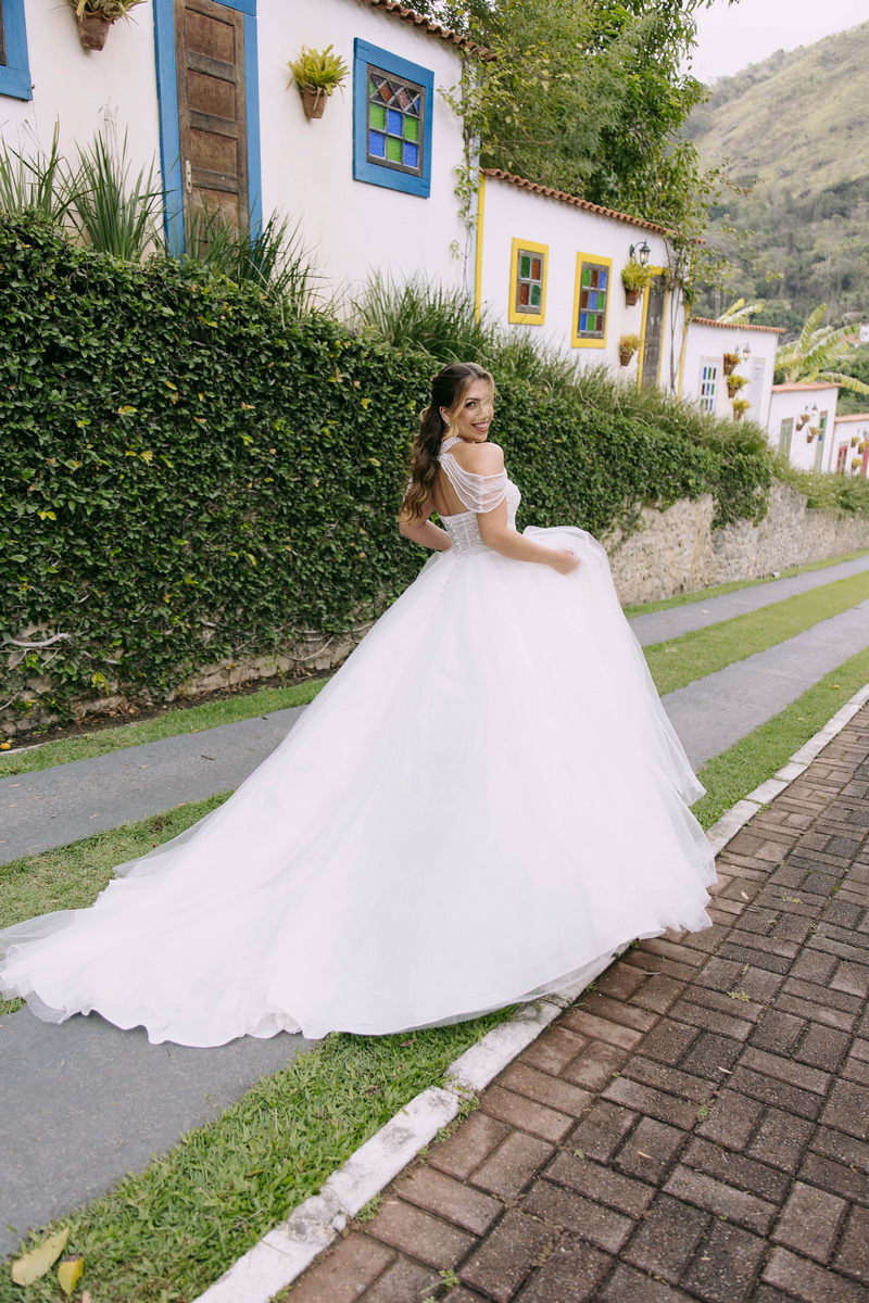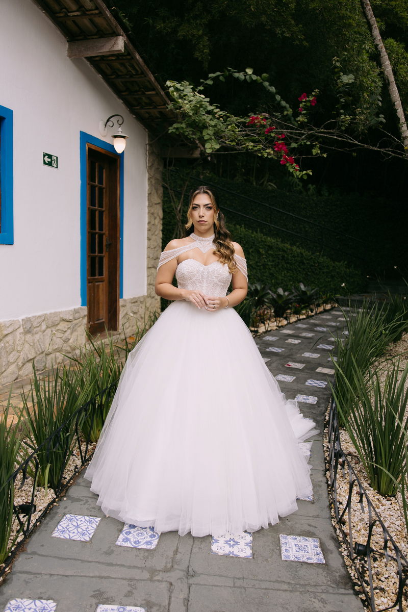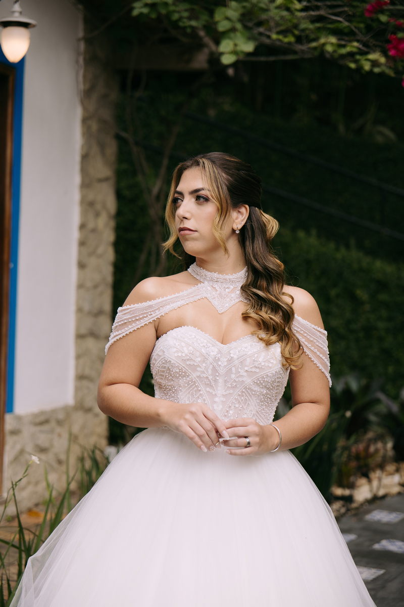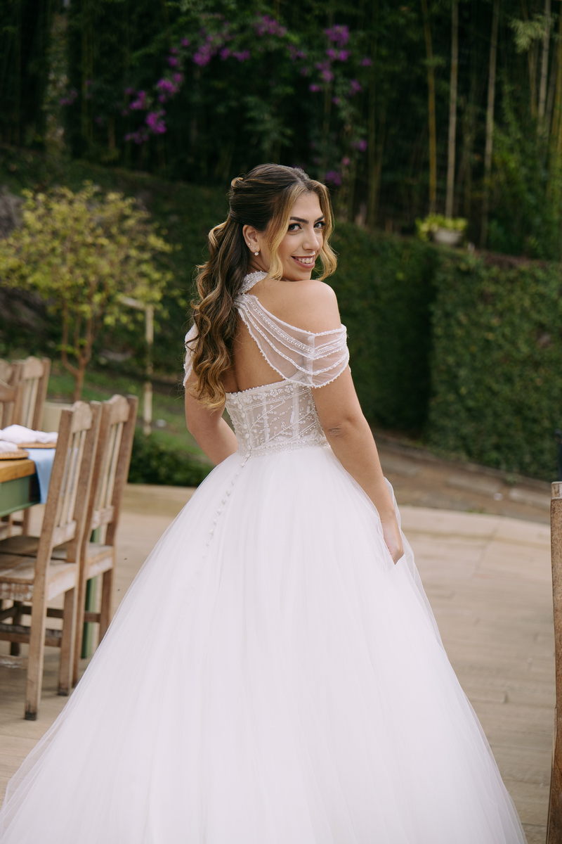 Monike estava simplesmente deslumbrante, sua beleza irradiava serenidade e alegria. Seu vestido de noiva Internovias era uma verdadeira obra de arte, digna de uma princesa. Inspirado no charme da princesa Jasmine da Disney, o modelo estilo princesa apresentava uma saia volumosa em tule, que conferia leveza e movimento etéreo a cada passo. O busto, ricamente adornado com pedrarias cintilantes, capturava a luz de forma delicada, adicionando um toque de glamour e sofisticação. Um detalhe diferenciado nos ombros e no pescoço complementada o vestido com encanto, criando um visual mágico e inesquecível.
