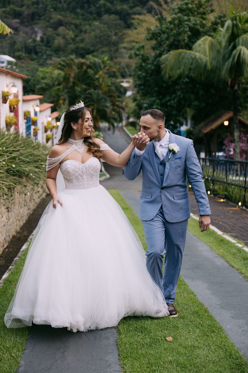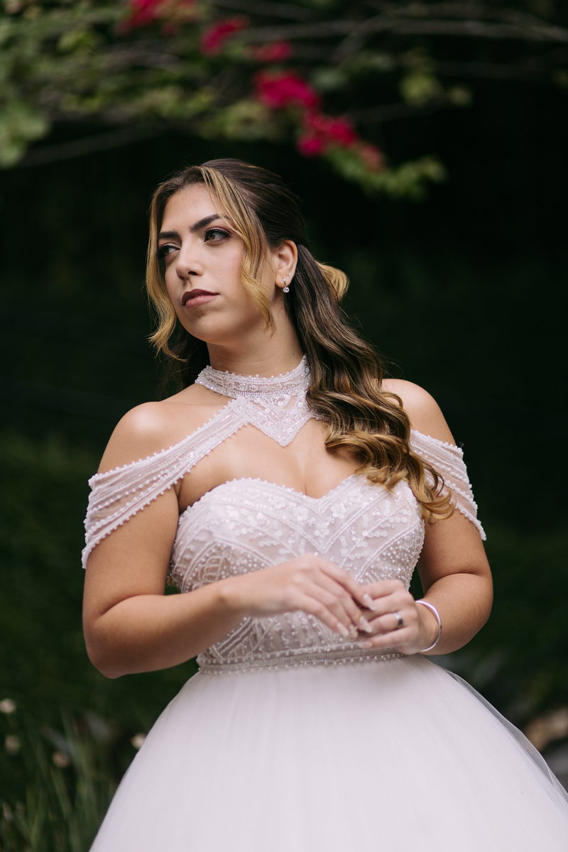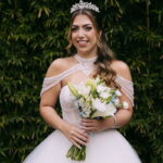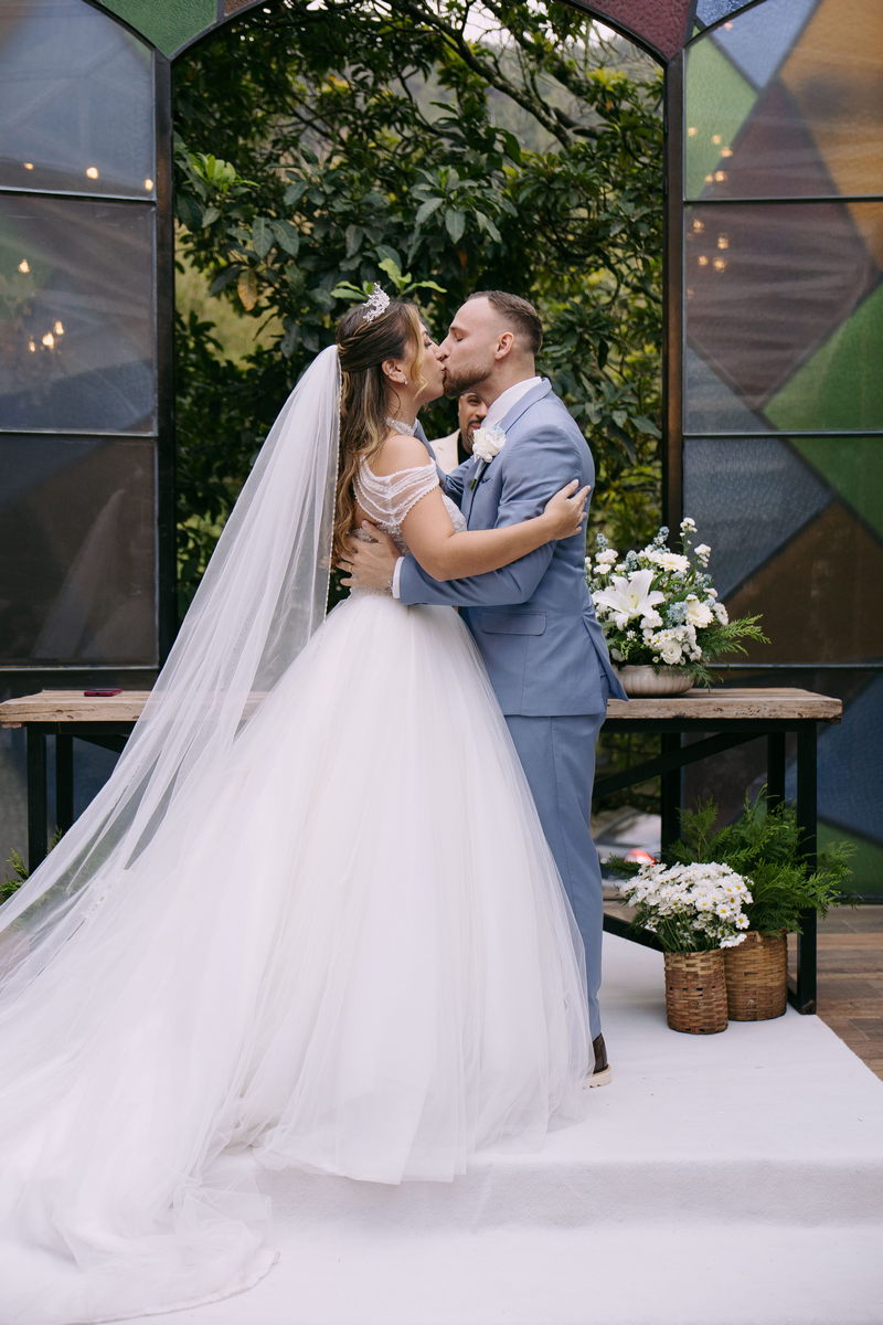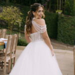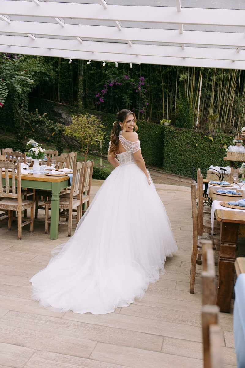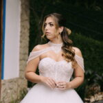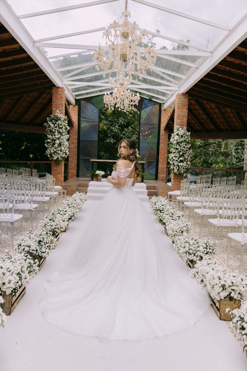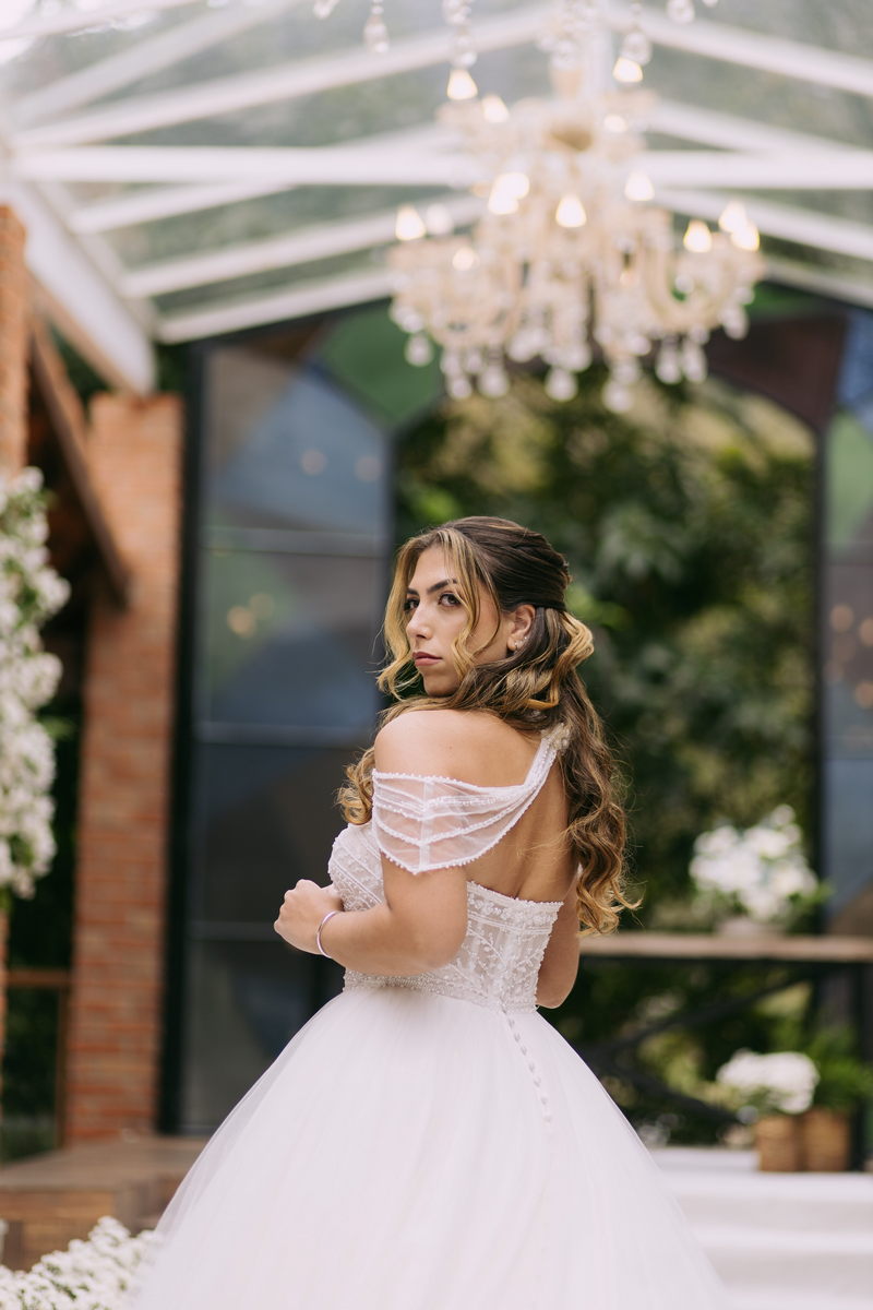 Monike estava simplesmente deslumbrante, sua beleza irradiava serenidade e alegria. Seu vestido de noiva Internovias era uma verdadeira obra de arte, digna de uma princesa. Inspirado no charme da princesa Jasmine da Disney, o modelo estilo princesa apresentava uma saia volumosa em tule, que conferia leveza e movimento etéreo a cada passo. O busto, ricamente adornado com pedrarias cintilantes, capturava a luz de forma delicada, adicionando um toque de glamour e sofisticação. Um detalhe diferenciado nos ombros e no pescoço complementada o vestido com encanto, criando um visual mágico e inesquecível.