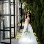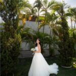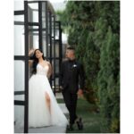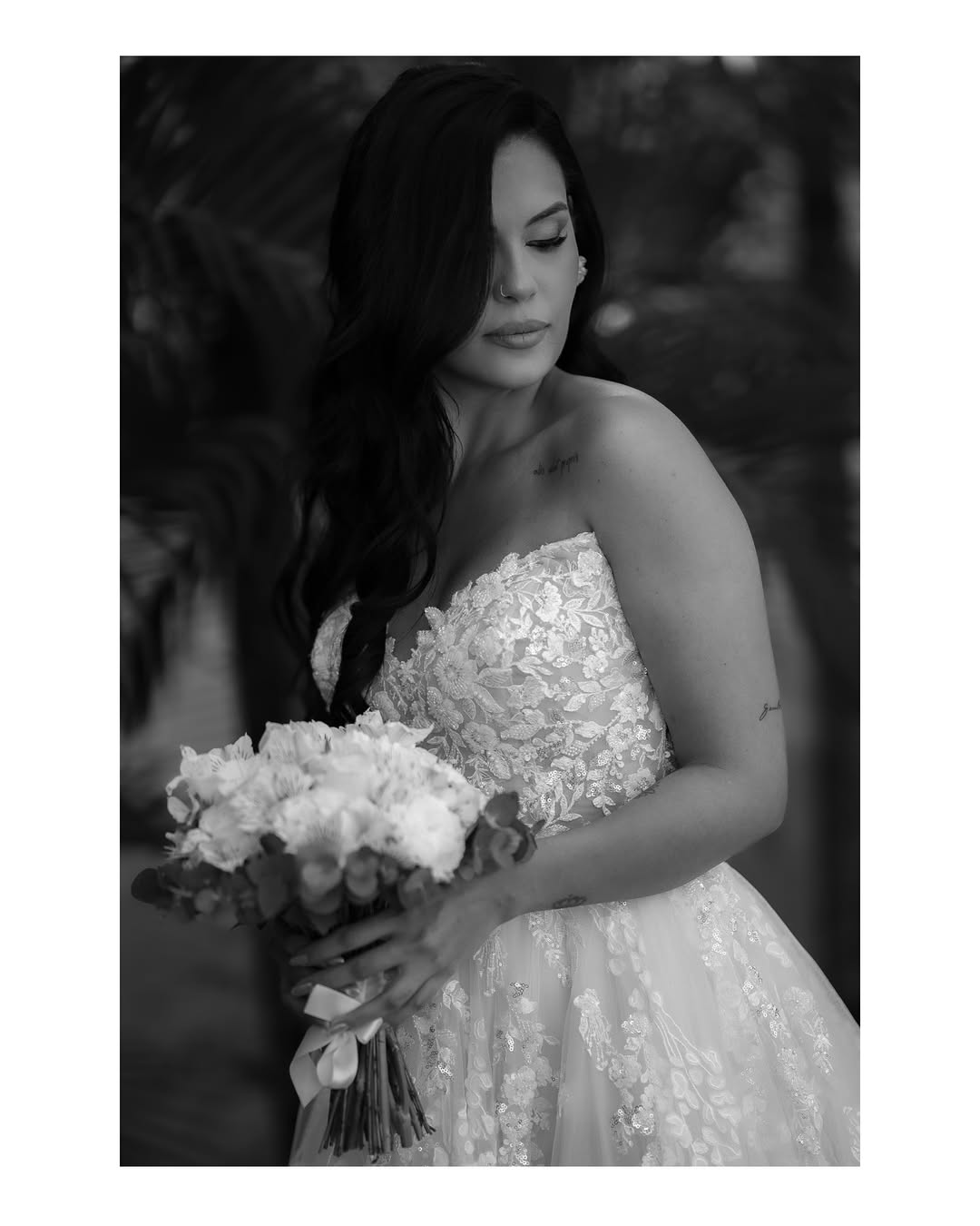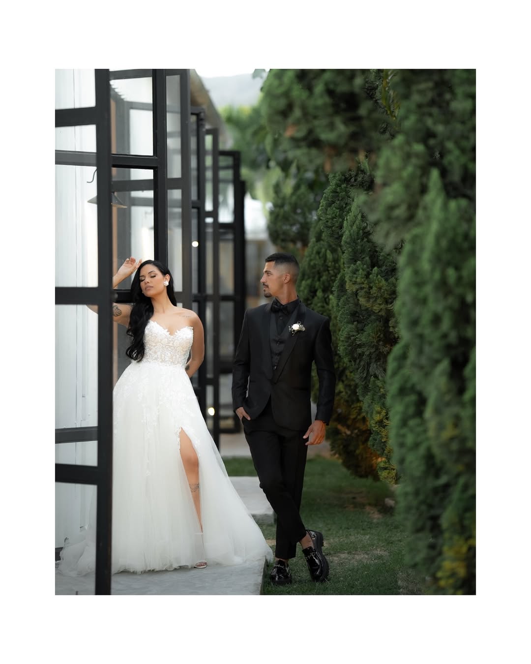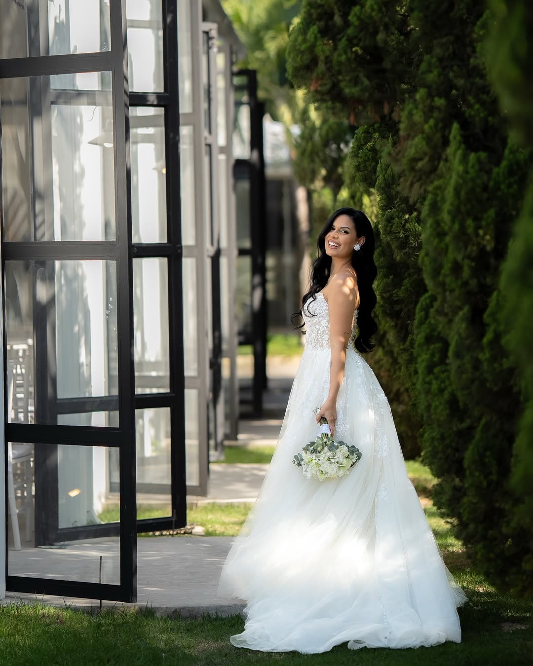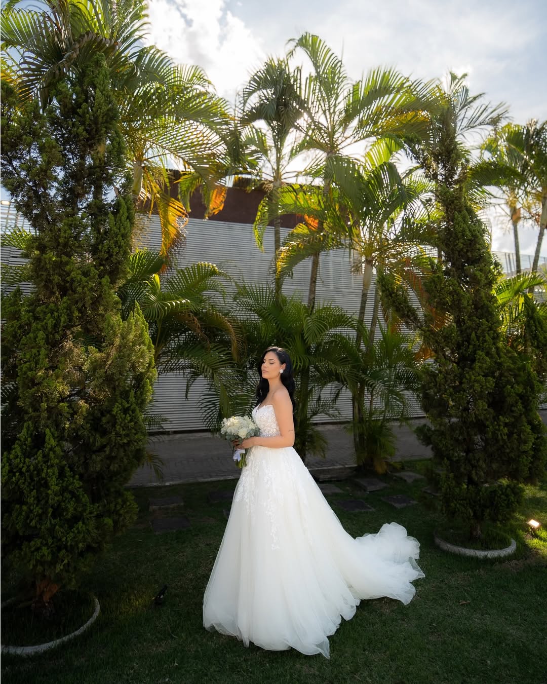 Thamires estava deslumbrante como noiva! Seu vestido de noiva Internovias, um modelo tomara‑que‑caia, realçou o colo com elegância, enquanto o corpete estruturado, adornado por renda floral delicada, trouxe romantismo e feminilidade. A saia volumosa em camadas com detalhes em renda criou movimento suave a cada passo, iluminada pela luz natural do ambiente, que evidenciava a fluidez do tecido e o acabamento impecável. O destaque ficou na belíssima fenda, na perna esquerda, que tornava o look ainda mais encantador, amamos tudo!