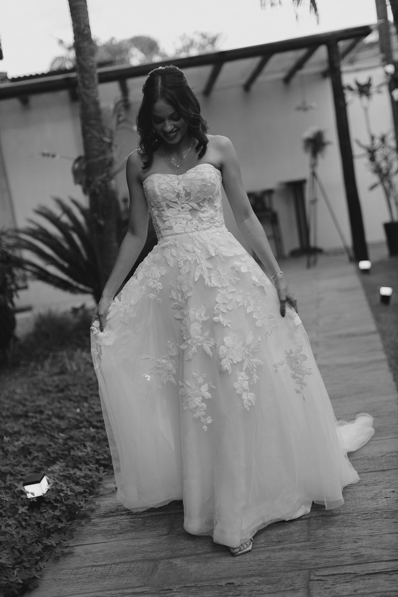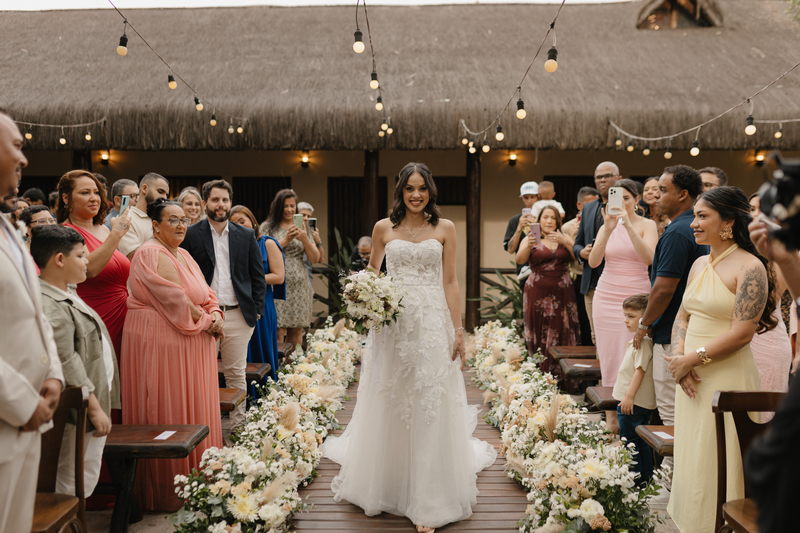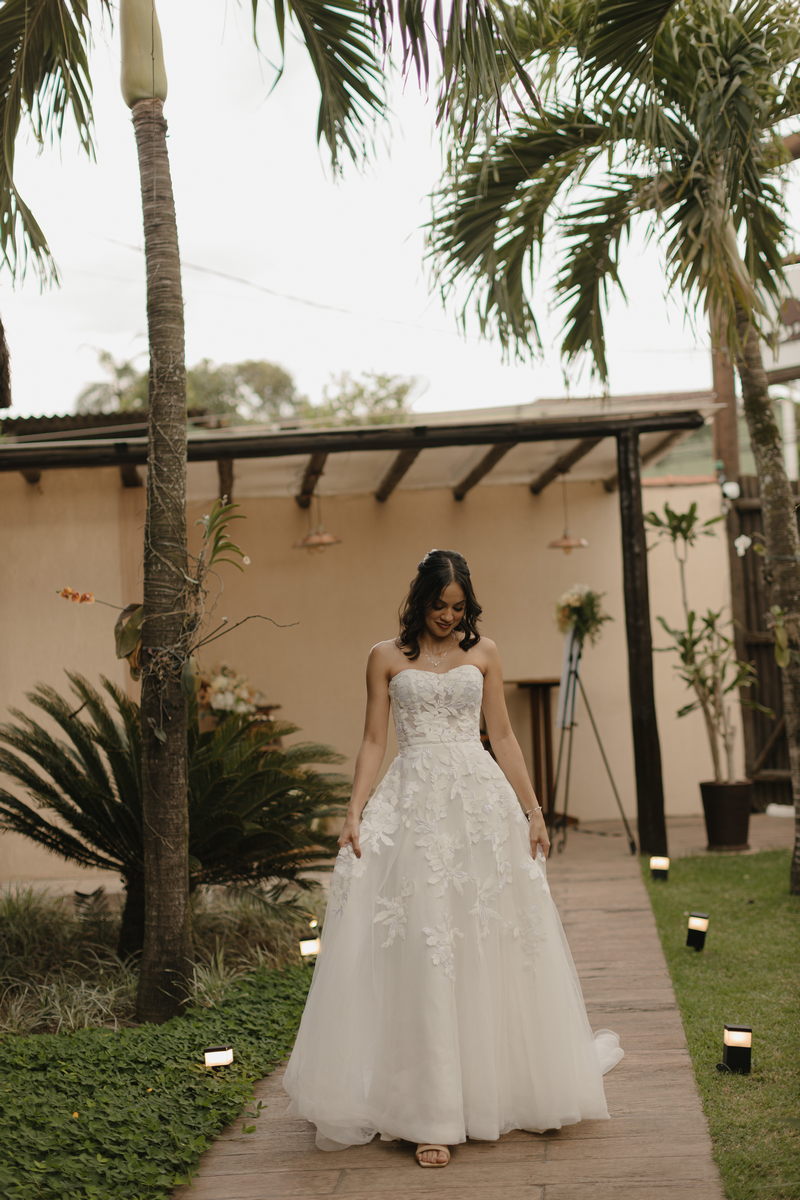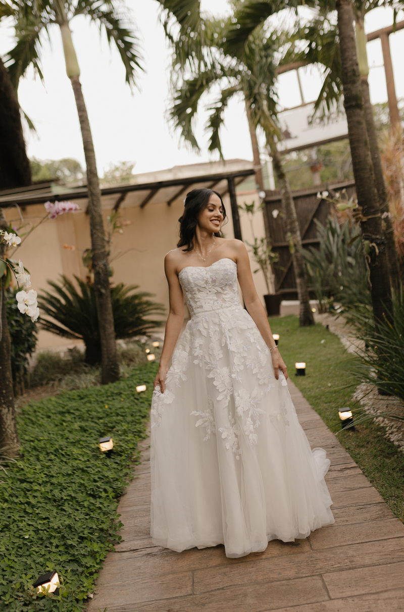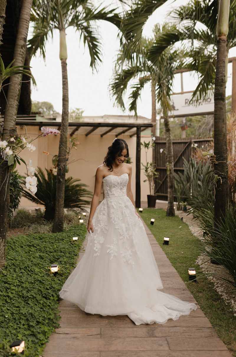 Kathleen encantou a todos com sua beleza e sorriso. O seu vestido de noiva Internovias reforçou ainda mais essa delicadeza, trazendo um equilíbrio perfeito entre romantismo e sofisticação. O modelo evasê estilo sereia destacou sua silhueta com elegância, começando pelo busto todo rendado com detalhes em transparência, continuando pela saia leve com detalhes em rendas belíssimas. Já o tomara que caia com decote em coração moldou o colo com suavidade, mantendo um visual feminino e moderno.