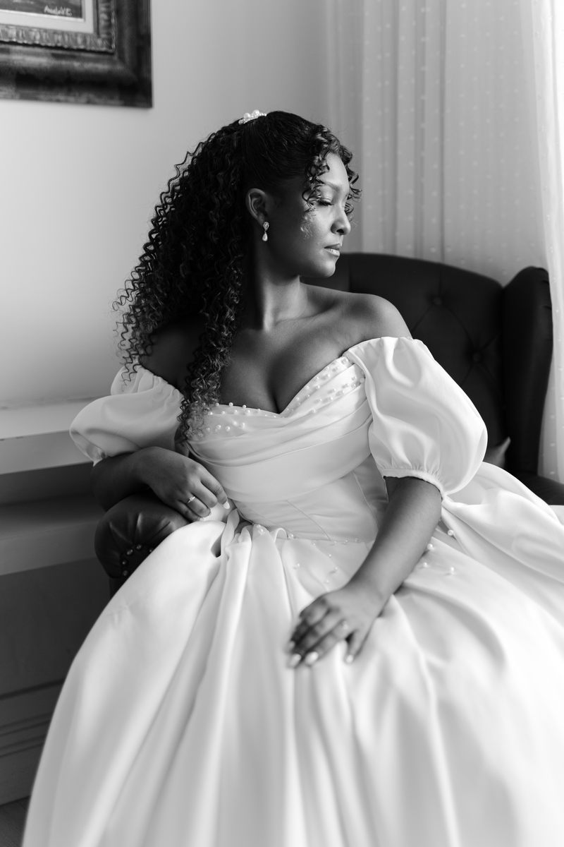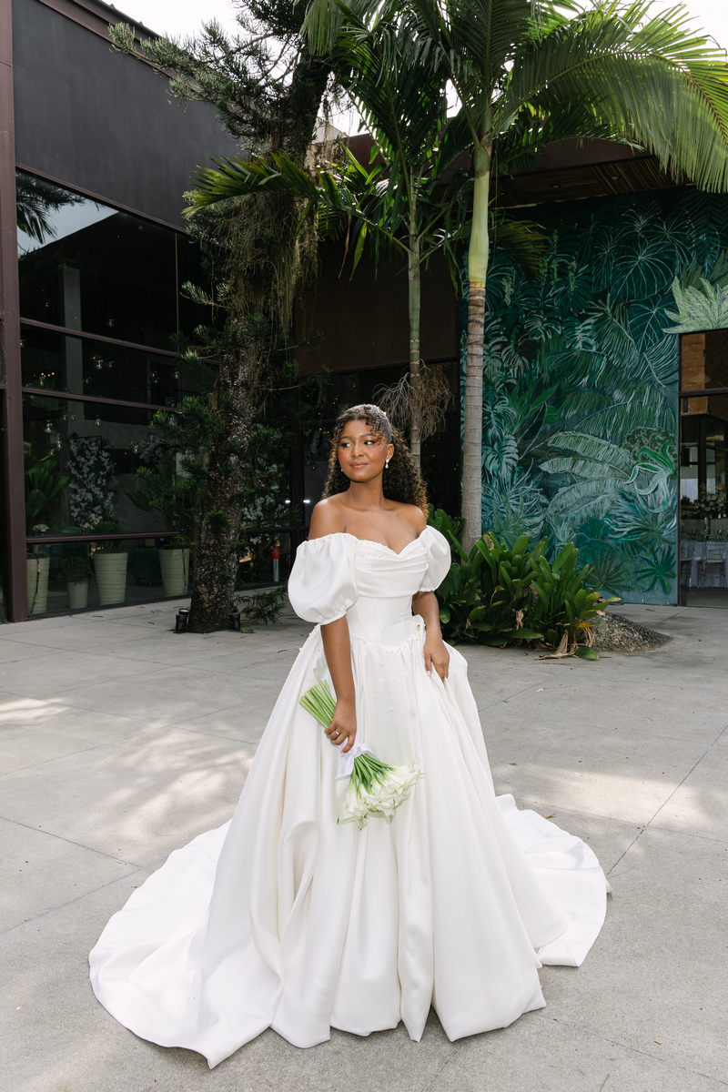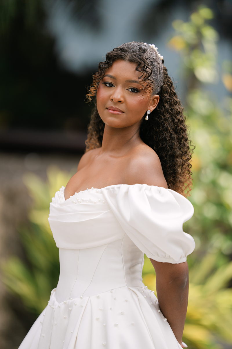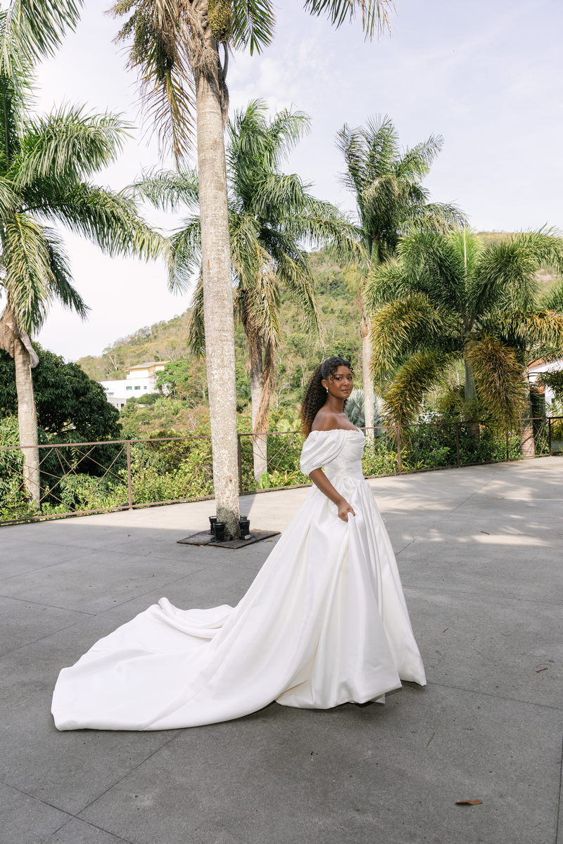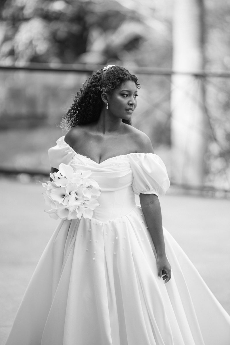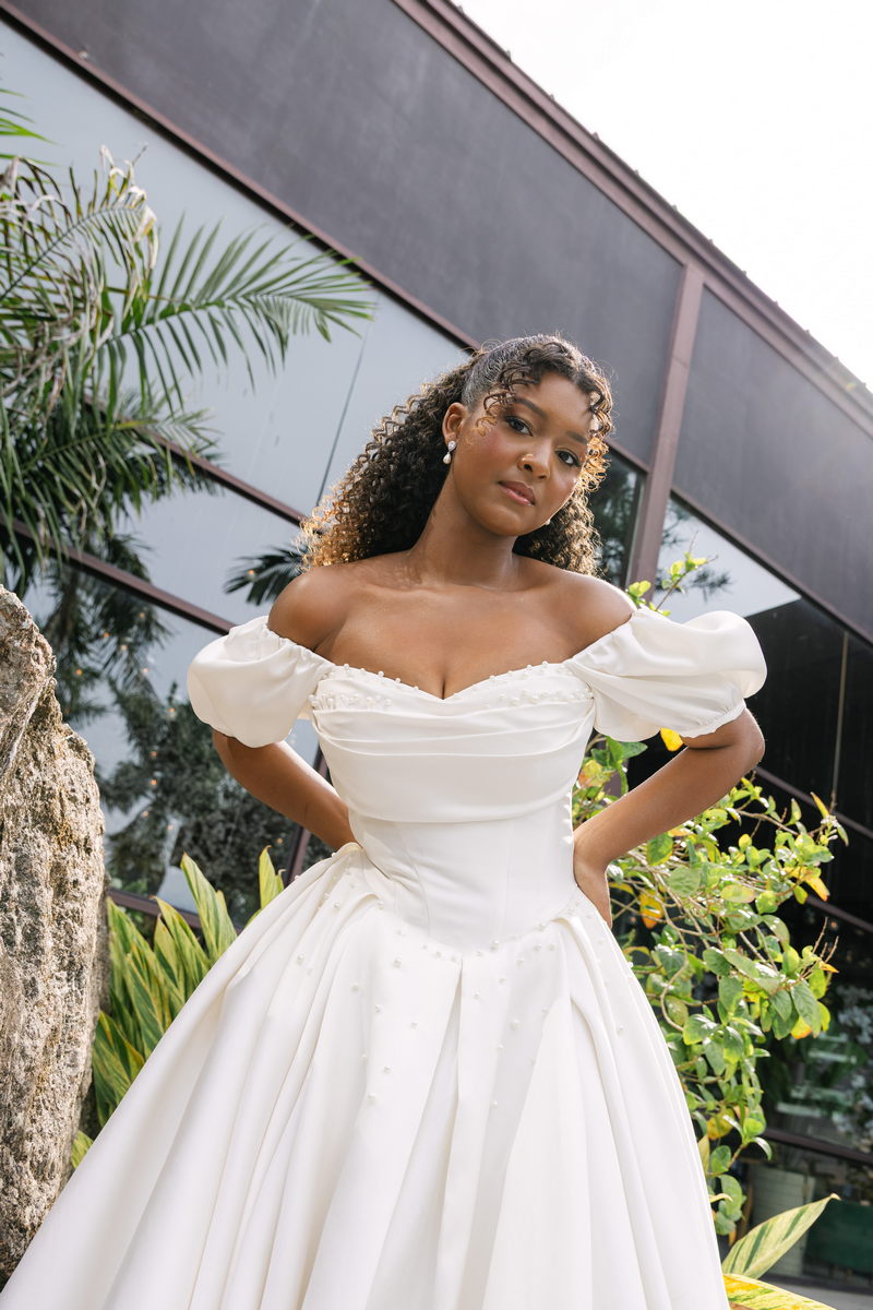 Allice trouxe consigo uma presença marcante, com seu sorriso sereno e beleza incomparável. Seu vestido de noiva Internovias, traduziu com perfeição a personalidade da noiva: romântica, elegante e contemporânea. O modelo princesa com decote ombro a ombro delicado, mangas bufantes curtas conferiram um toque de romantismo clássico sem pesar. O corpete estruturado valorizou a sua silhueta com sutileza, enquanto a saia ampla ganhou vida com pequenas aplicações de pérolas delicadas, permitindo que sua personalidade brilhasse em cada foto.
