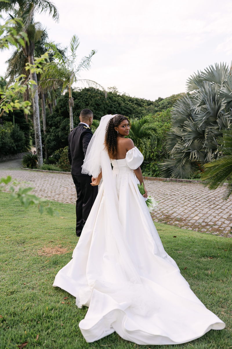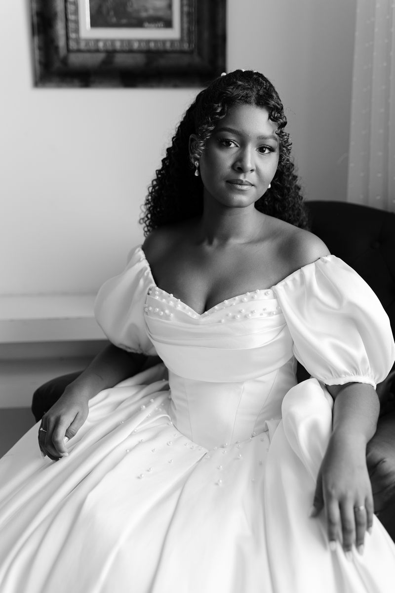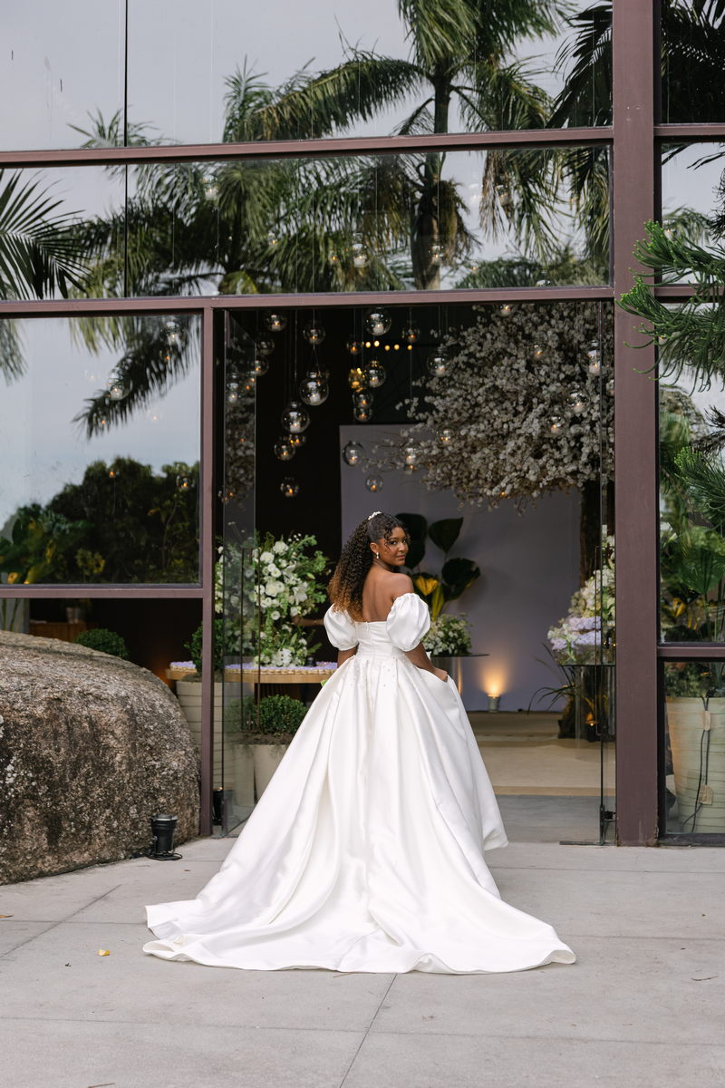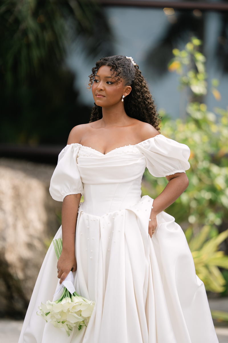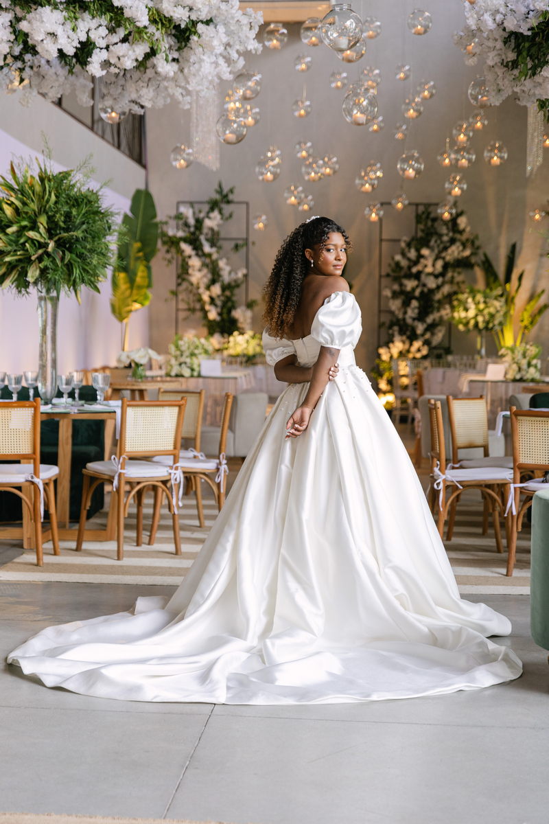 Allice trouxe consigo uma presença marcante, com seu sorriso sereno e beleza incomparável. Seu vestido de noiva Internovias, traduziu com perfeição a personalidade da noiva: romântica, elegante e contemporânea. O modelo princesa com decote ombro a ombro delicado, mangas bufantes curtas conferiram um toque de romantismo clássico sem pesar. O corpete estruturado valorizou a sua silhueta com sutileza, enquanto a saia ampla ganhou vida com pequenas aplicações de pérolas delicadas, permitindo que sua personalidade brilhasse em cada foto.