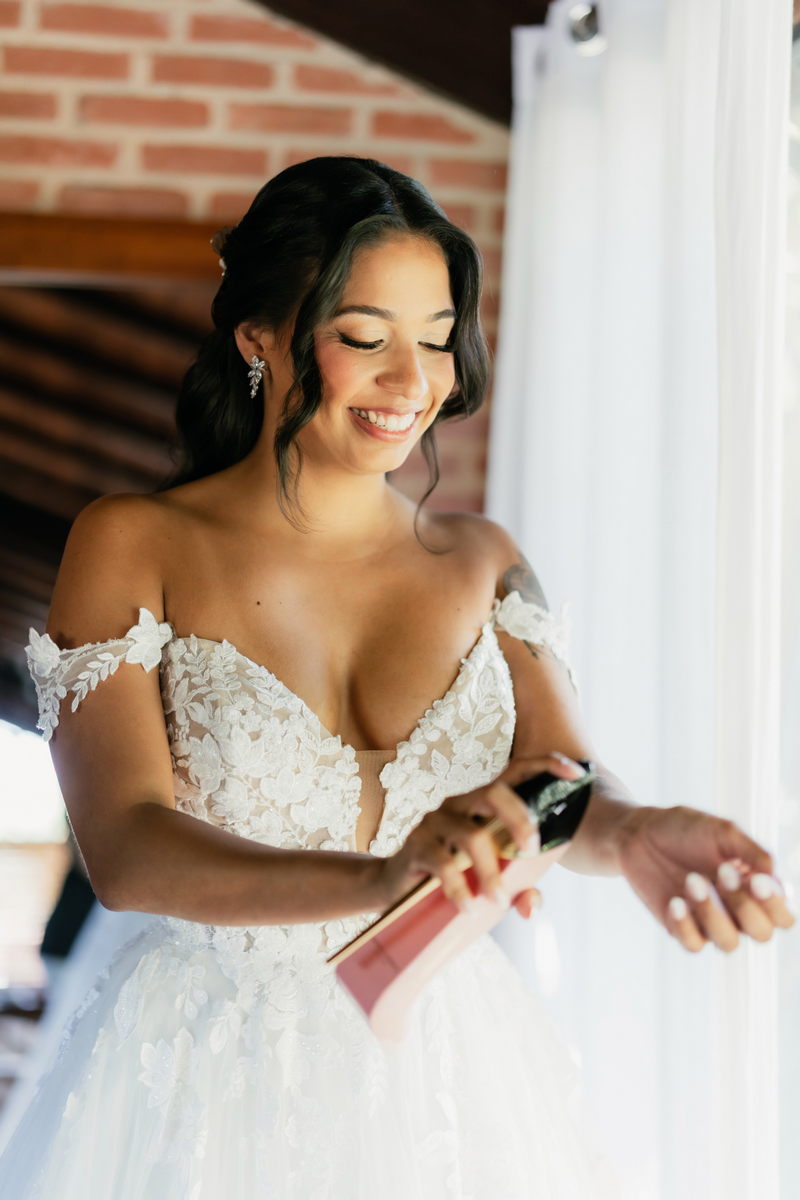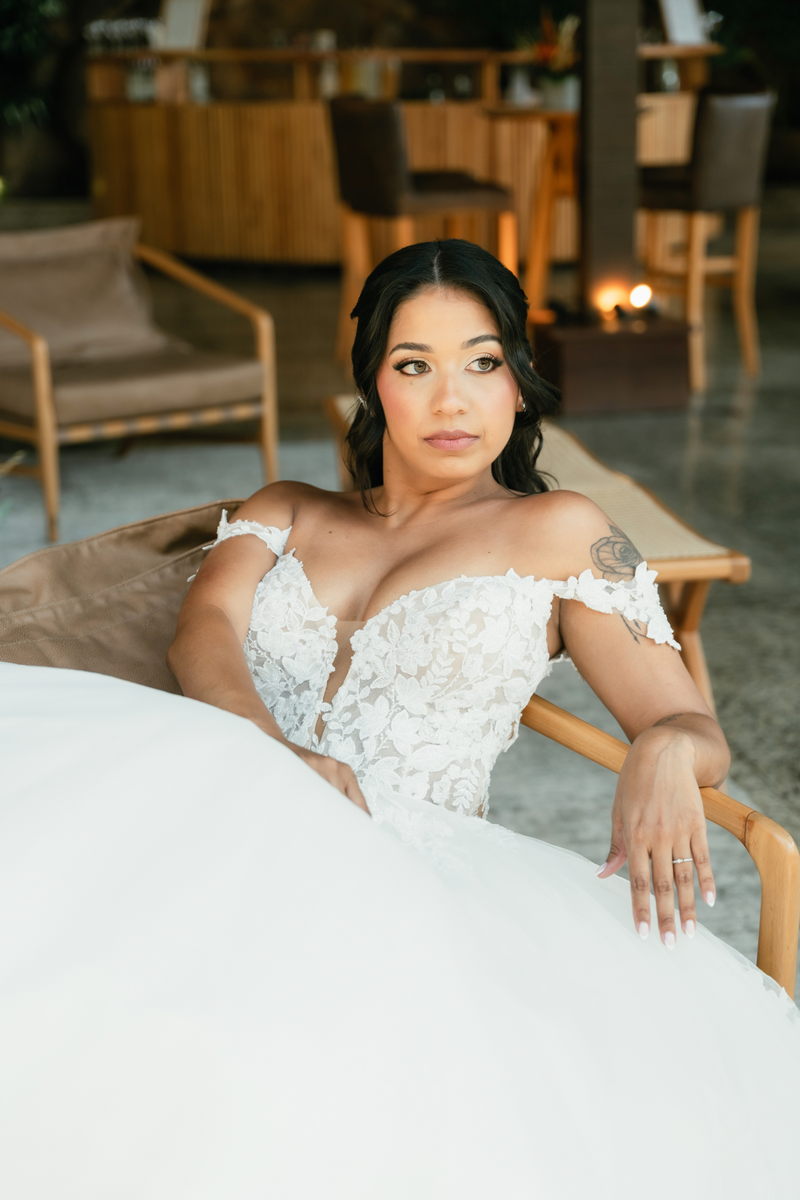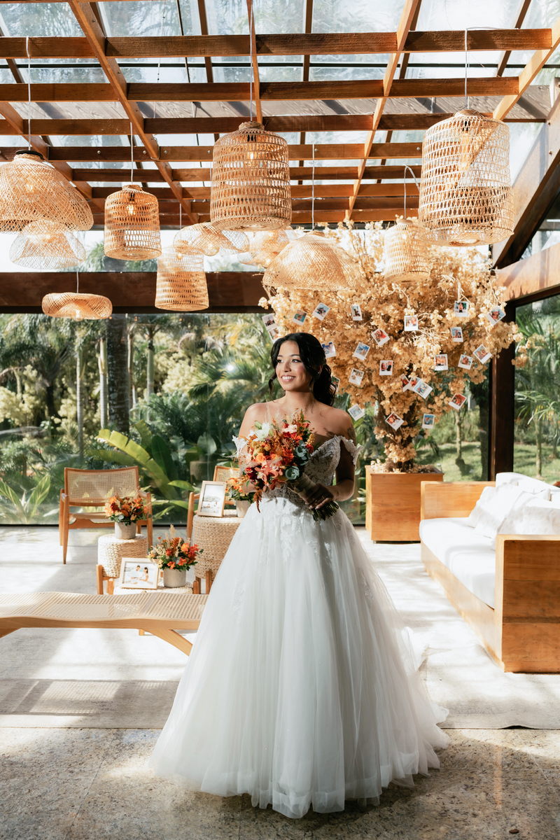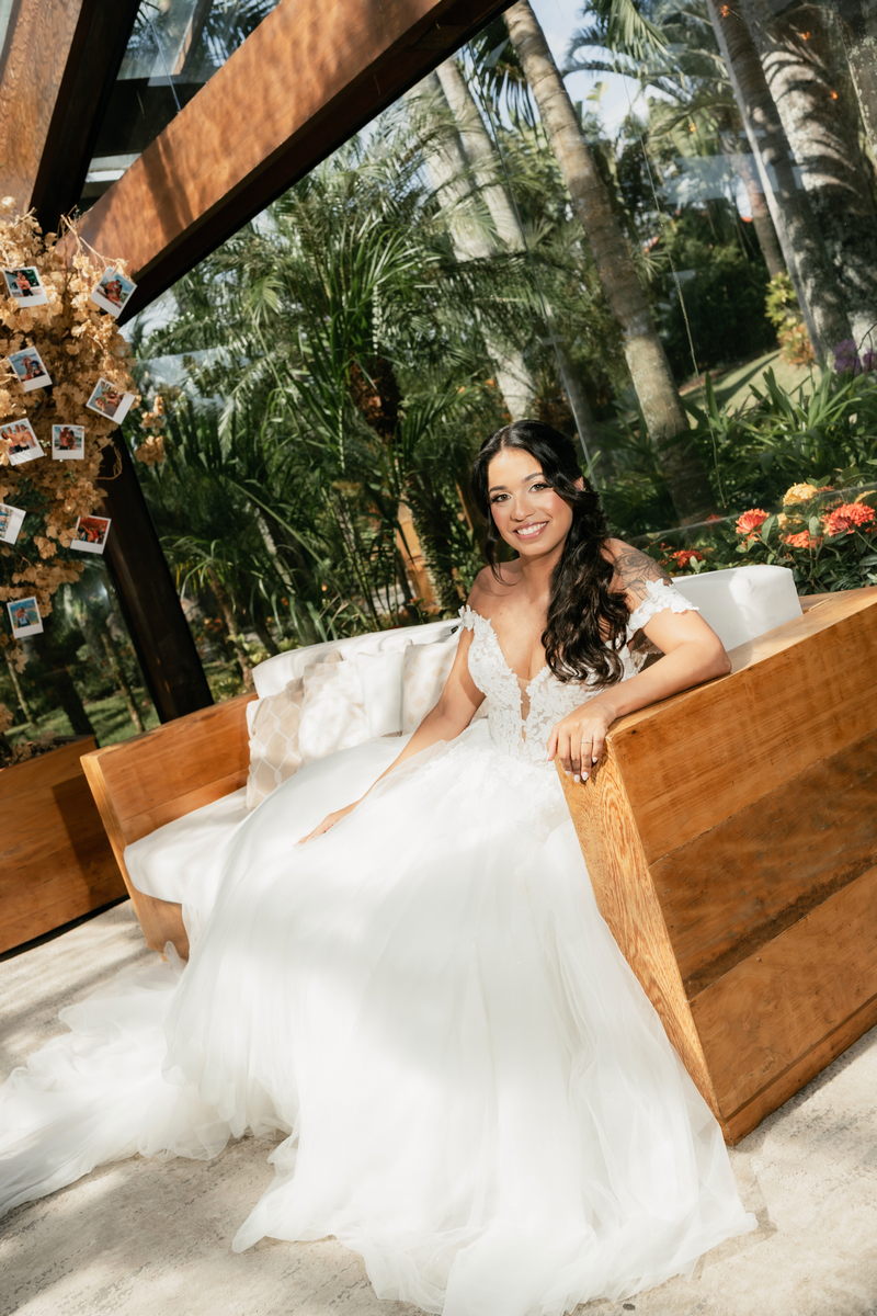 Andressa estava deslumbrante de noiva, sua beleza e felicidade encantaram todos os convidados. O seu vestido de noiva Internovias valorizou sua essência de forma impecável. O modelo, estilo princesa, trazia um caimento volumoso e elegante. O decote ombro a ombro destacava os ombros com suavidade, enquanto a renda floral aplicada no corpete oferecia delicadeza. A saia em camadas de tule criava um movimento leve que deixava o visual ainda mais romântico.