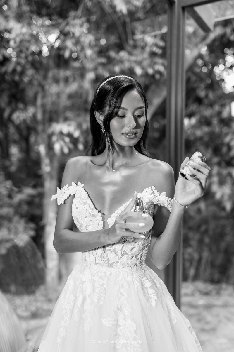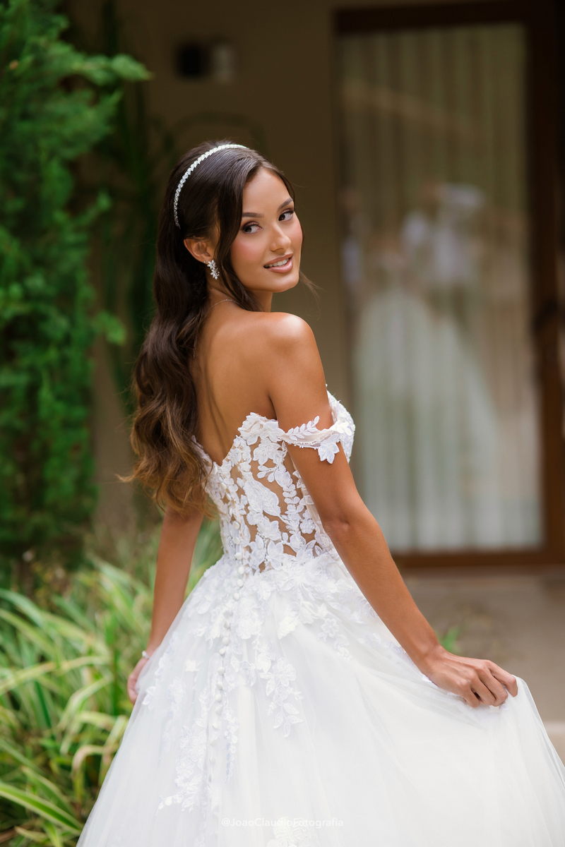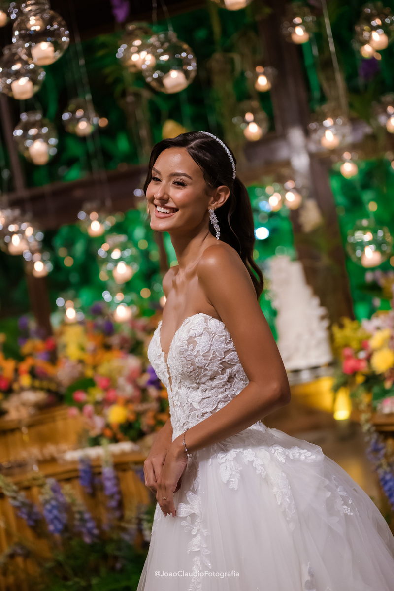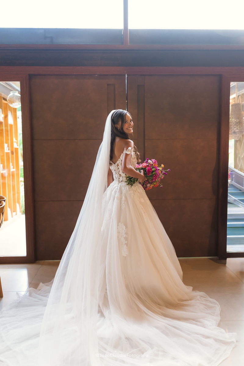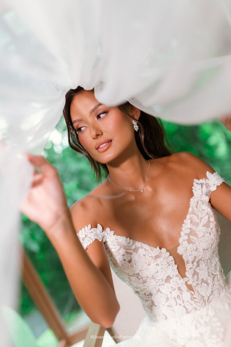 Camile chamou atenção desde os primeiros passos, não só por sua beleza, mas também pela serenidade do olhar e alegria marcante. Esse charme ganhou ainda mais força com o vestido de noiva Internovias, um modelo estilo princesa com decote ombro a ombro e mangas rendadas removíveis, super encantador. A renda delicada, distribuída por todo o busto, trazia romantismo e o decote em V com transparência acrescentava um toque de elegância. A saia fluida acompanhava os movimentos com naturalidade, criando um caimento leve e romântico.