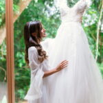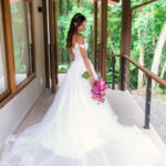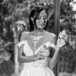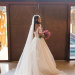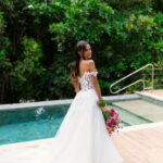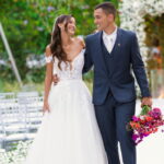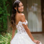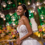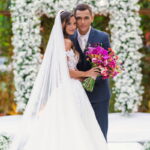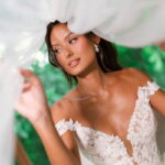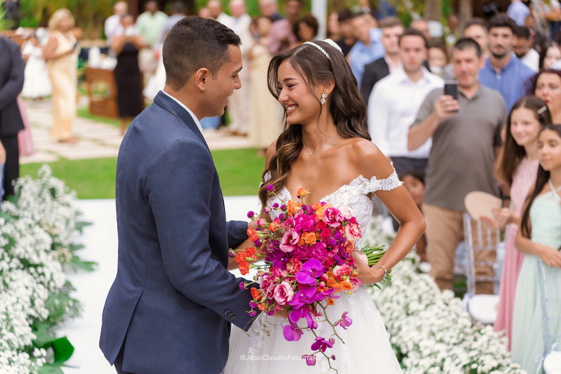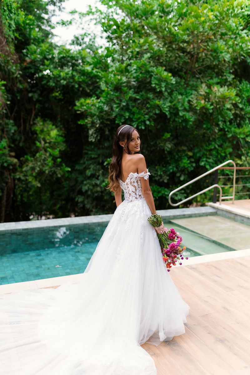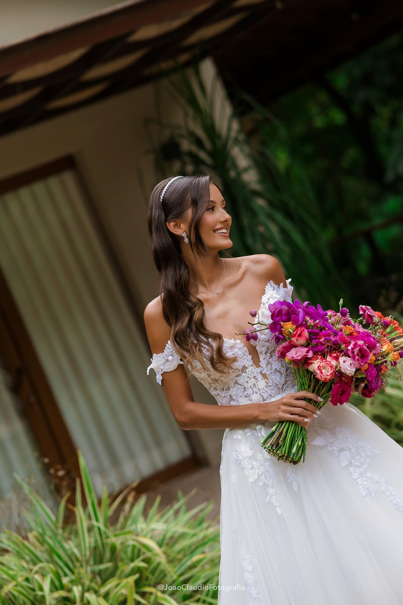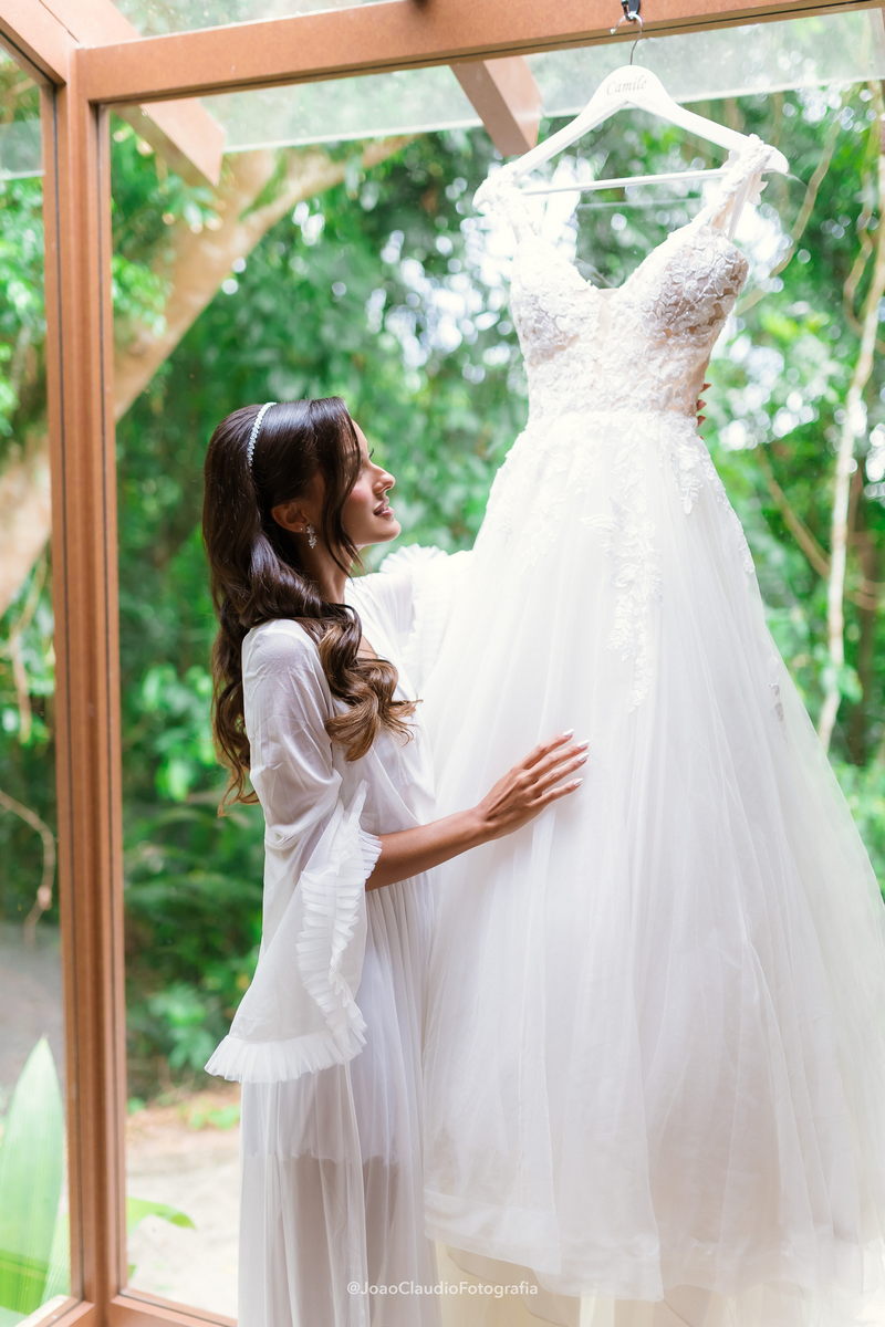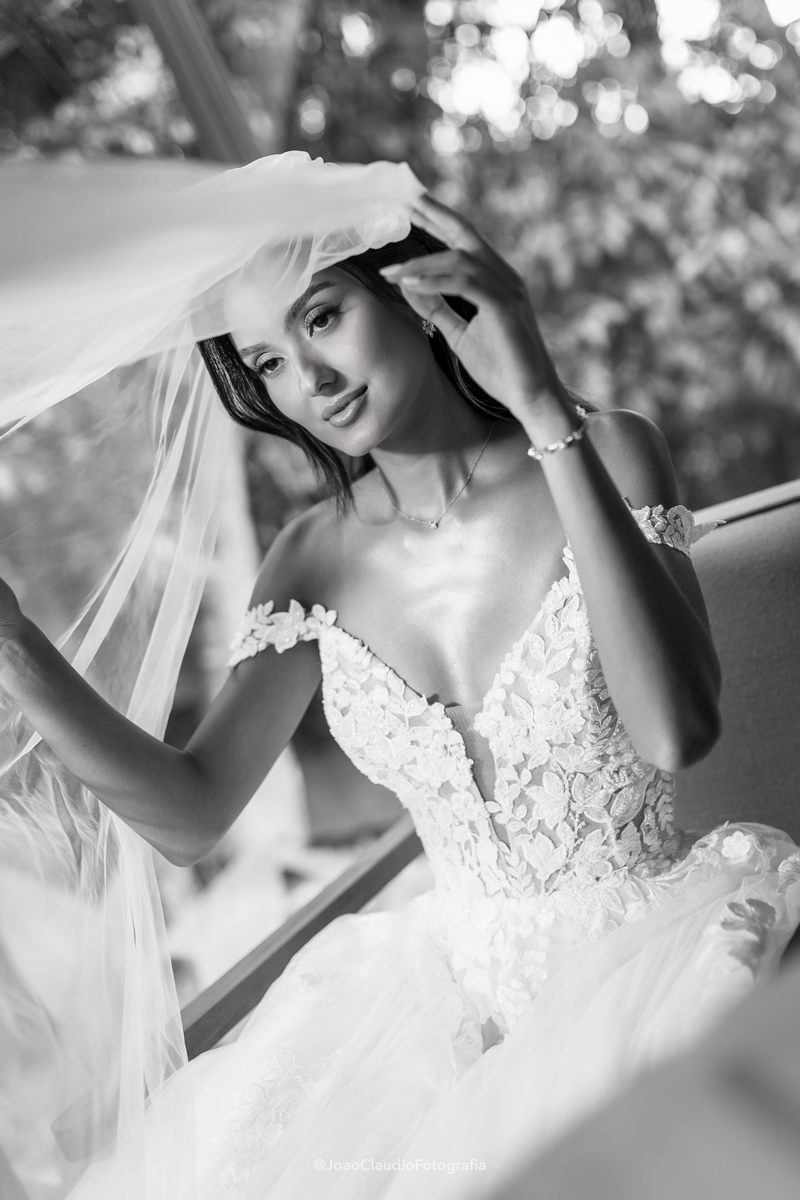 Camile chamou atenção desde os primeiros passos, não só por sua beleza, mas também pela serenidade do olhar e alegria marcante. Esse charme ganhou ainda mais força com o vestido de noiva Internovias, um modelo estilo princesa com decote ombro a ombro e mangas rendadas removíveis, super encantador. A renda delicada, distribuída por todo o busto, trazia romantismo e o decote em V com transparência acrescentava um toque de elegância. A saia fluida acompanhava os movimentos com naturalidade, criando um caimento leve e romântico.