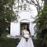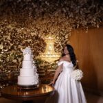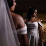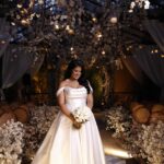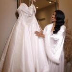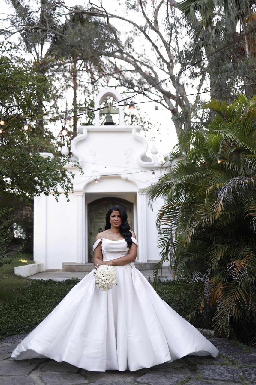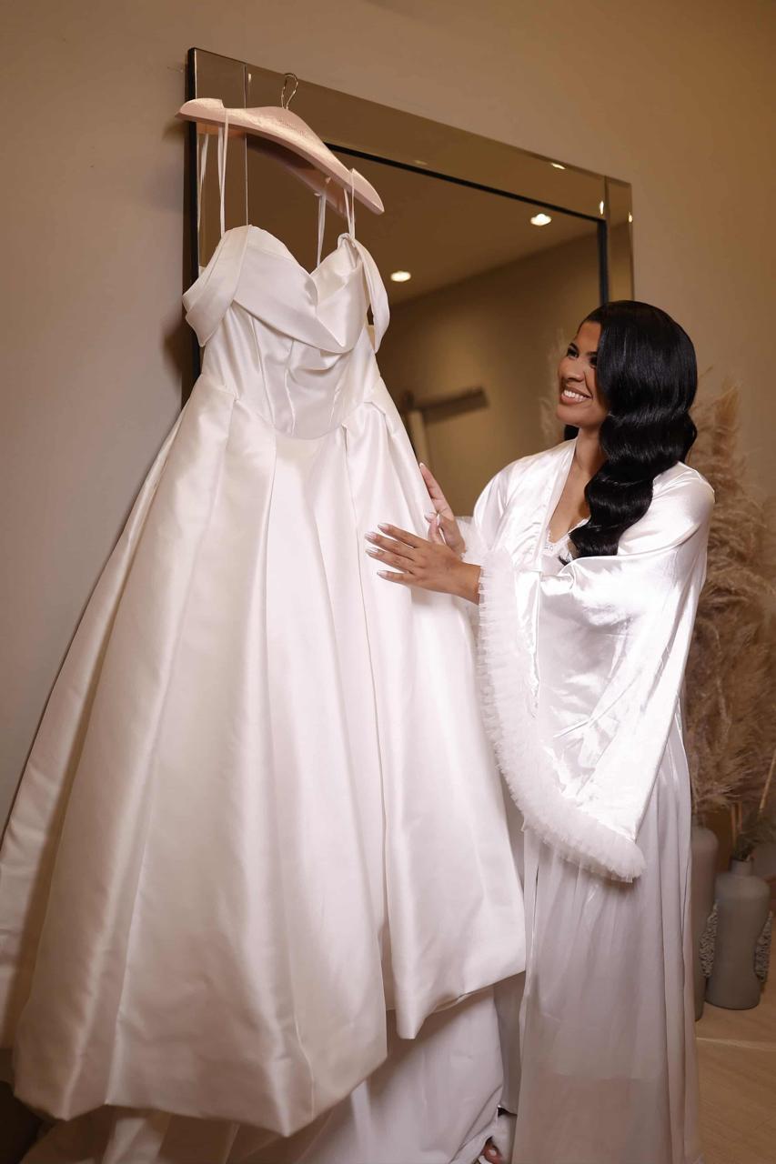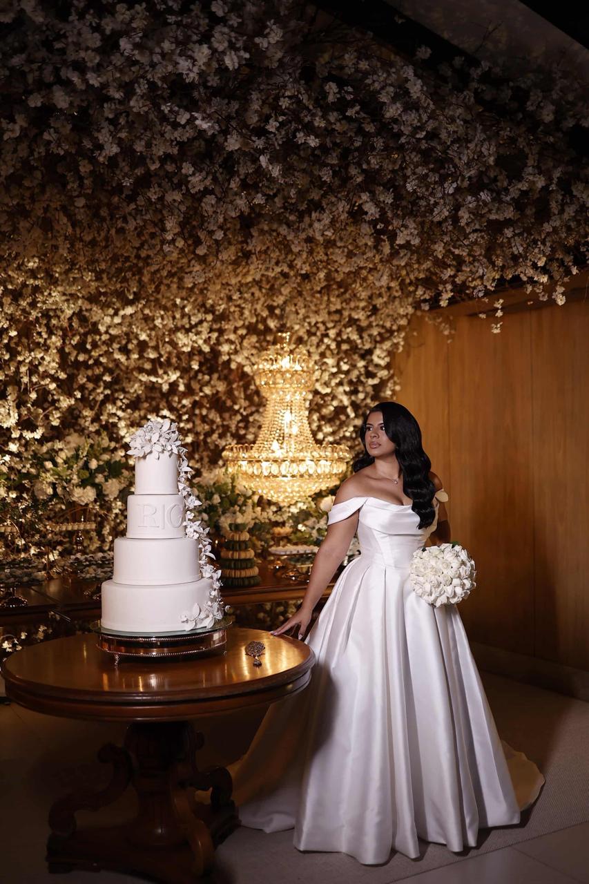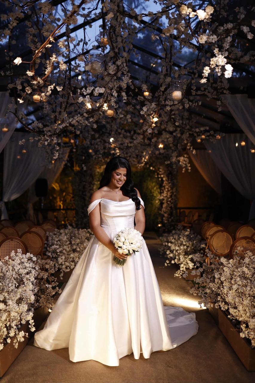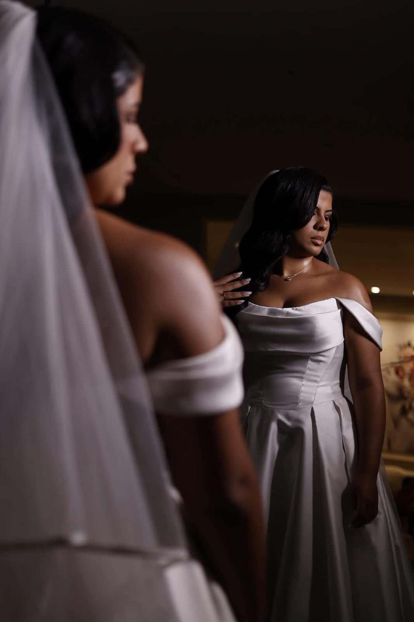 Raymara surge radiante, com seu sorriso suave que ilumina o ambiente. O vestido de noiva Internovias escolhido por ela reforça essa beleza com perfeição. Um modelo estilo princesa, ombro a ombro, com corpo estruturado e uma saia volumosa que se abre, criando aquela silhueta clássica e impactante que tantas noivas amam. O decote ombro a ombro, com dobraduras suaves de tecido, valoriza a postura e traz equilíbrio entre romance e sofisticação.