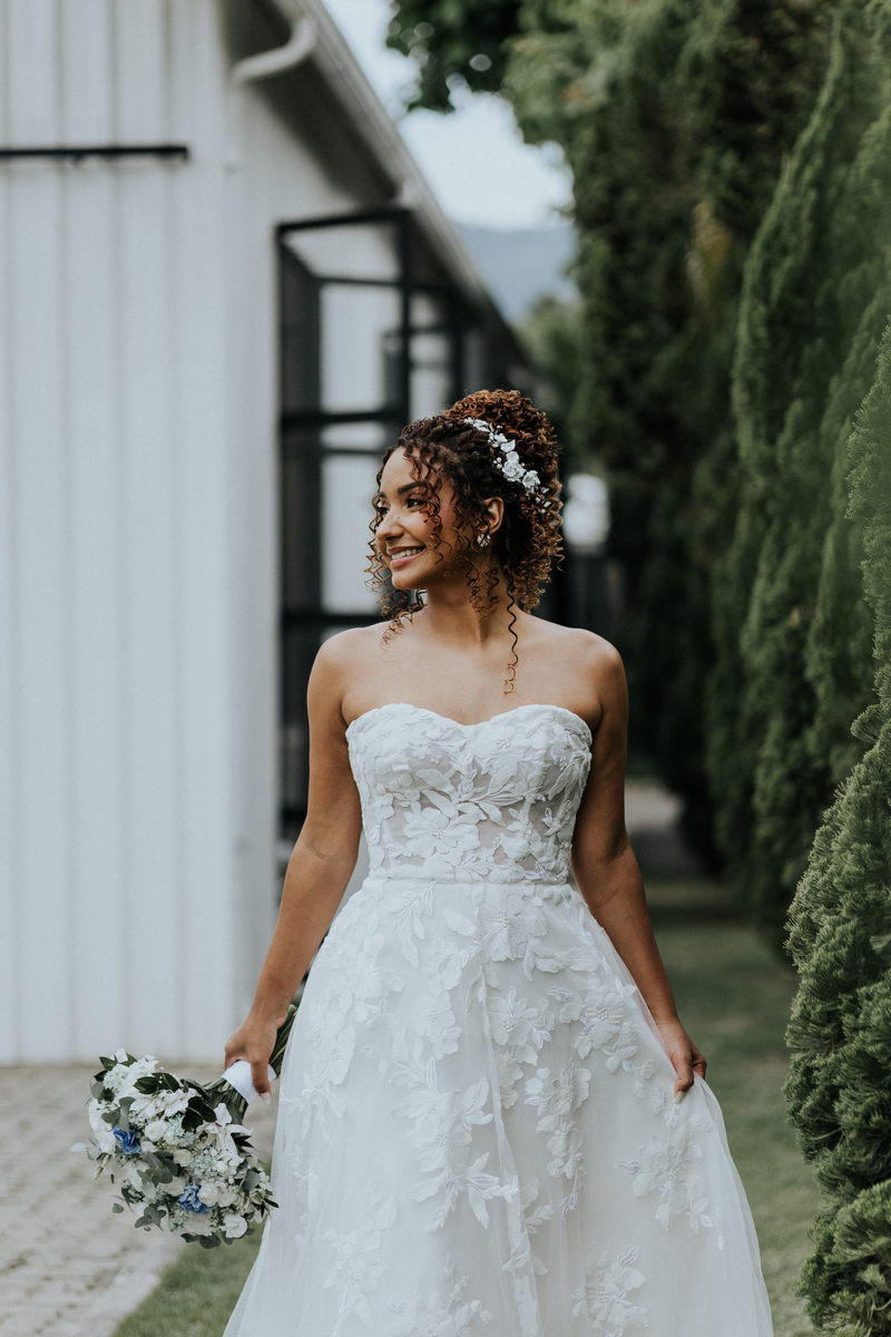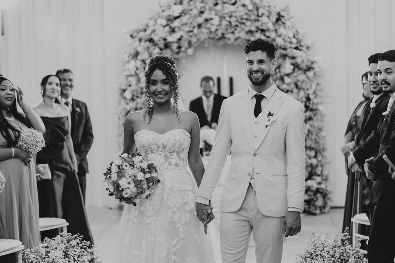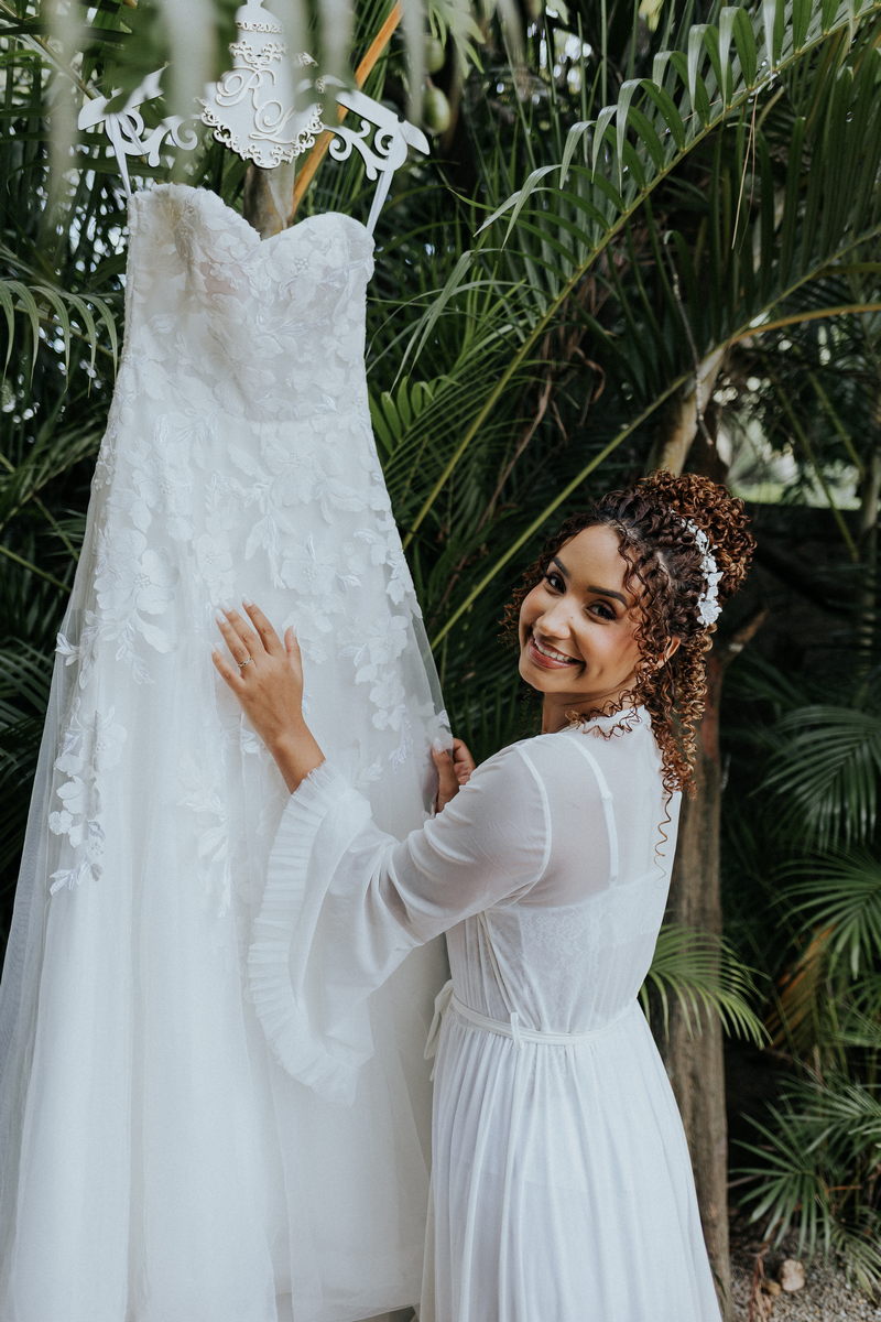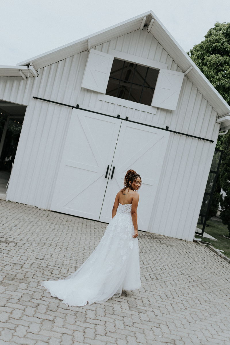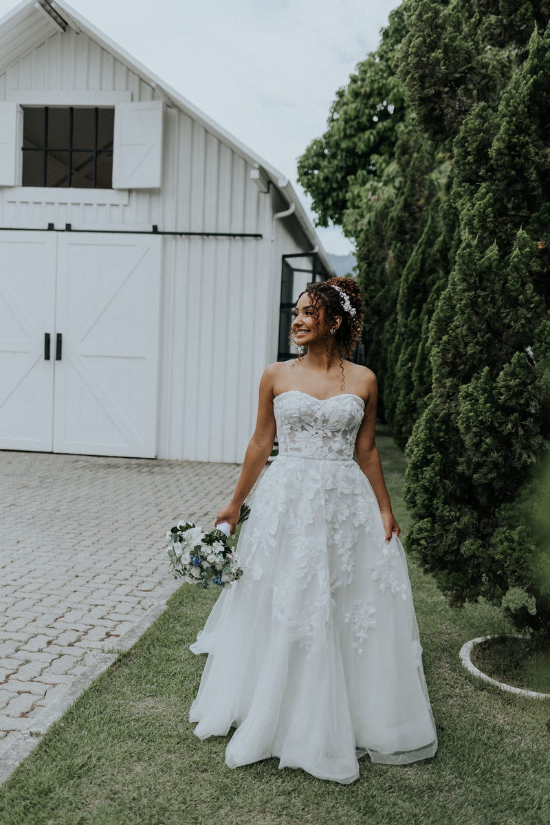 Raquel estava deslumbrante de noiva, e seu sorriso iluminava tudo ao seu redor. Seu vestido de noiva Internovias era um modelo tomara-que-caia, com corpete de renda floral delicada que abraçava o busto com perfeita definição. A silhueta evasê ganhava destaque com a saia fluida de camadas leves, que criava movimento mesmo nos passos mais suaves. As aplicações florais distribuídas pela saia traziam textura e profundidade, enquanto a cintura marcada dava equilíbrio à composição. Nas costas, o caimento mantinha a elegância com naturalidade, deixando o visual coerente e sofisticado em todos os ângulos. Era um vestido que conversava com a personalidade da Raquel: leve, romântico e cheio de presença.