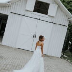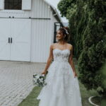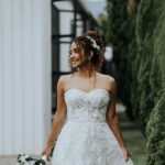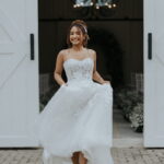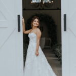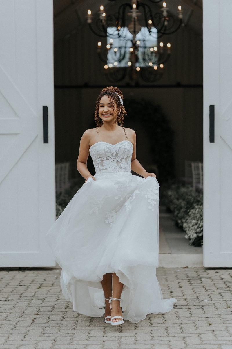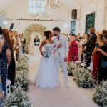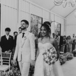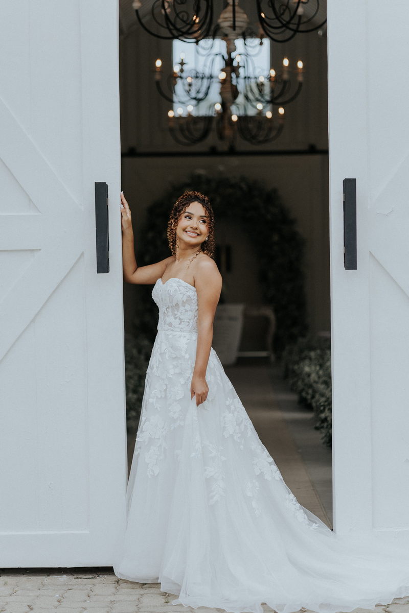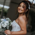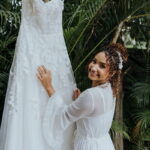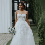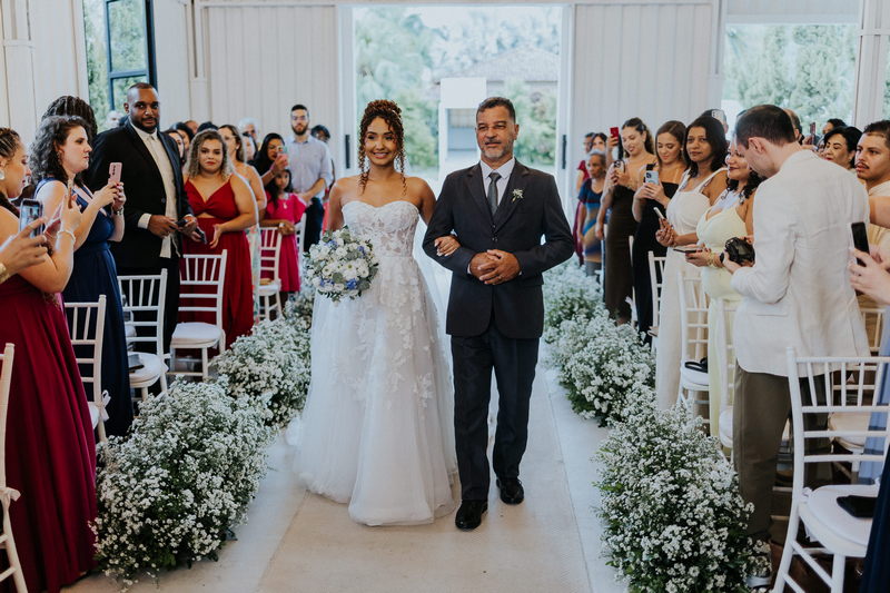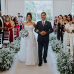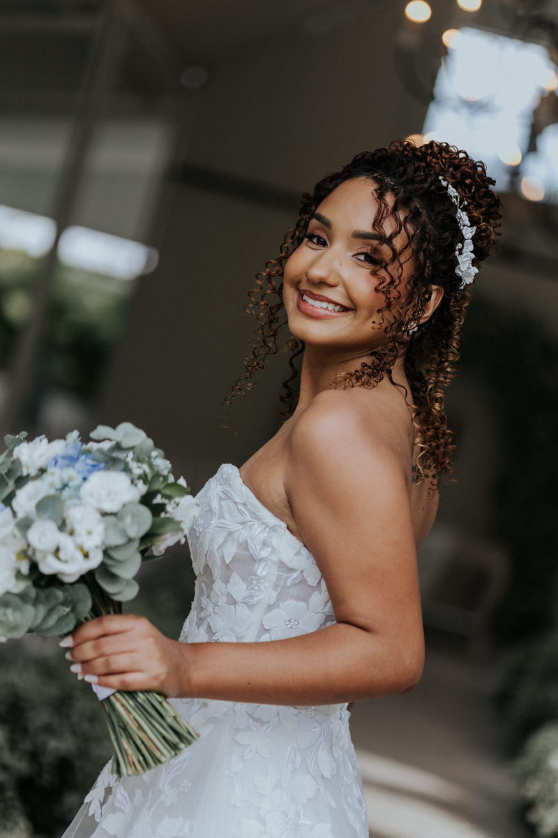 Raquel estava deslumbrante de noiva, e seu sorriso iluminava tudo ao seu redor. Seu vestido de noiva Internovias era um modelo tomara-que-caia, com corpete de renda floral delicada que abraçava o busto com perfeita definição. A silhueta evasê ganhava destaque com a saia fluida de camadas leves, que criava movimento mesmo nos passos mais suaves. As aplicações florais distribuídas pela saia traziam textura e profundidade, enquanto a cintura marcada dava equilíbrio à composição. Nas costas, o caimento mantinha a elegância com naturalidade, deixando o visual coerente e sofisticado em todos os ângulos. Era um vestido que conversava com a personalidade da Raquel: leve, romântico e cheio de presença.
