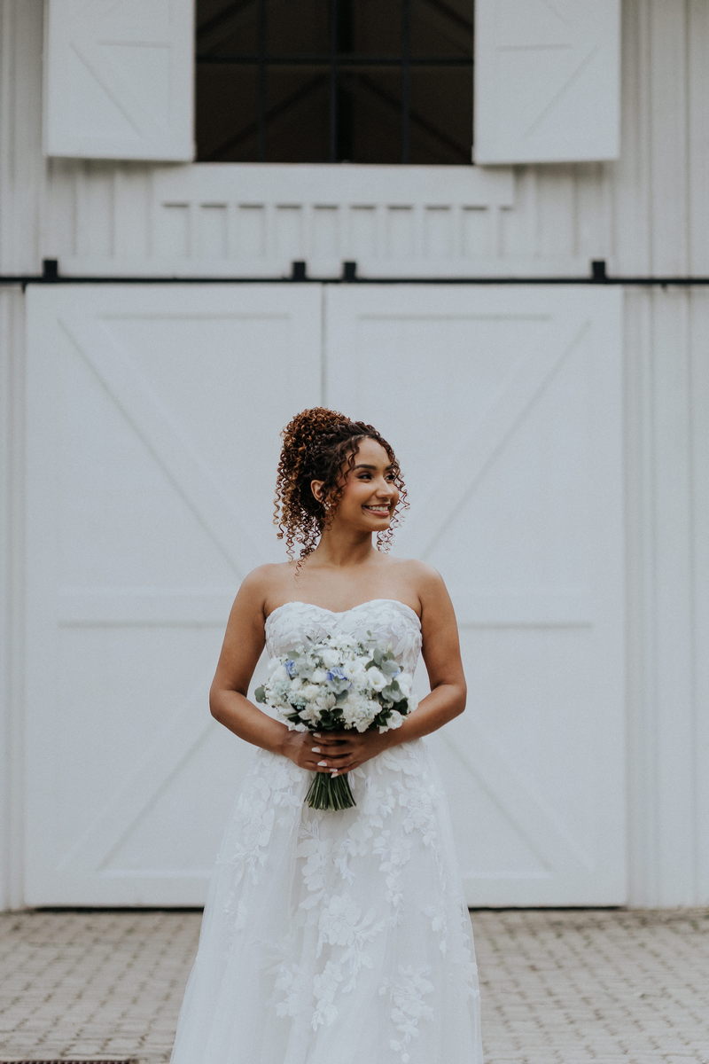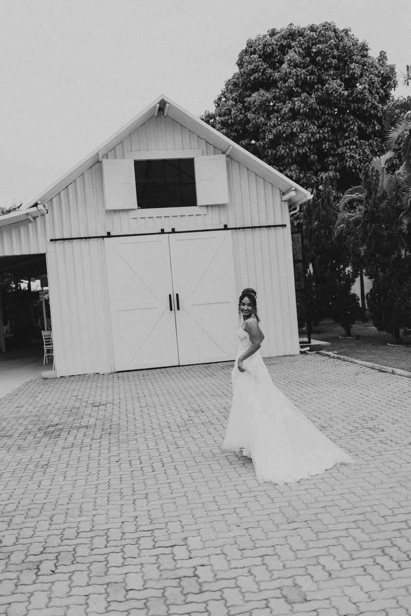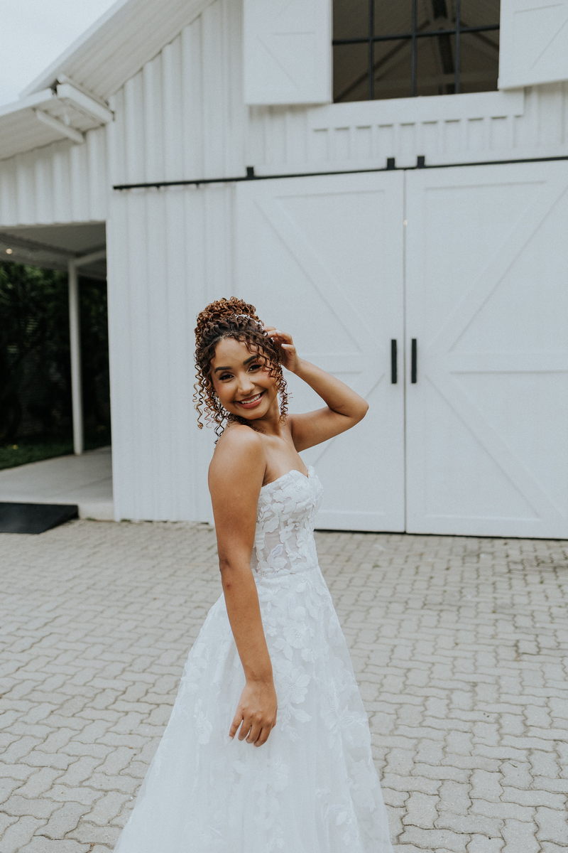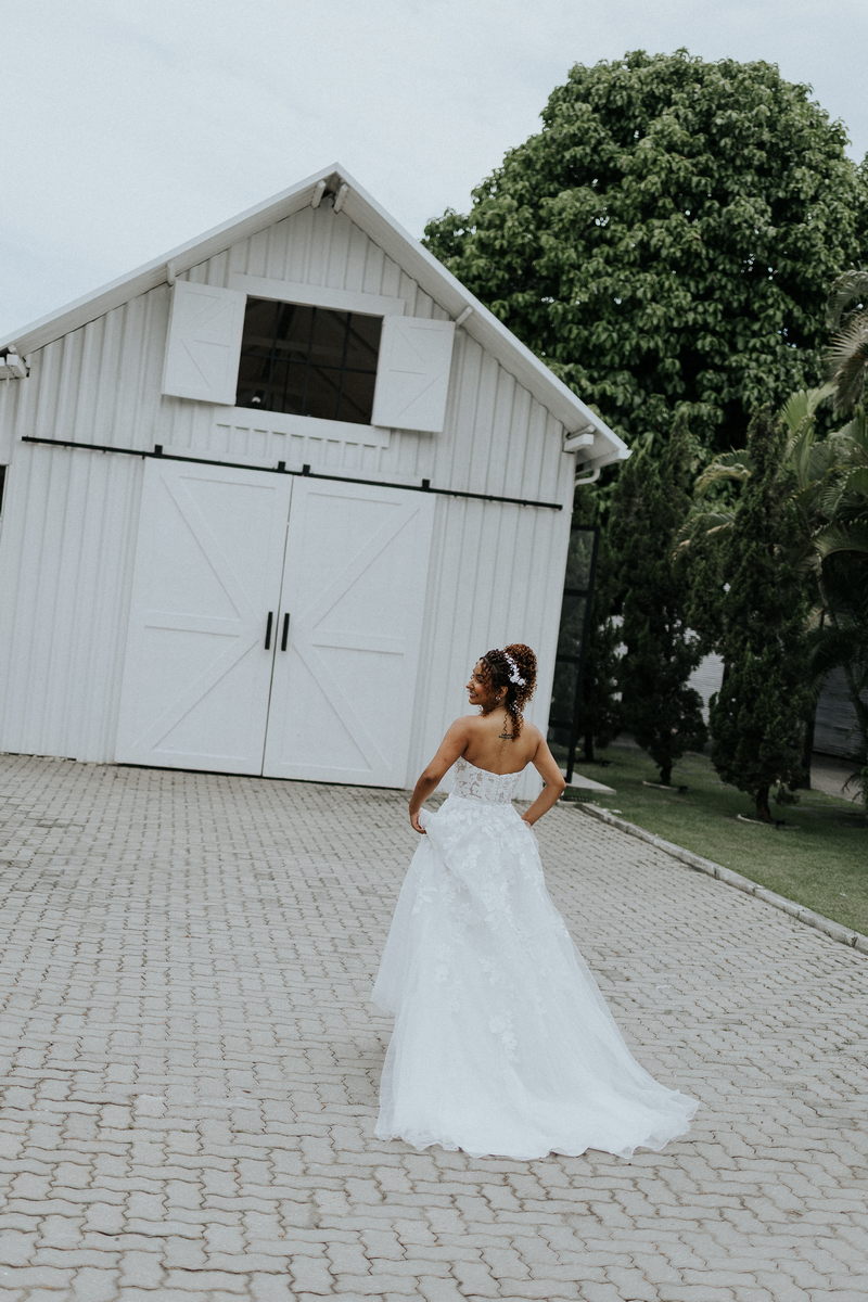 A beleza dela, valorizada pela maquiagem leve da Talita Rodrigues Beauty, realçou seus traços de forma suave e elegante, combinando com o estilo acolhedor do Celeiro Blanc.
