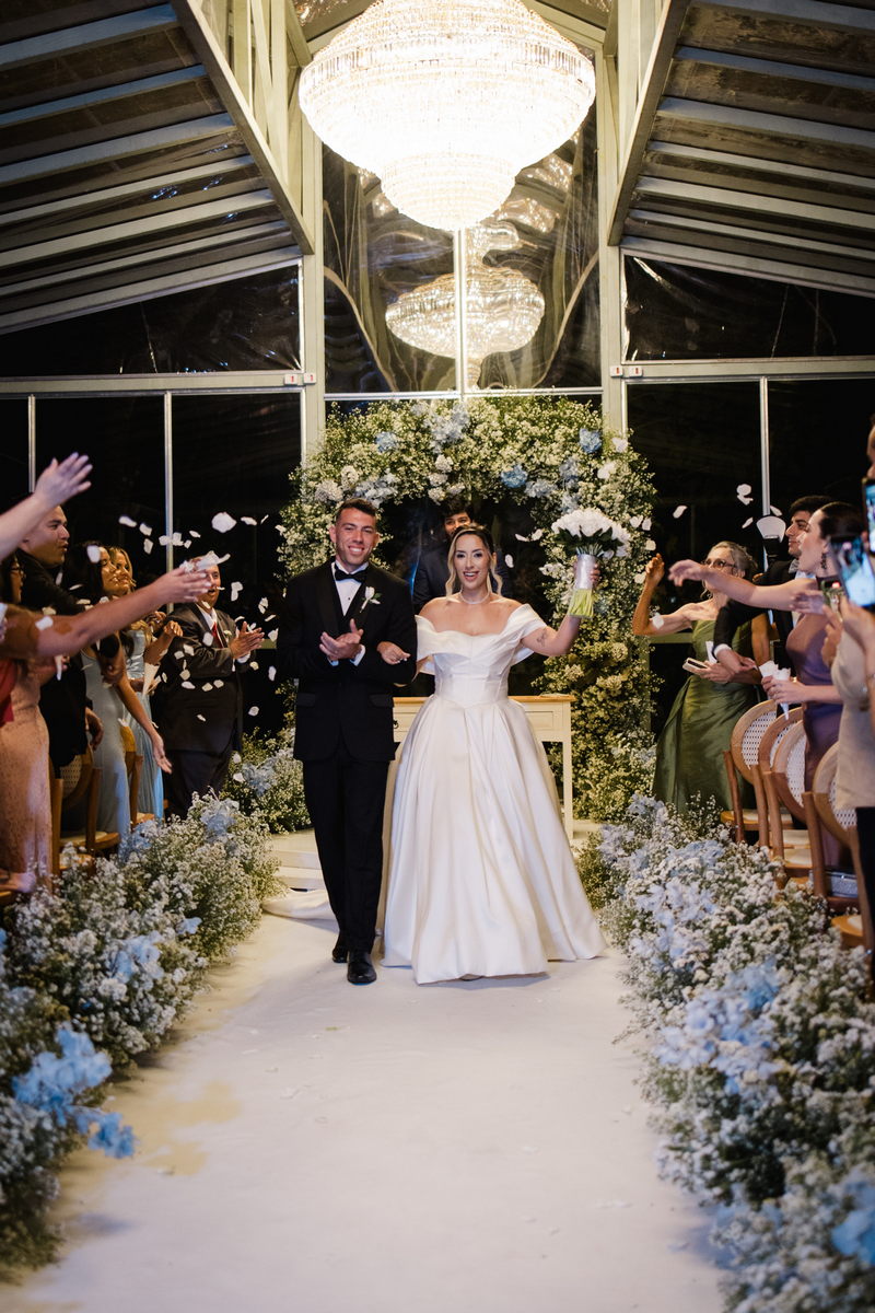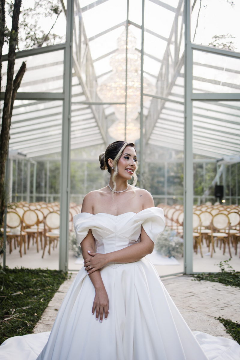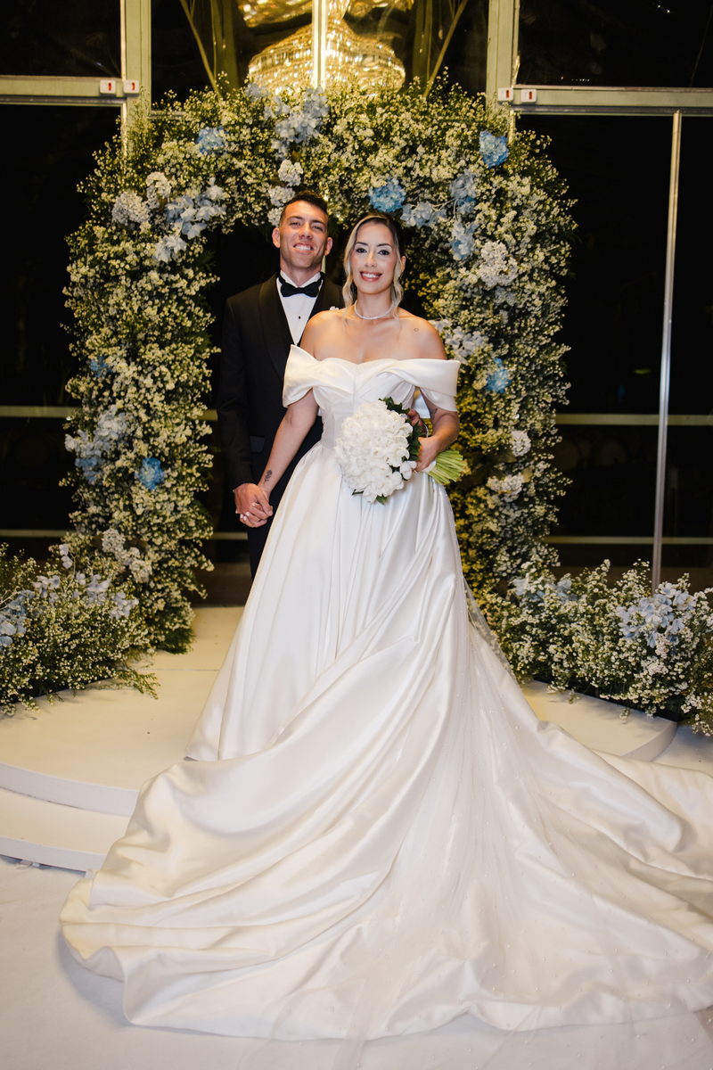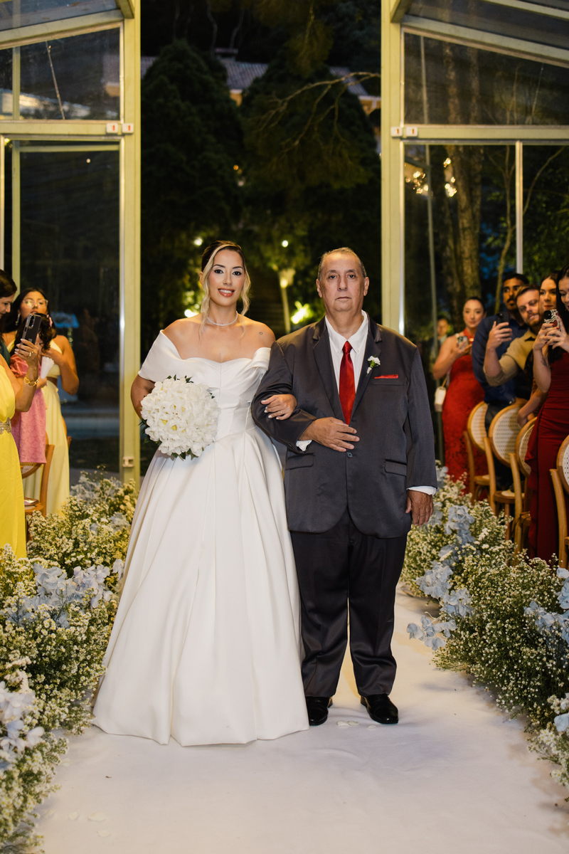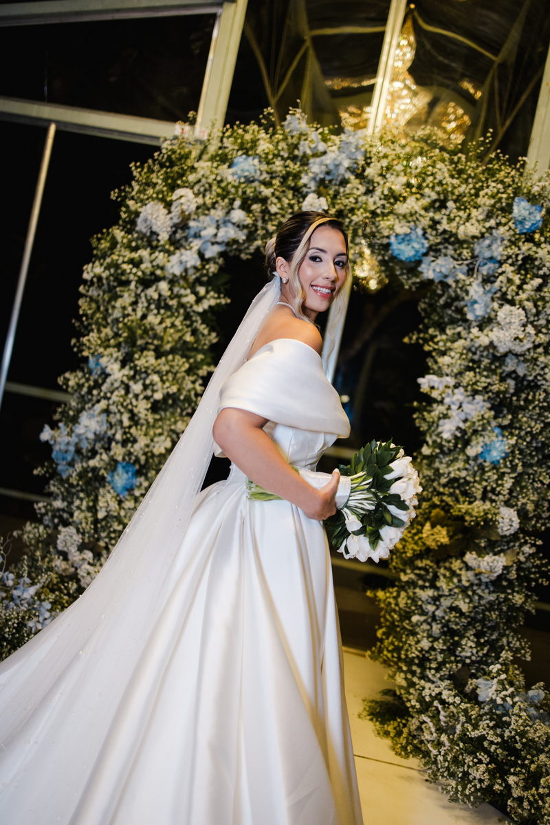 Larissa surgiu radiante em seu vestido de noiva Internovias. O modelo era um espetáculo de equilíbrio entre romantismo e modernidade: um vestido princesa com saia volumosa, tecido acetinado e caimento impecável, que ganhava ainda mais vida sob a iluminação noturna do espaço. O decote ombro a ombro moldava o colo de forma delicada, enquanto o recorte diferenciado no busto trazia modernidade e elegância. A saia ampla, com seu movimento fluido e cauda maravilhosa, trazia um visual memorável sem exageros, destacando cada passo da noiva com sofisticação.