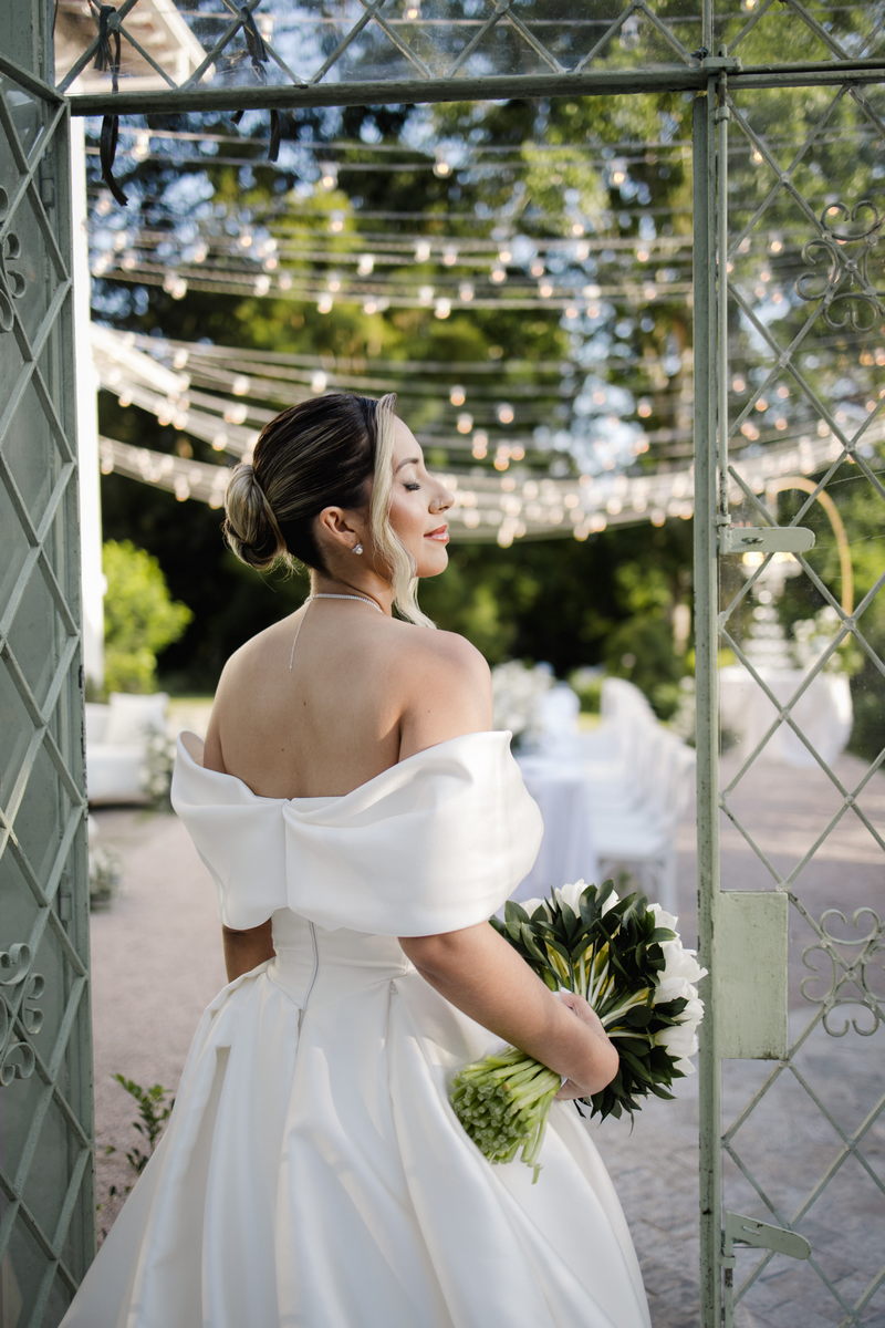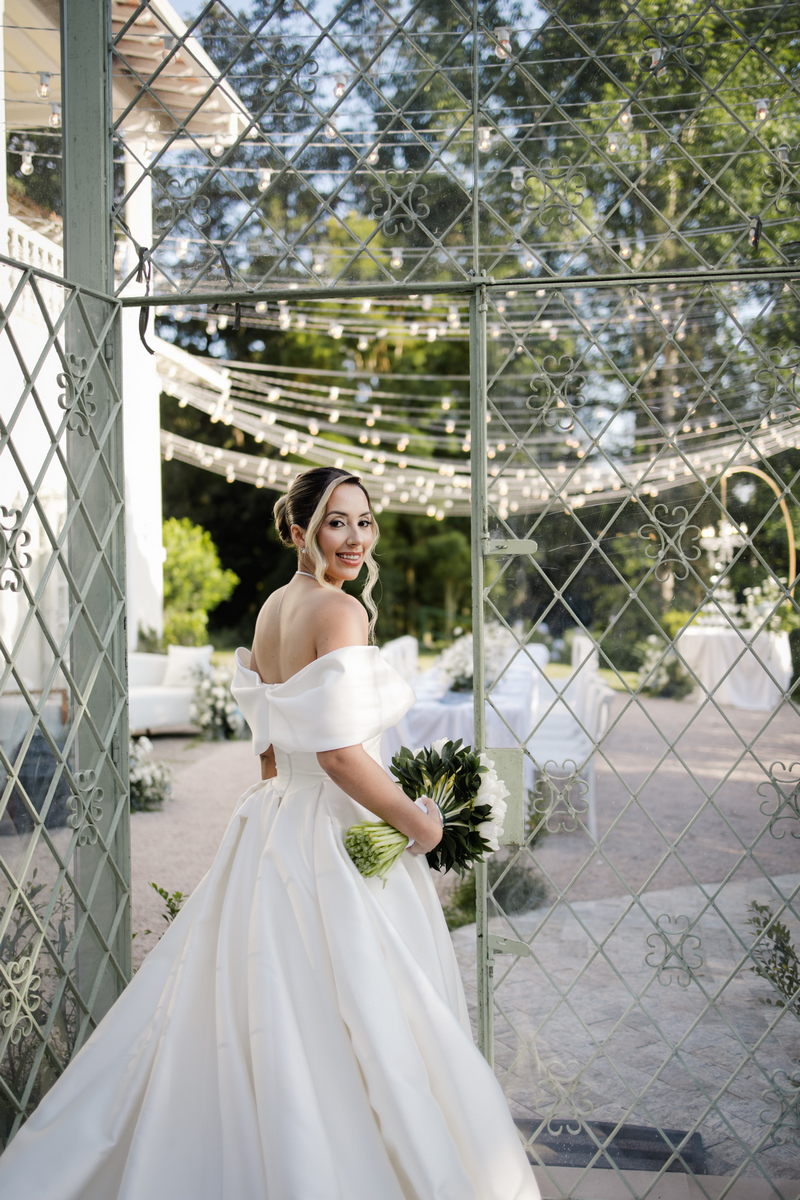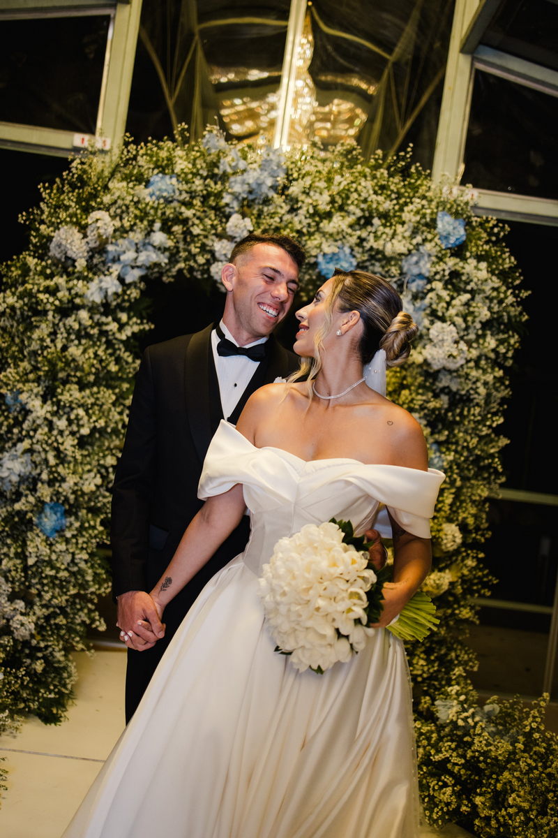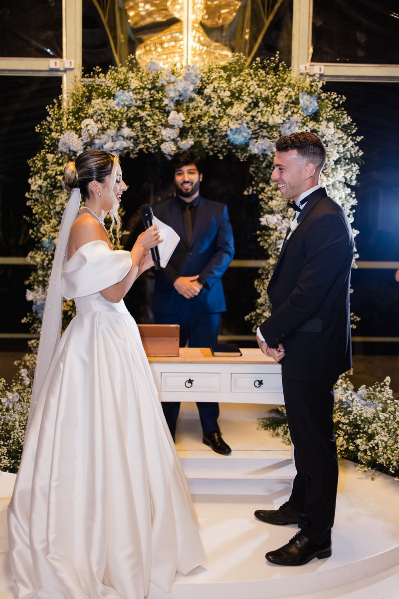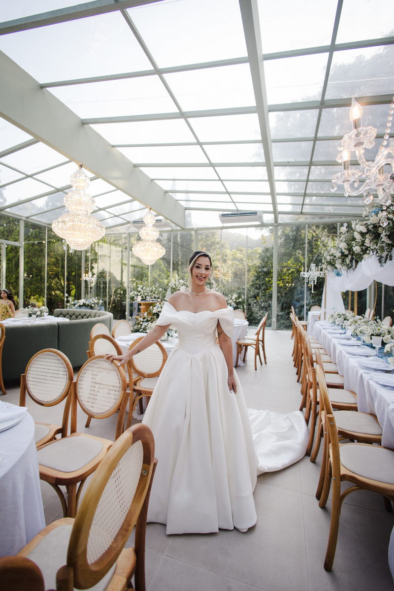 Larissa surgiu radiante em seu vestido de noiva Internovias. O modelo era um espetáculo de equilíbrio entre romantismo e modernidade: um vestido princesa com saia volumosa, tecido acetinado e caimento impecável, que ganhava ainda mais vida sob a iluminação noturna do espaço. O decote ombro a ombro moldava o colo de forma delicada, enquanto o recorte diferenciado no busto trazia modernidade e elegância. A saia ampla, com seu movimento fluido e cauda maravilhosa, trazia um visual memorável sem exageros, destacando cada passo da noiva com sofisticação.