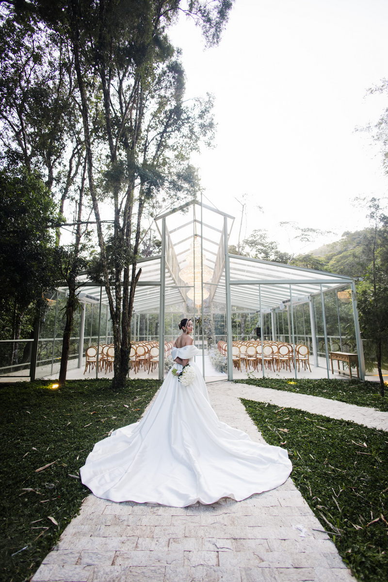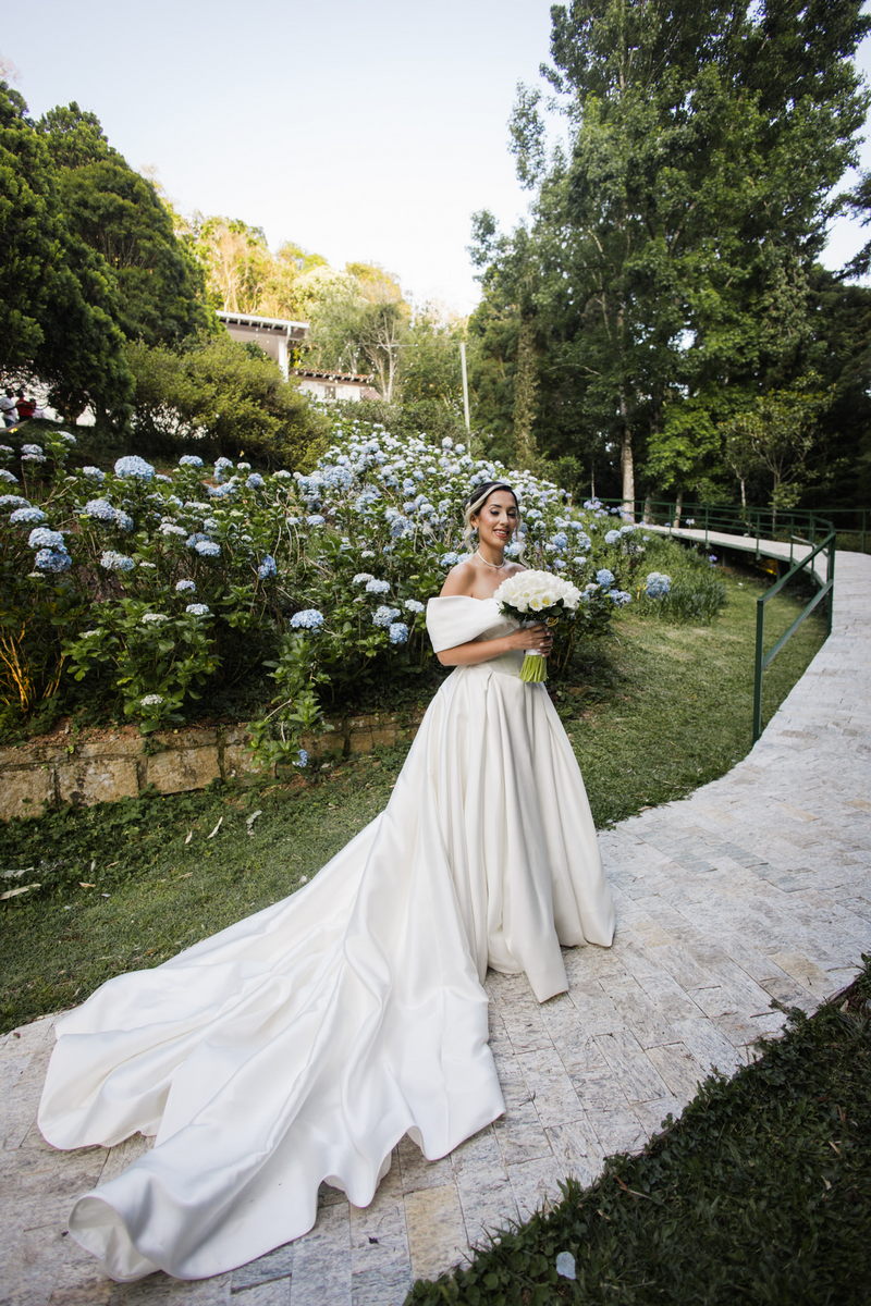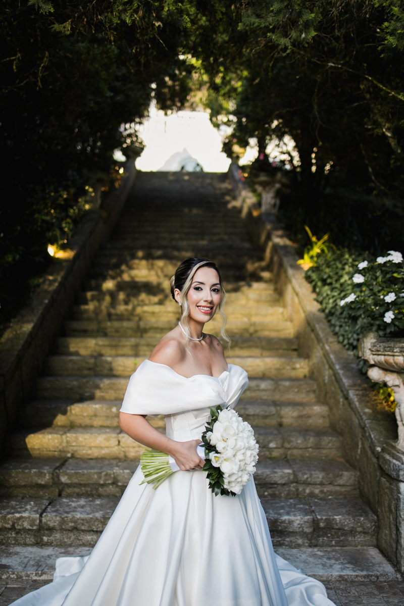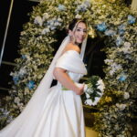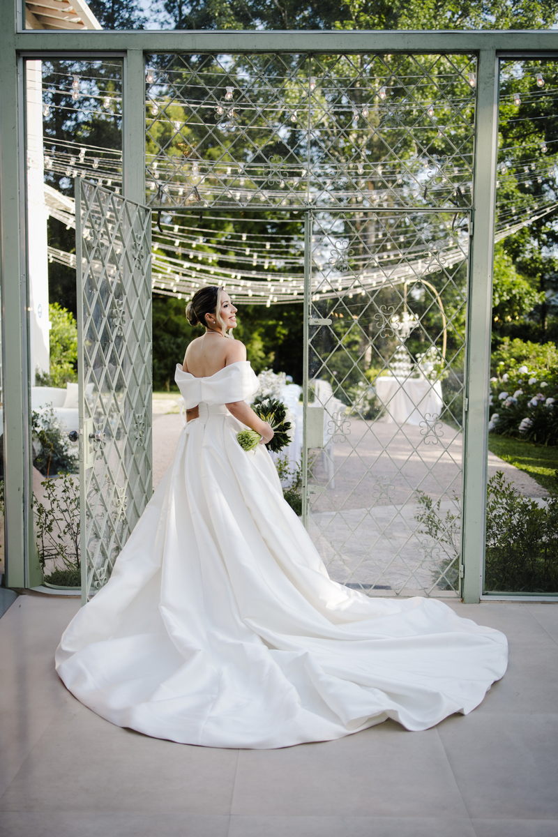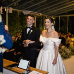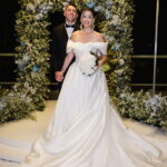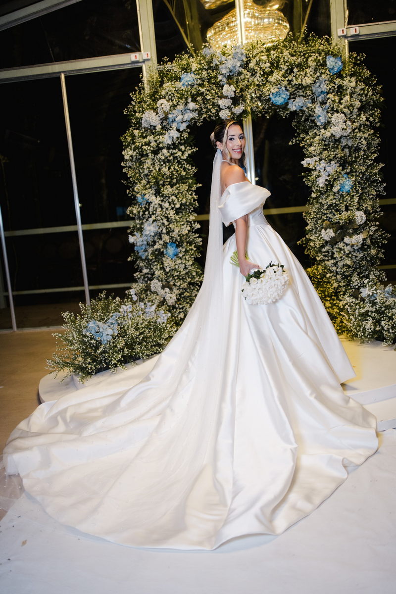 Larissa surgiu radiante em seu vestido de noiva Internovias. O modelo era um espetáculo de equilíbrio entre romantismo e modernidade: um vestido princesa com saia volumosa, tecido acetinado e caimento impecável, que ganhava ainda mais vida sob a iluminação noturna do espaço. O decote ombro a ombro moldava o colo de forma delicada, enquanto o recorte diferenciado no busto trazia modernidade e elegância. A saia ampla, com seu movimento fluido e cauda maravilhosa, trazia um visual memorável sem exageros, destacando cada passo da noiva com sofisticação.