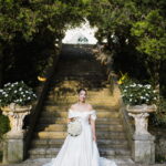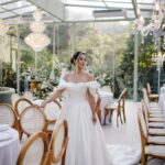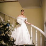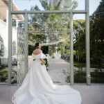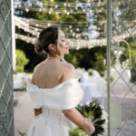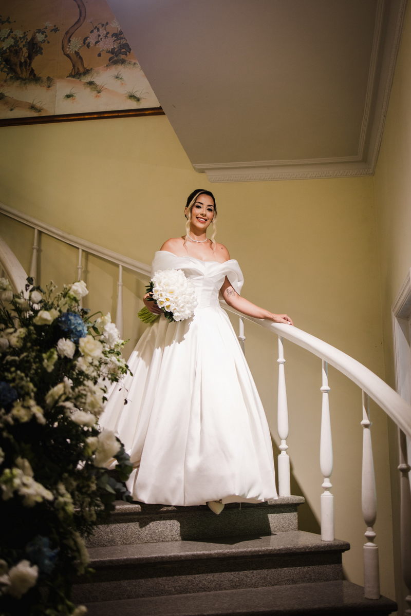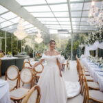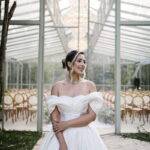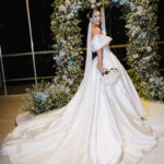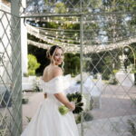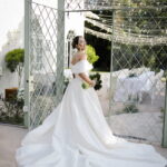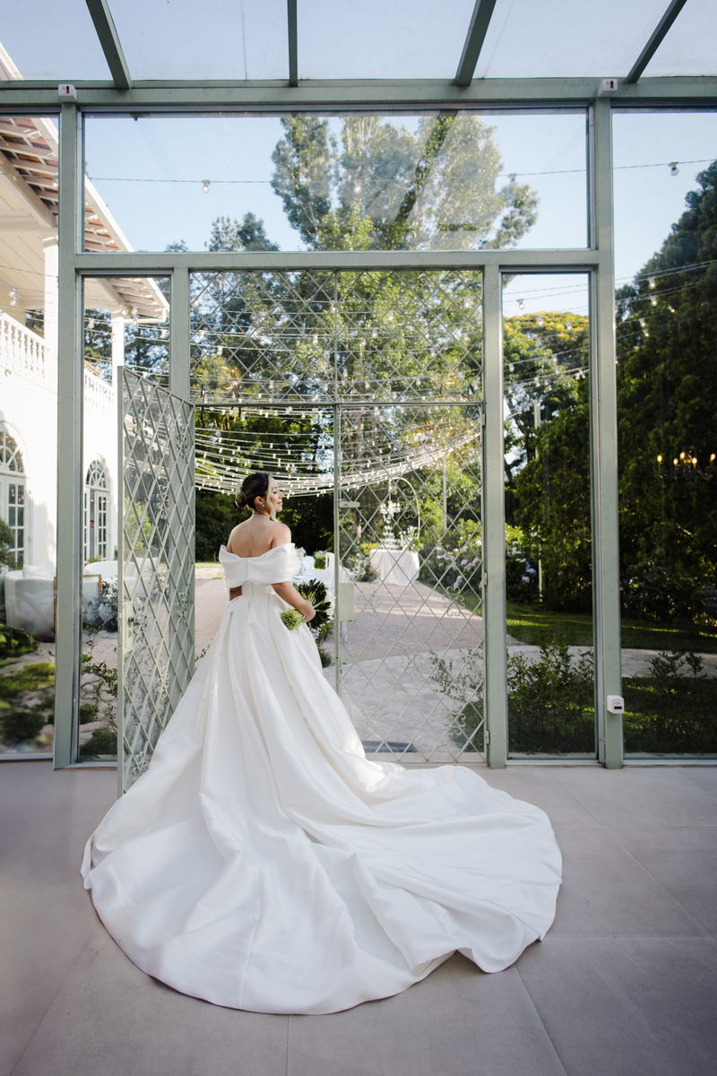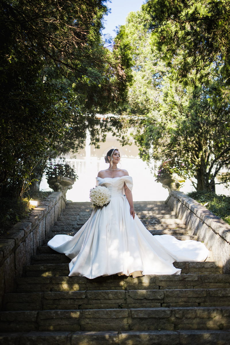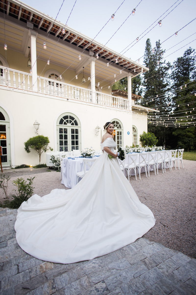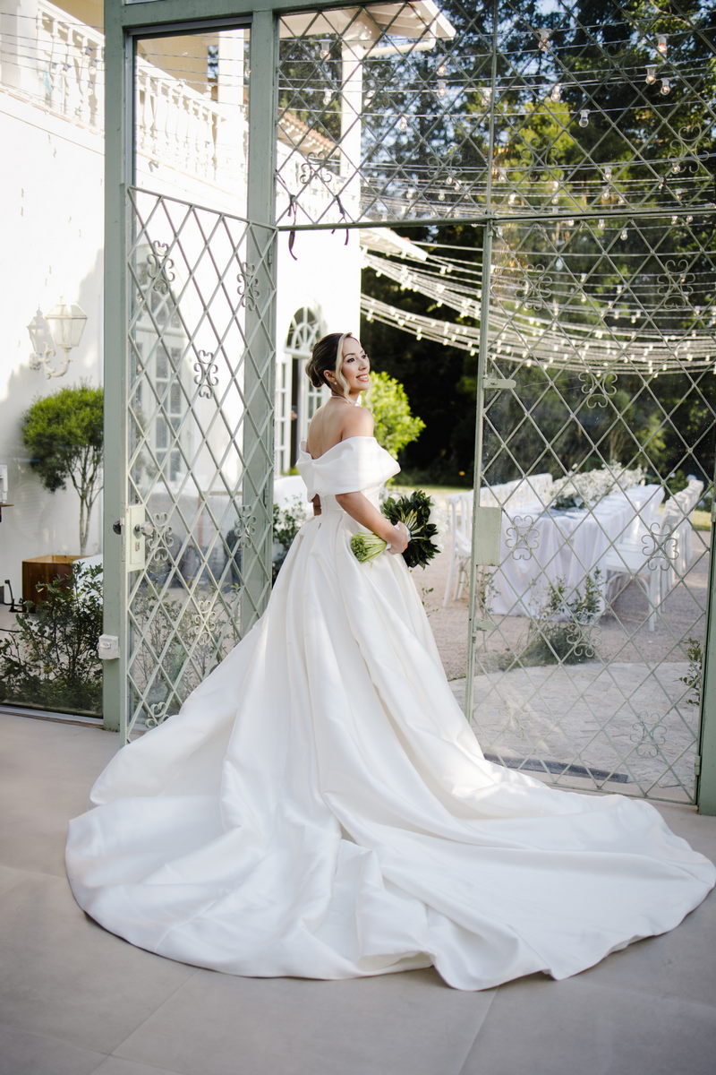 Larissa surgiu radiante em seu vestido de noiva Internovias. O modelo era um espetáculo de equilíbrio entre romantismo e modernidade: um vestido princesa com saia volumosa, tecido acetinado e caimento impecável, que ganhava ainda mais vida sob a iluminação noturna do espaço. O decote ombro a ombro moldava o colo de forma delicada, enquanto o recorte diferenciado no busto trazia modernidade e elegância. A saia ampla, com seu movimento fluido e cauda maravilhosa, trazia um visual memorável sem exageros, destacando cada passo da noiva com sofisticação.