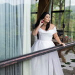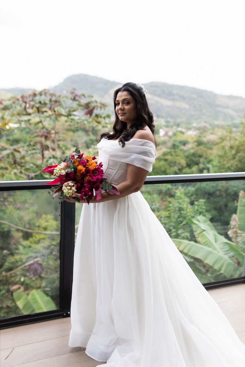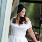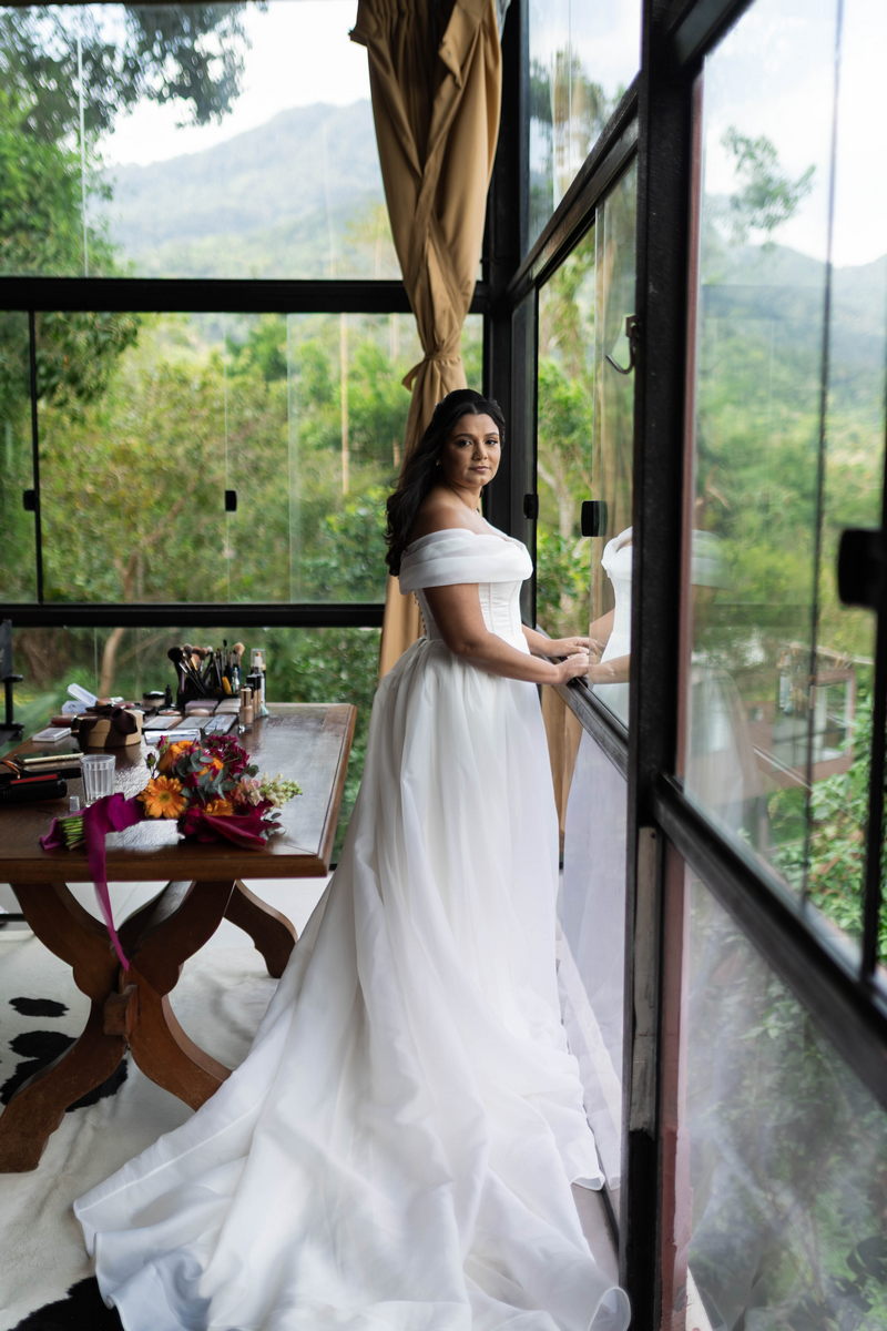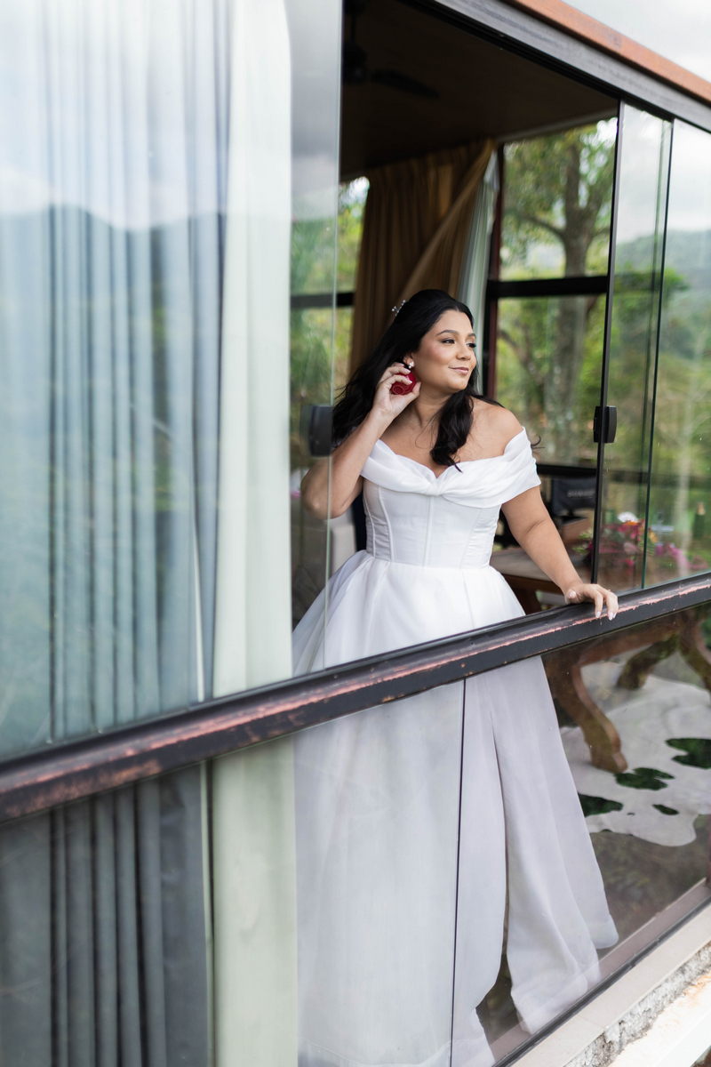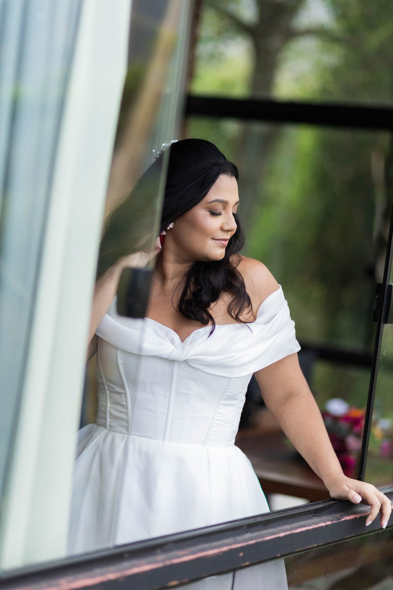 Nathalia estava belíssima de noiva, seu vestido de noiva Internovias valorizou sua beleza de forma equilibrada e sofisticada. A modelagem off-the-shoulder deixou os ombros em evidência com delicadeza, enquanto o decote em formato de coração trouxe suavidade ao busto. O corpete estruturado desenhou a silhueta com precisão, criando um contraste harmônico com a saia volumosa e fluida. O tecido, de alta qualidade e com acabamento impecável, conferia um efeito clássico, atemporal e romântico. A cauda ampla completava o conjunto com presença, resultando em um look inesquecível.