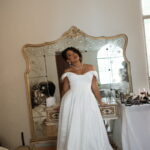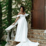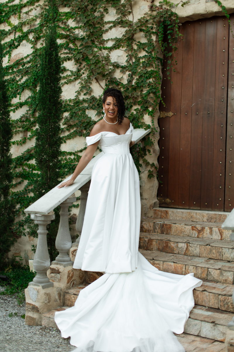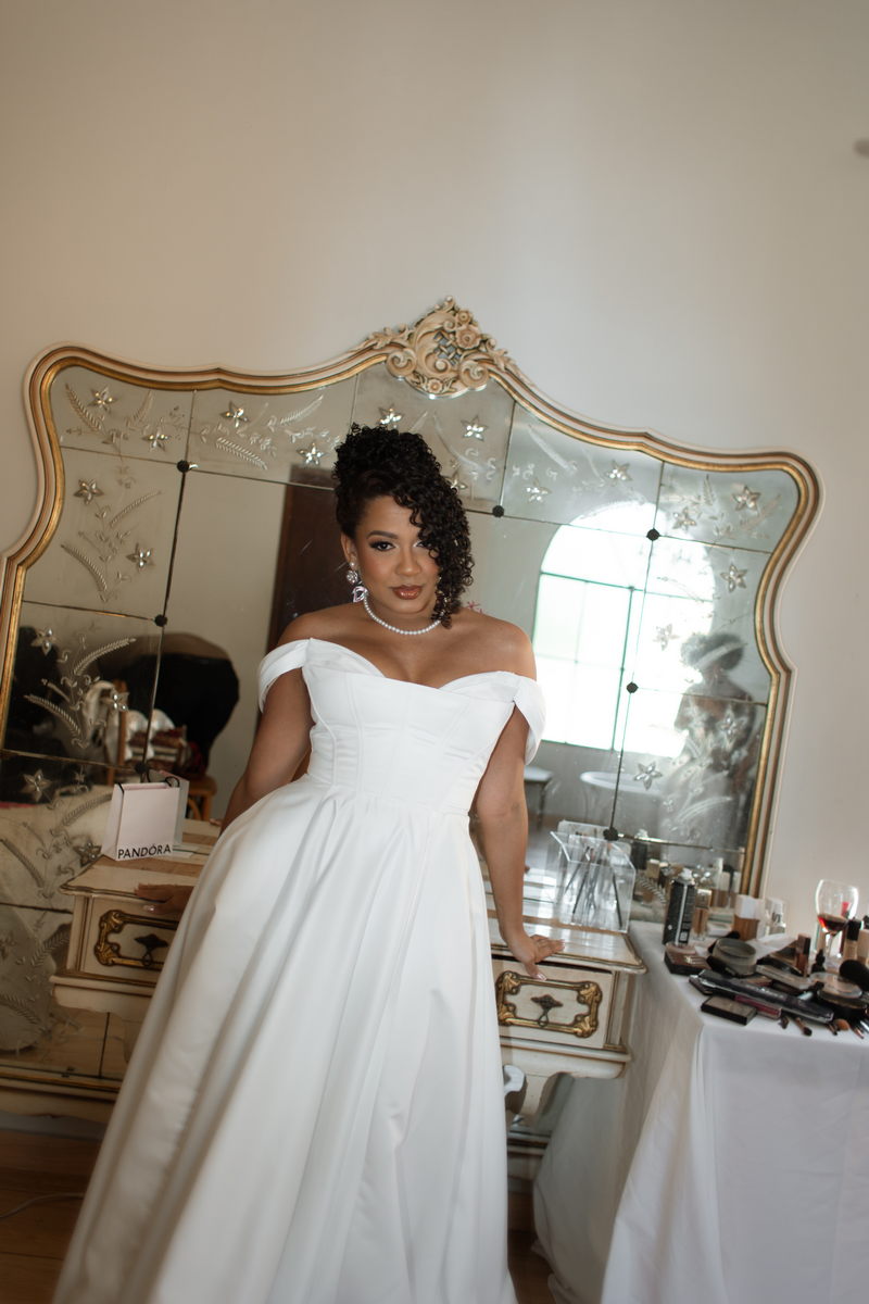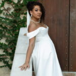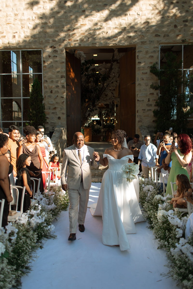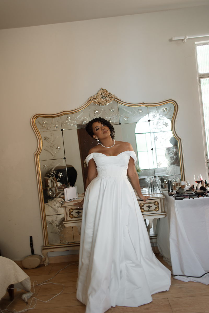 Raquel estava deslumbrante de noiva, e o seu vestido de noiva Internovias exaltou ainda mais sua beleza. Nas fotos, vemos uma modelagem clássica e imponente, com corpo estruturado em decote ombro a ombro, criando linhas elegantes que valorizam o colo. O brilho suave trazia aquele efeito limpo e sofisticado, realçado pelo caimento impecável do corpete. A saia ampla e volumosa na medida certa, descia com fluidez e naturalidade, ganhando vida com a cauda longa que acompanha cada movimento da noiva.