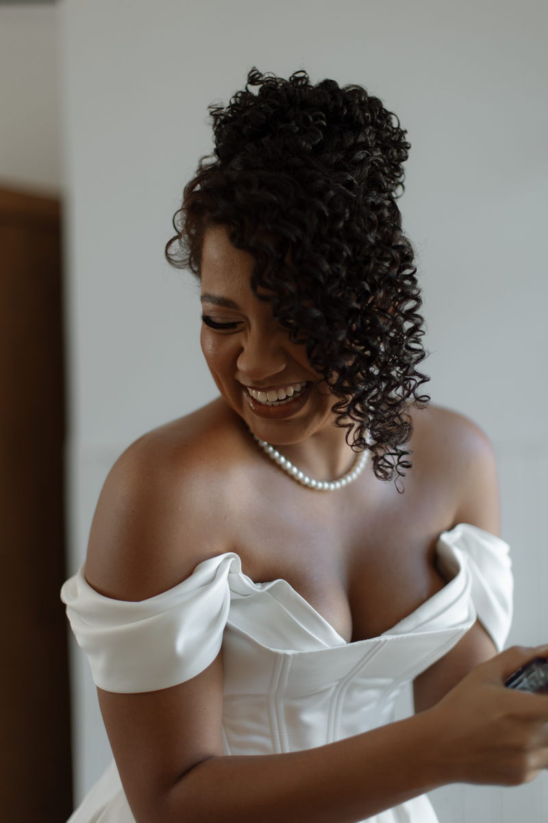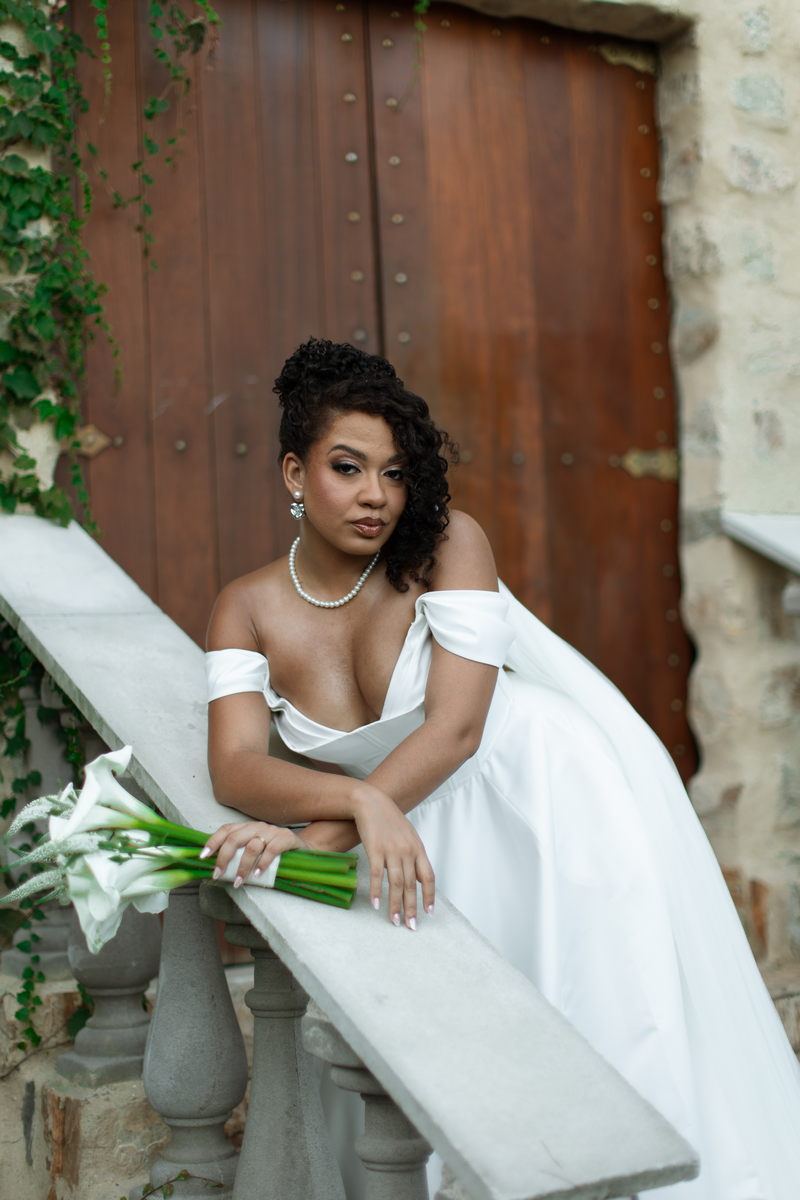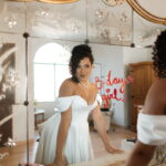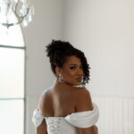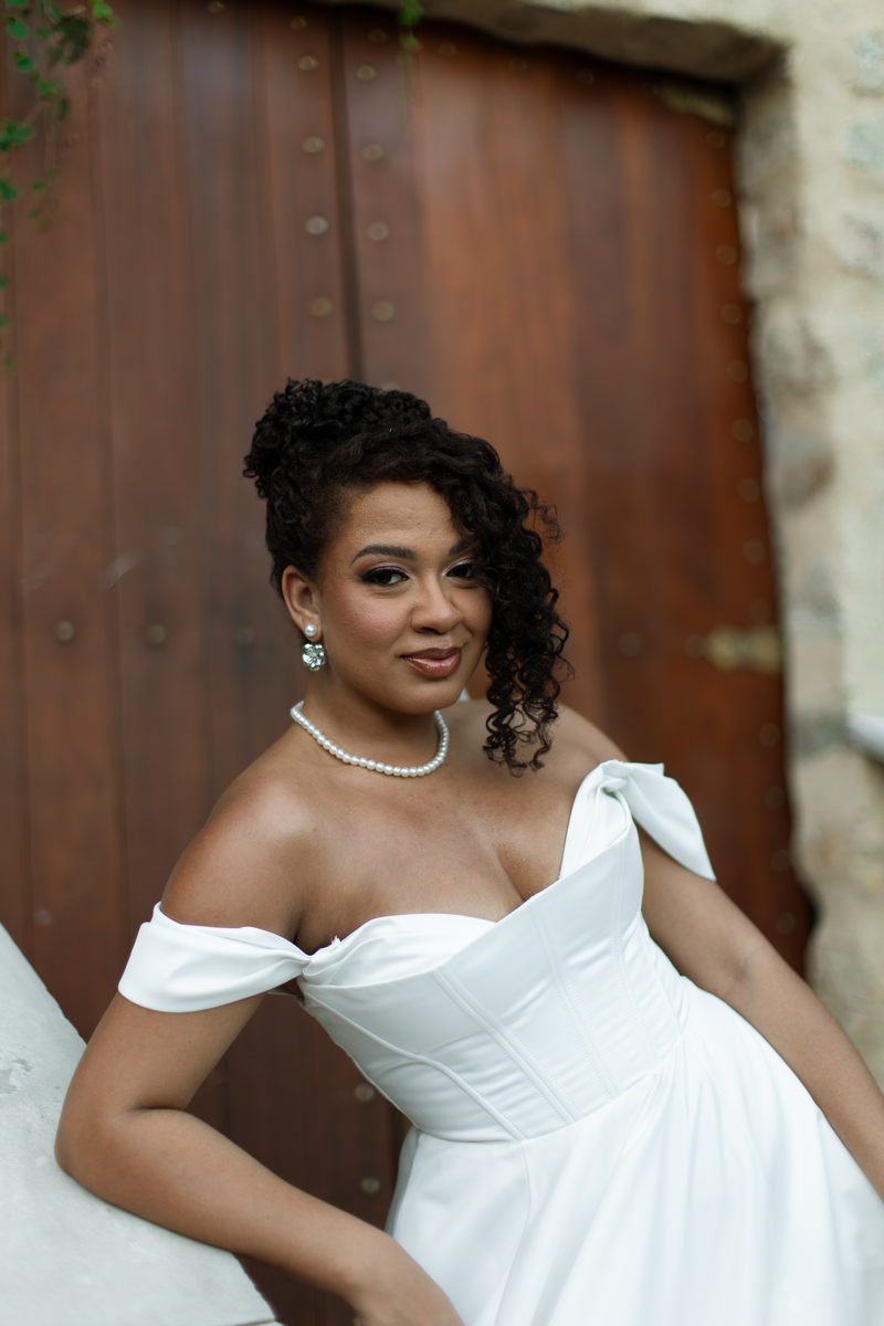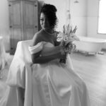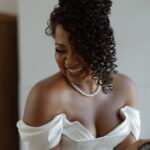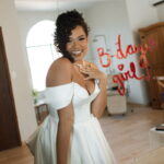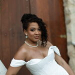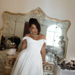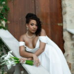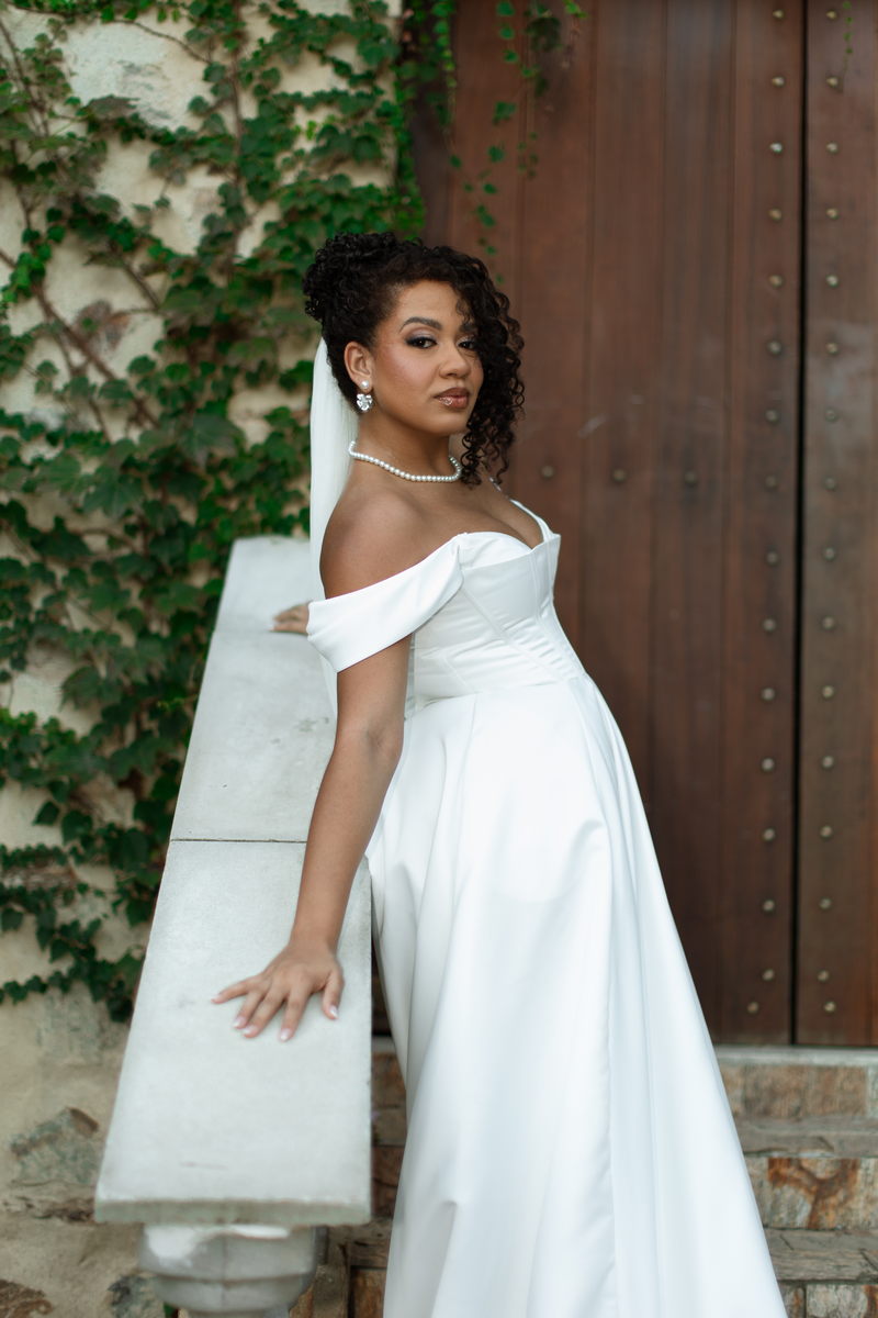 Raquel estava deslumbrante de noiva, e o seu vestido de noiva Internovias exaltou ainda mais sua beleza. Nas fotos, vemos uma modelagem clássica e imponente, com corpo estruturado em decote ombro a ombro, criando linhas elegantes que valorizam o colo. O brilho suave trazia aquele efeito limpo e sofisticado, realçado pelo caimento impecável do corpete. A saia ampla e volumosa na medida certa, descia com fluidez e naturalidade, ganhando vida com a cauda longa que acompanha cada movimento da noiva.