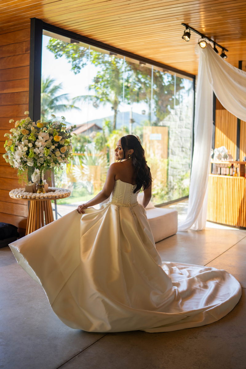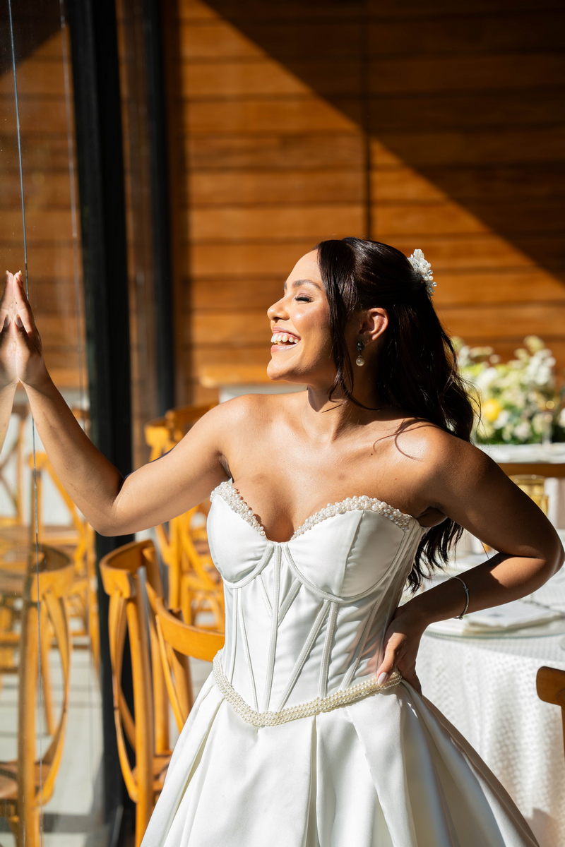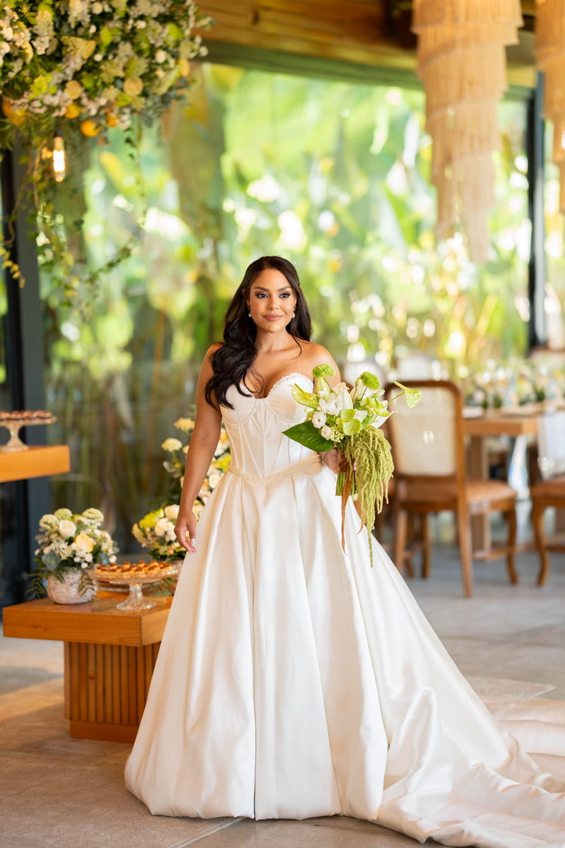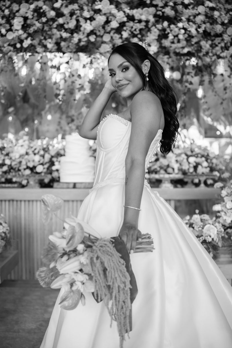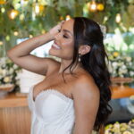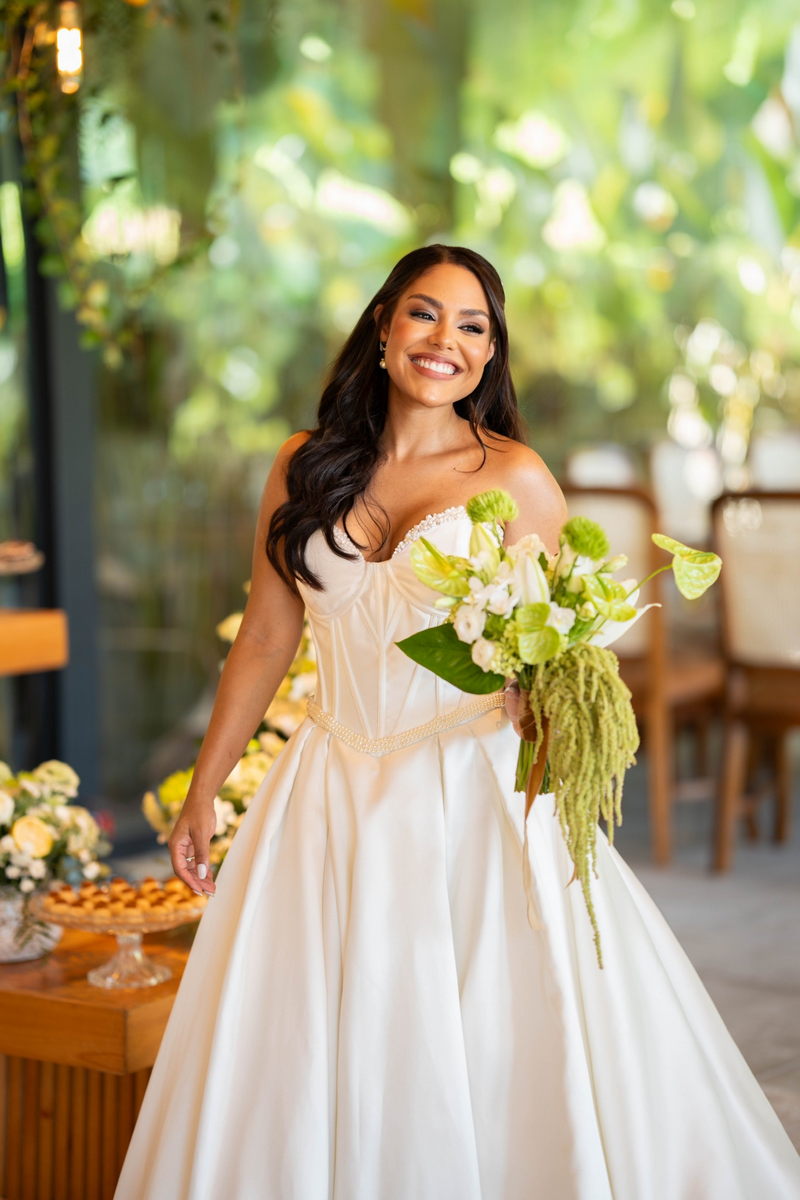 Joyce estava belíssima de noiva, seu vestido de noiva Internovias valorizou seu estilo de forma impecável. O modelo tomara que caia trazia um decote coração estruturado, com acabamento em pérolas tanto no contorno do busto quanto no cinto delicado que marcava suavemente a cintura. A modelagem princesa, com saia ampla e caimento firme, criou um visual clássico, elegante e cheio de presença.