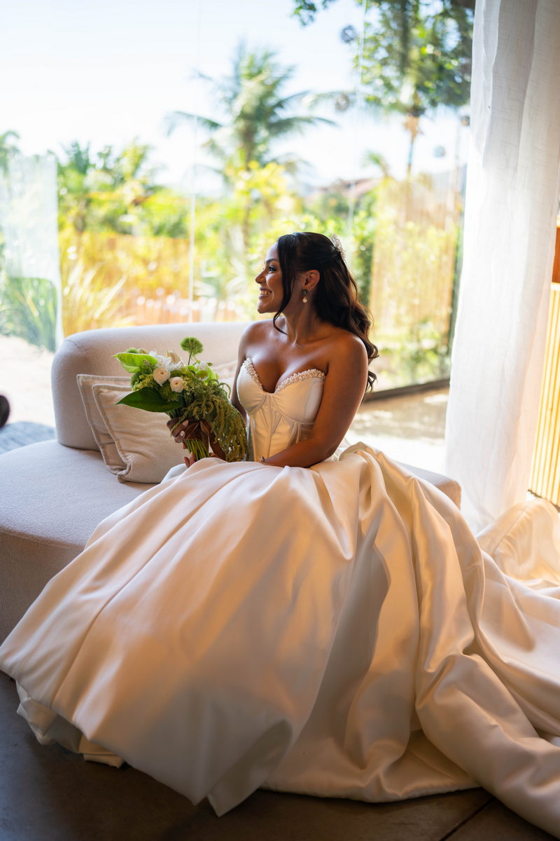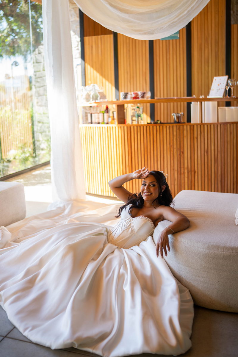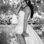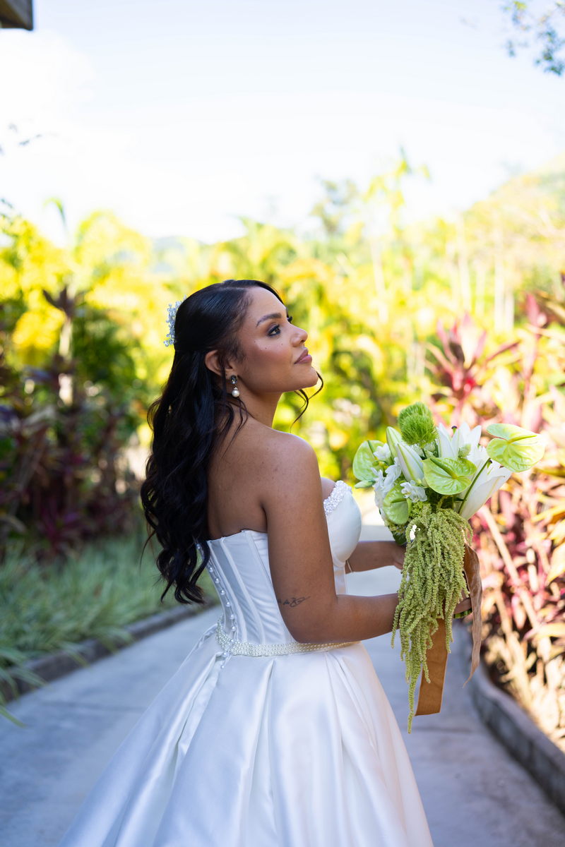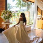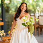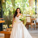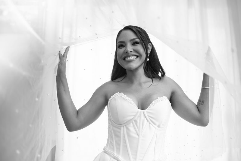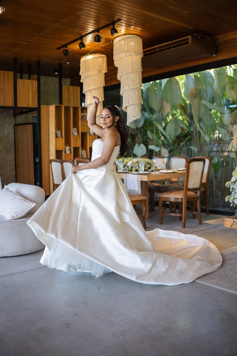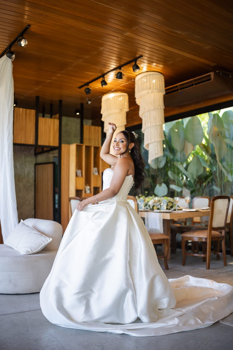 Joyce estava belíssima de noiva, seu vestido de noiva Internovias valorizou seu estilo de forma impecável. O modelo tomara que caia trazia um decote coração estruturado, com acabamento em pérolas tanto no contorno do busto quanto no cinto delicado que marcava suavemente a cintura. A modelagem princesa, com saia ampla e caimento firme, criou um visual clássico, elegante e cheio de presença.