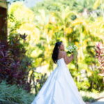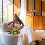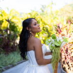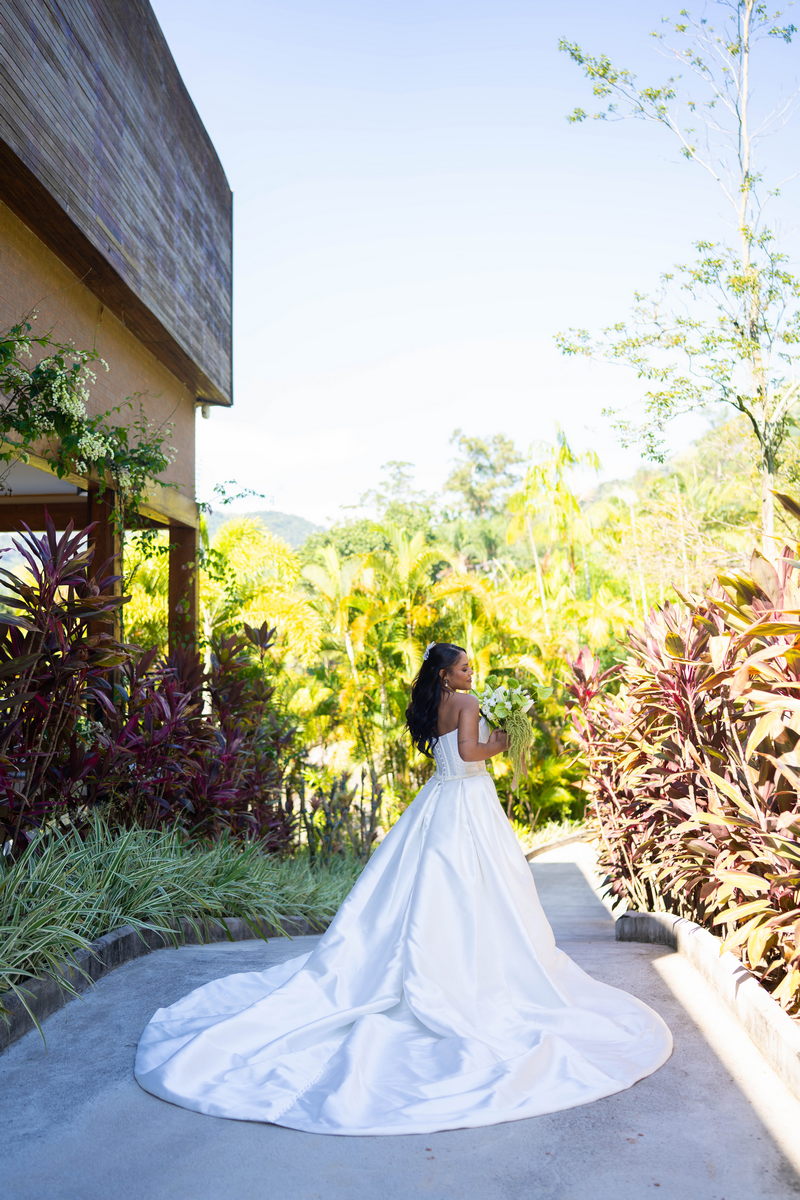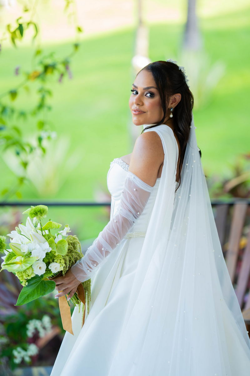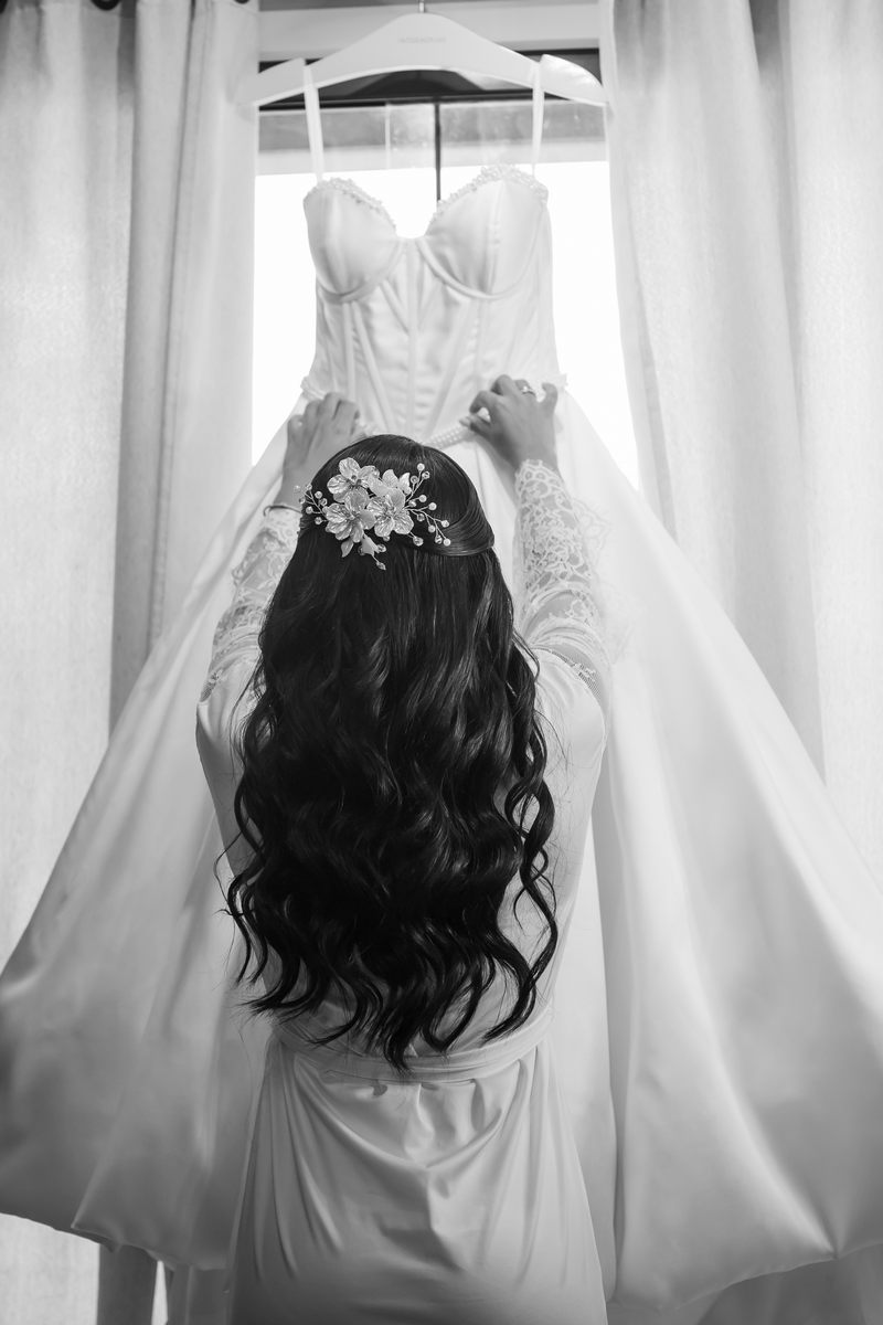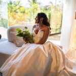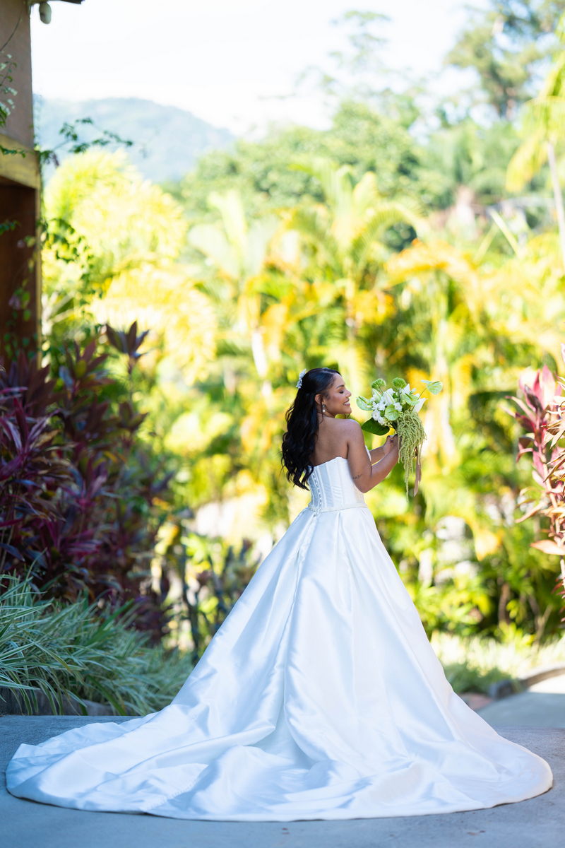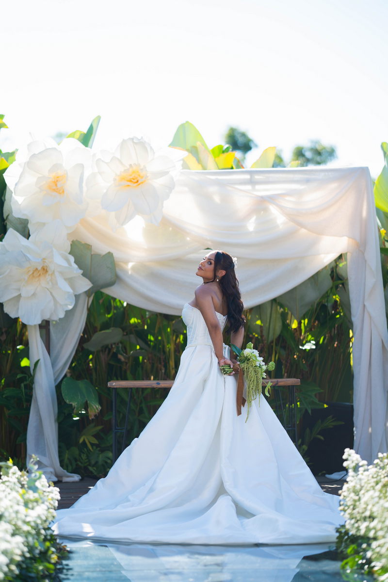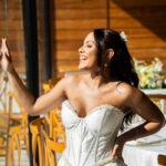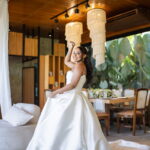 Joyce estava belíssima de noiva, seu vestido de noiva Internovias valorizou seu estilo de forma impecável. O modelo tomara que caia trazia um decote coração estruturado, com acabamento em pérolas tanto no contorno do busto quanto no cinto delicado que marcava suavemente a cintura. A modelagem princesa, com saia ampla e caimento firme, criou um visual clássico, elegante e cheio de presença.