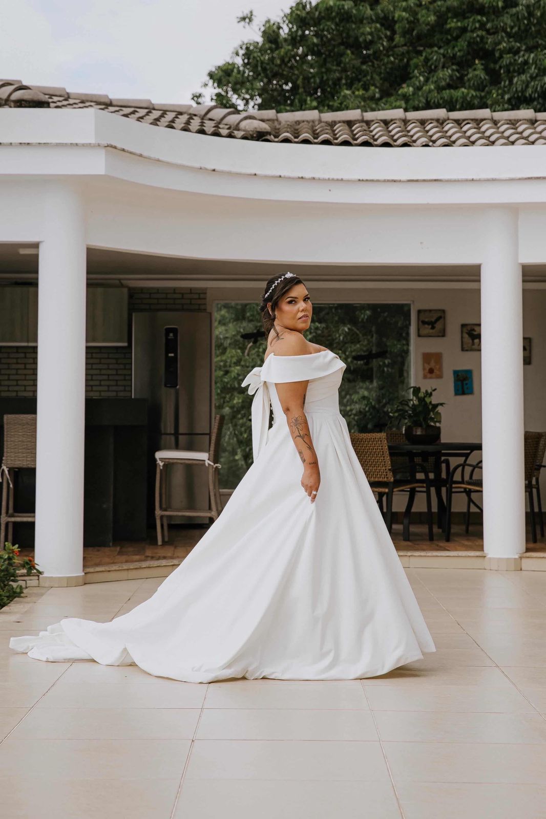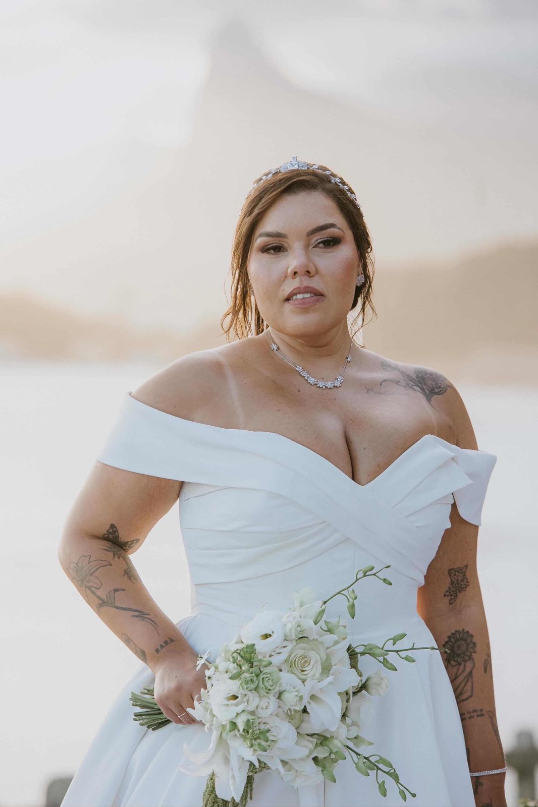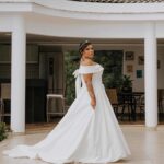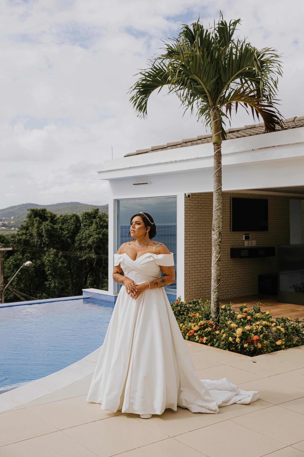 Isabelle surgiu belíssima de noiva, seu vestido de noiva Internovias trouxe a combinação impecável da elegância com a delicadeza. A modelagem ombro a ombro valorizava o colo, enquanto o decote em formato coração diferenciado criava equilíbrio entre feminilidade e sofisticação. A saia ampla e o volume generoso projetavam uma silhueta clássica, com aquele movimento bonito que se abre naturalmente enquanto a noiva caminha. Amamos todos os detalhes do look!