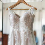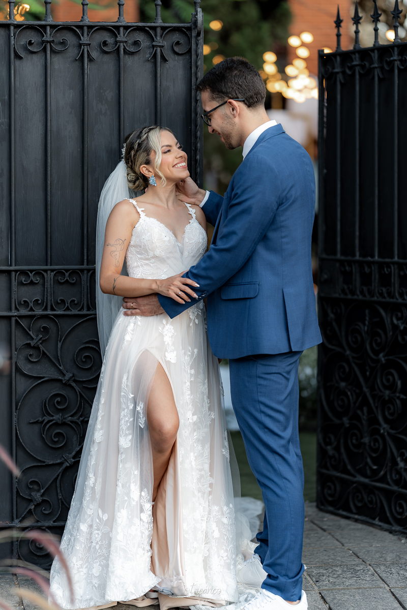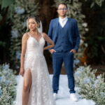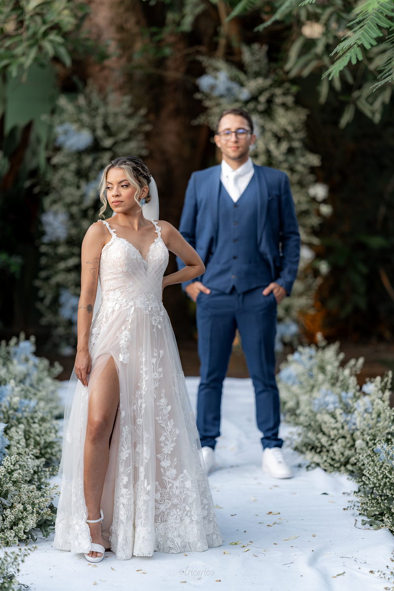 Amanda estava belíssima em seu vestido de noiva Internovias. O modelo tinha leitura romântica moderna: alças finas, decote profundo e uma saia de tule leve que criava movimento suave a cada passo. As aplicações de renda floral, distribuídas de forma equilibrada desde o corpo até a saia, traziam textura e profundidade sem exageros. A cauda, ampla e fluida, ganhava destaque nas cenas ao ar livre. Já o decote nas costas diferenciado e a fenda lateral, deixavam o modelo ainda mais romântico.
