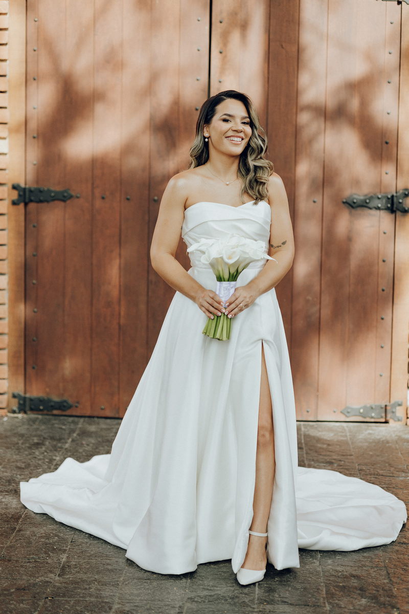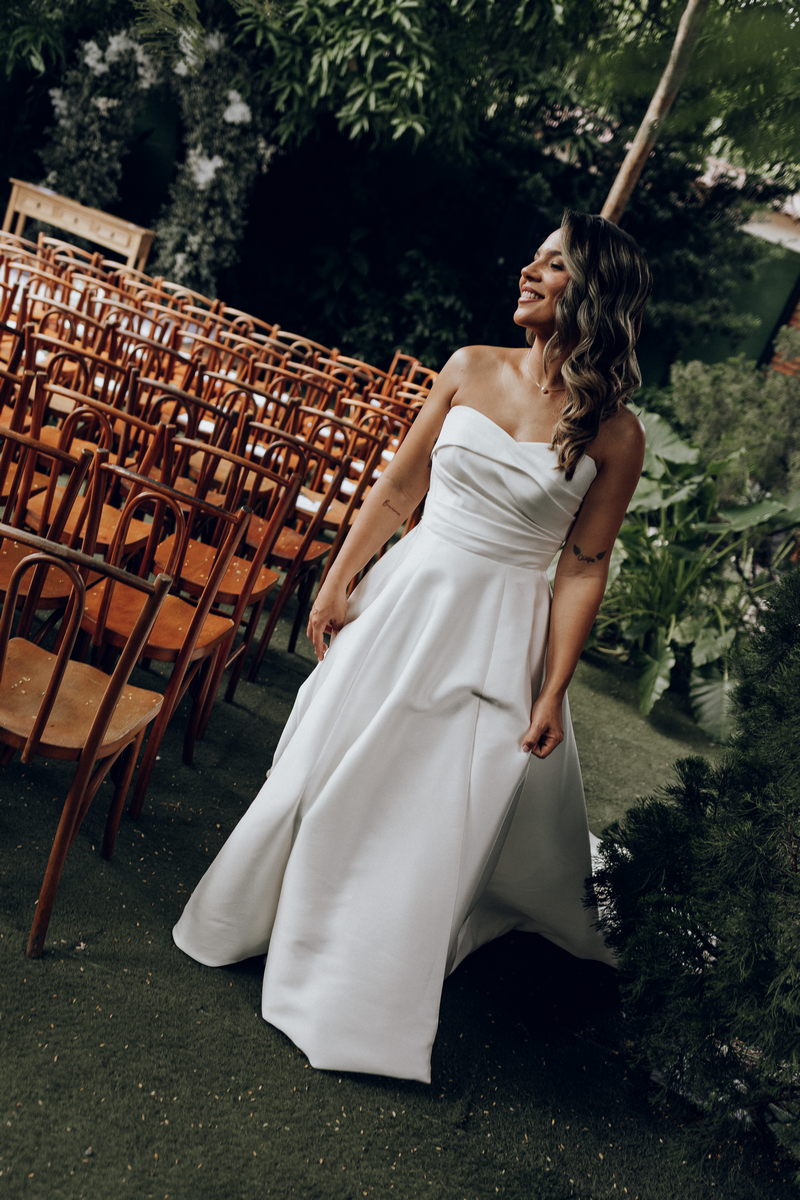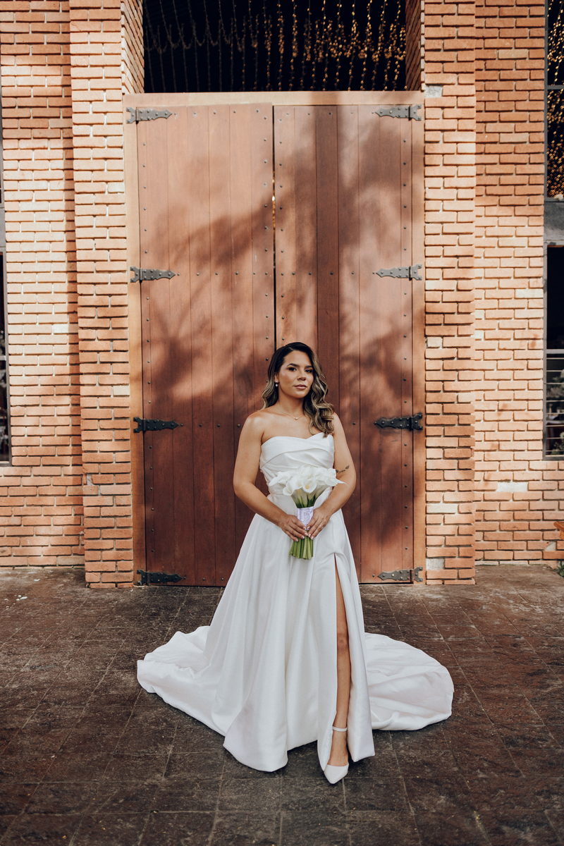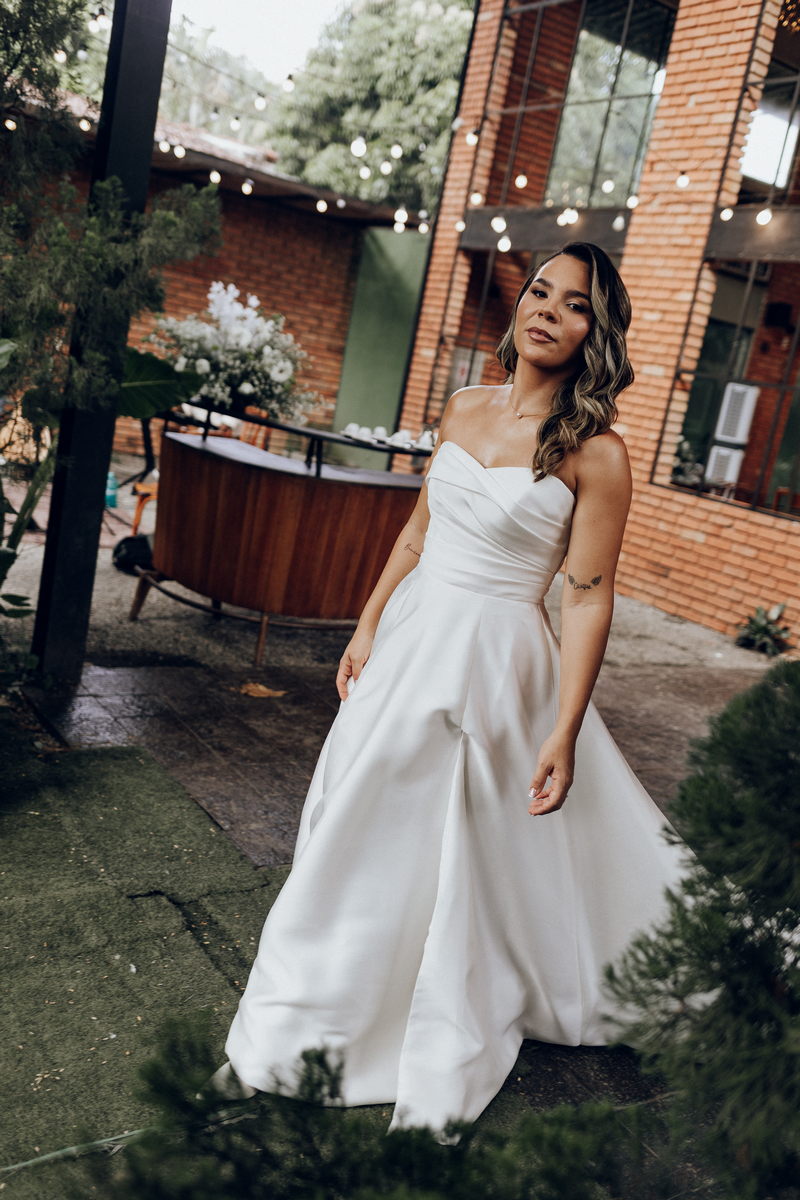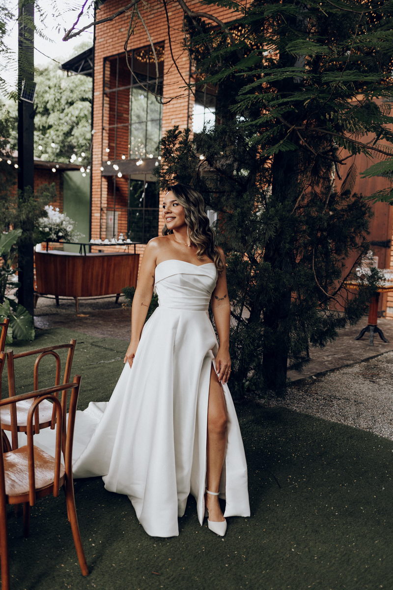 Isabelle era a verdadeira estrela do dia, com sua beleza sem igual. O seu vestido de noiva Internovias potencializou essa beleza com perfeição. O modelo, com acabamento impecável, apresentava decote tomara que caia com drapeado suave. A modelagem A-line, estruturada no corpo e fluindo com leveza até a saia volumosa, valorizou a silhueta da noiva com equilíbrio entre movimento e presença. A abertura frontal acrescentou modernidade e deixou o caminhar mais fluido, revelando discretamente os sapatos e reforçando a personalidade do look.