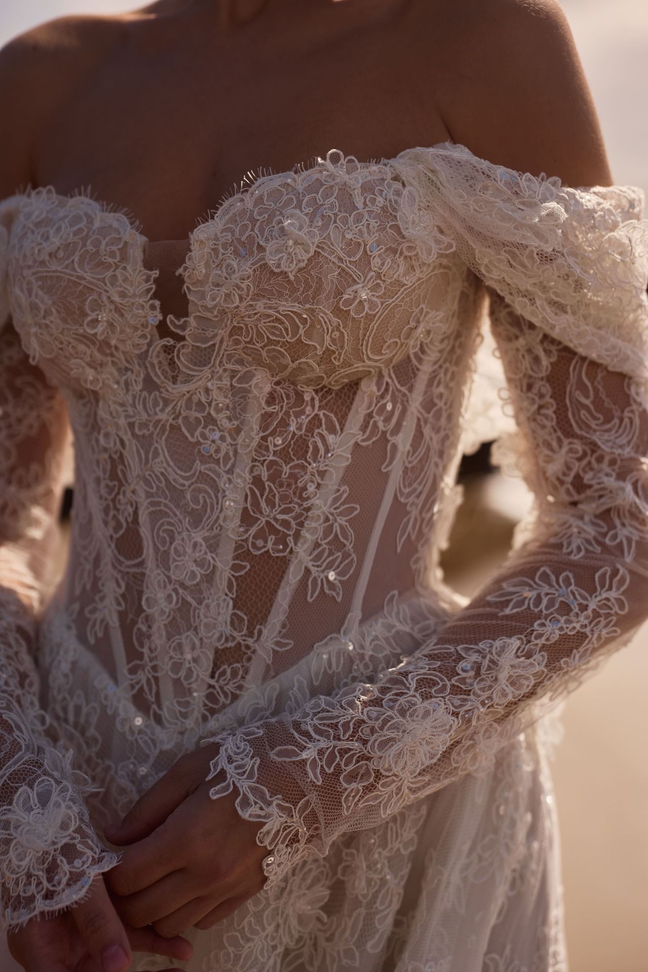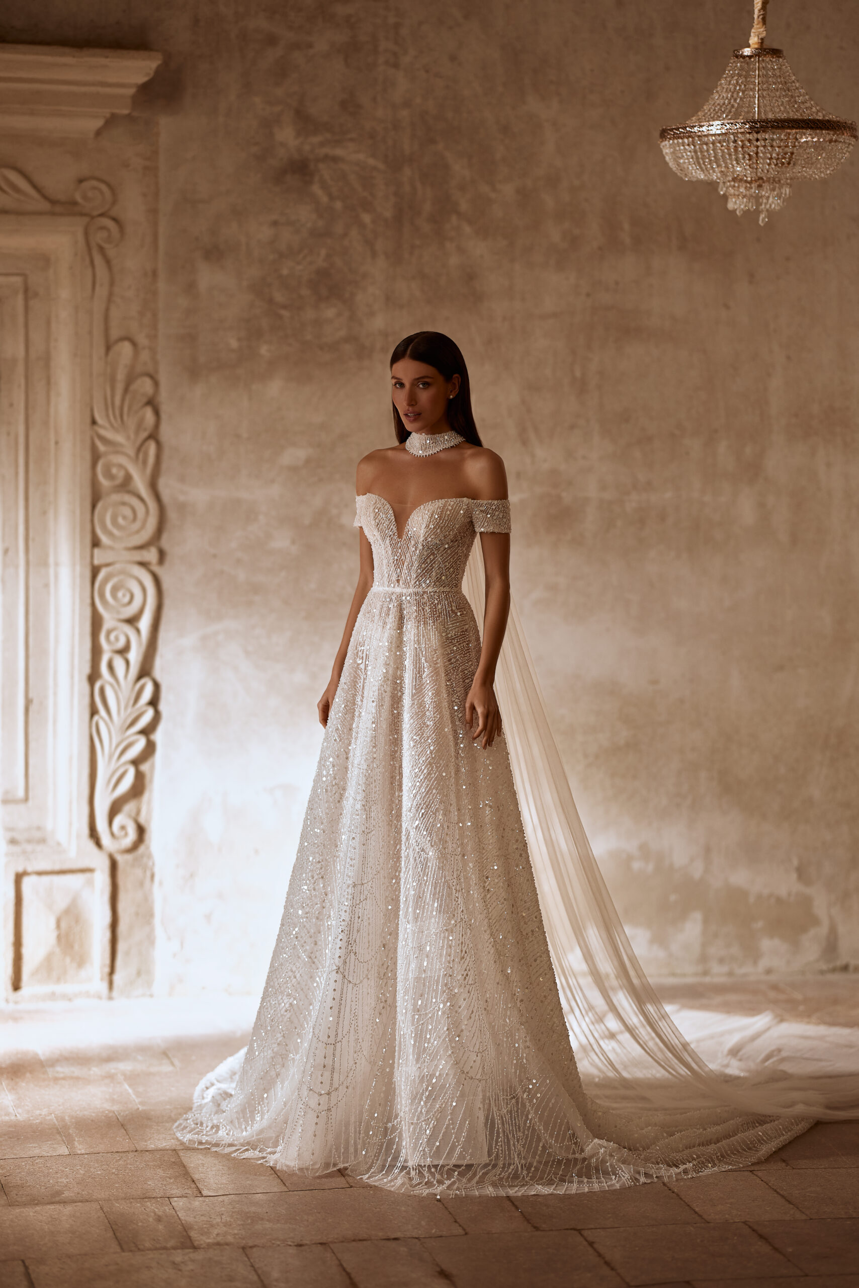 Entre as novidades que mais aparecem nas coleções de vestido de noiva importado, os cordões em renda surgem como um gesto de styling extremamente sofisticado. Eles não funcionam como um acessório separado, mas como uma extensão natural do traje, quase como se o vestido continuasse com uma gola alta.