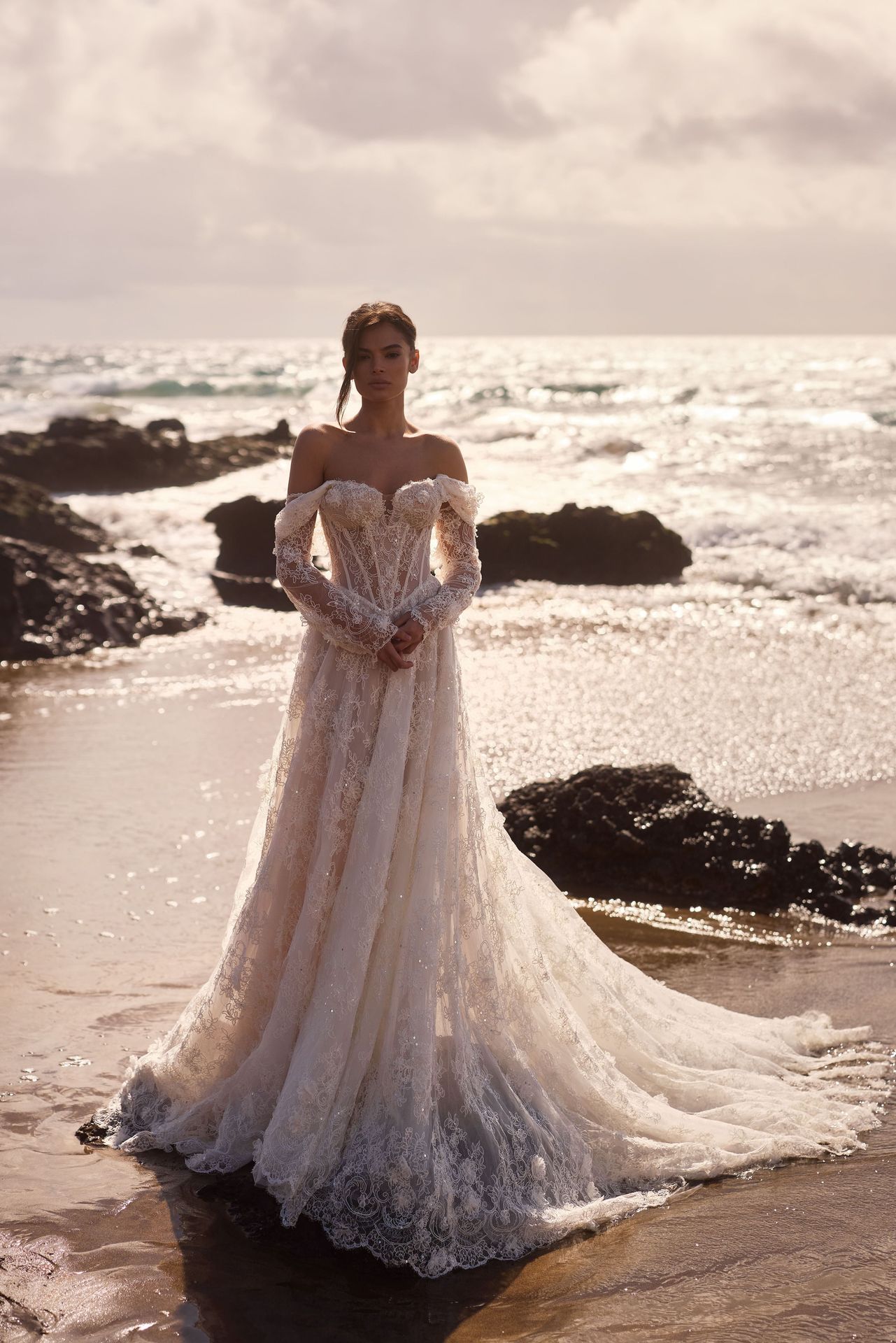 O resultado é notável: a silhueta parece mais esguia, a postura ganha imponência e o vestido assume um ar nobre. É um recurso clássico reinterpretado de maneira contemporânea, perfeito para a noiva que quer uma presença marcante e sem excessos.