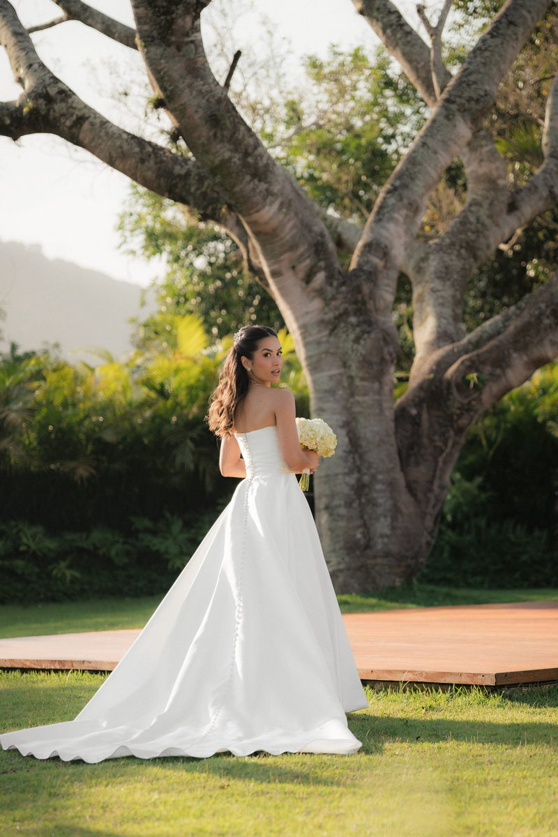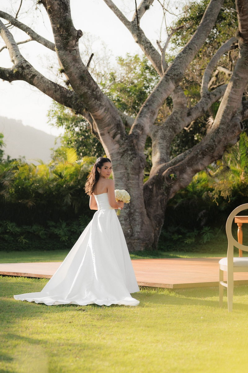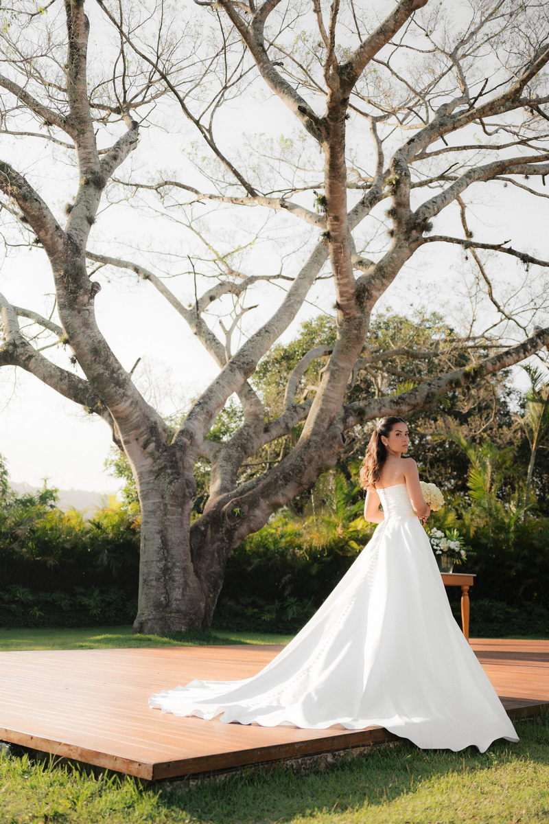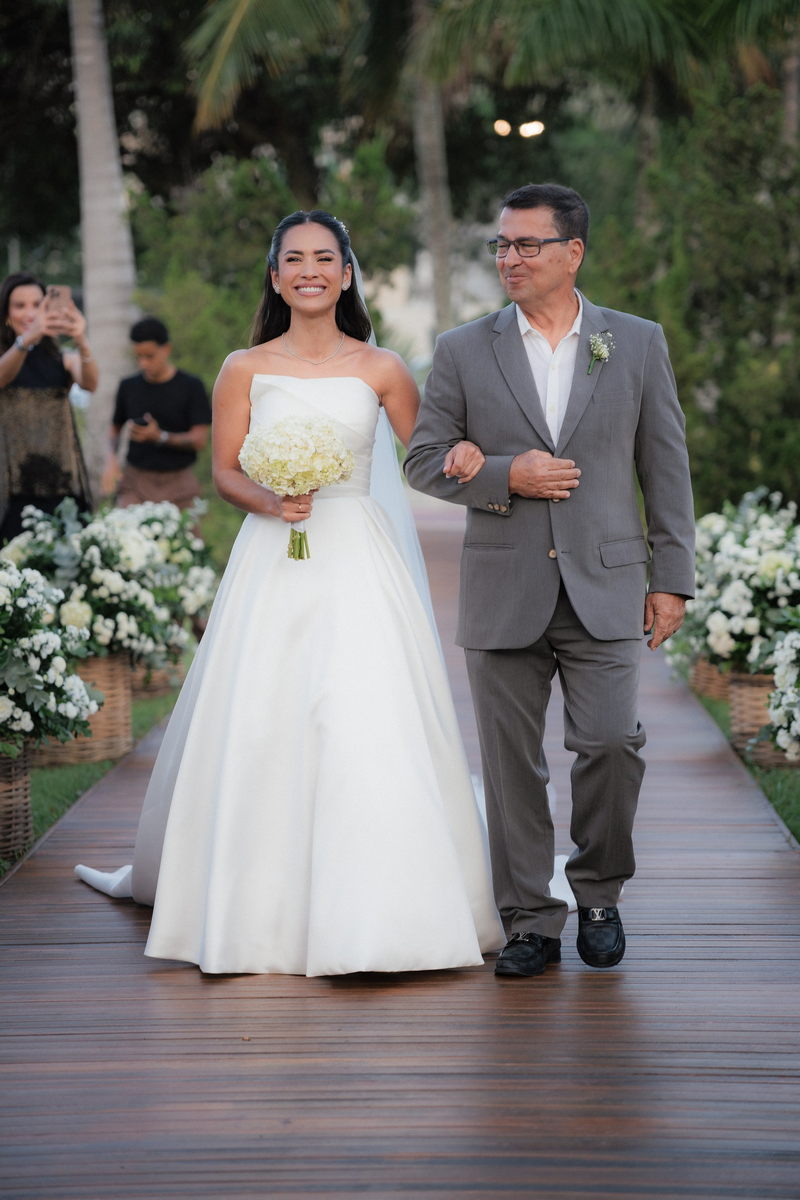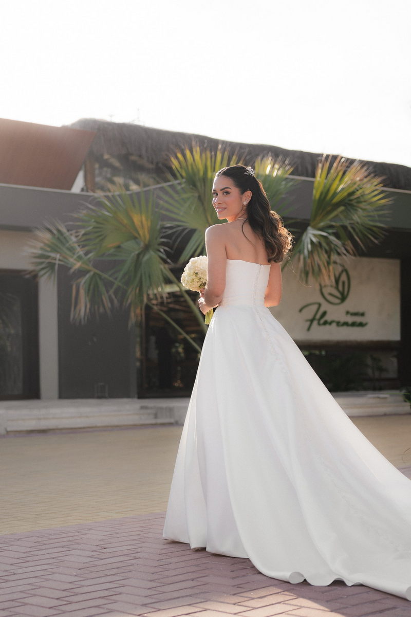 Sarah apareceu com uma presença serena e encantadora, seu vestido de noiva Internovias evidenciou sua beleza. O modelo minimalista tomara que caia, com modelagem evasê criava um equilíbrio elegante entre volume e fluidez. A cauda longa e circular se abria de forma ampla e contínua, mantendo seu desenho mesmo em áreas irregulares do terreno. Sem renda, bordados ou aplicações, o vestido se apoia exclusivamente na alfaiataria do corpo, na qualidade do tecido e na proporção do corte, resultando em um visual sofisticado, luminoso e atemporal.