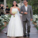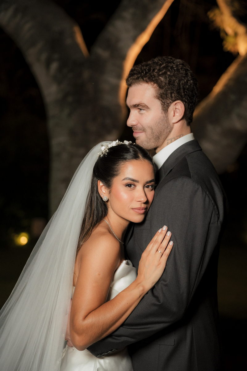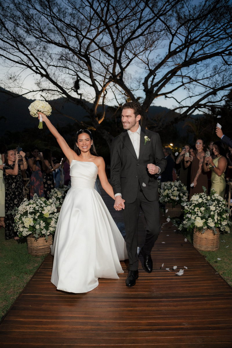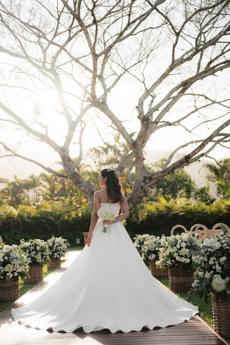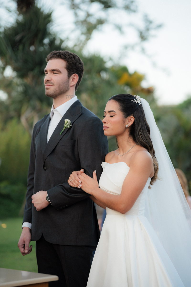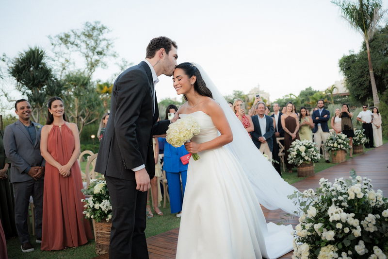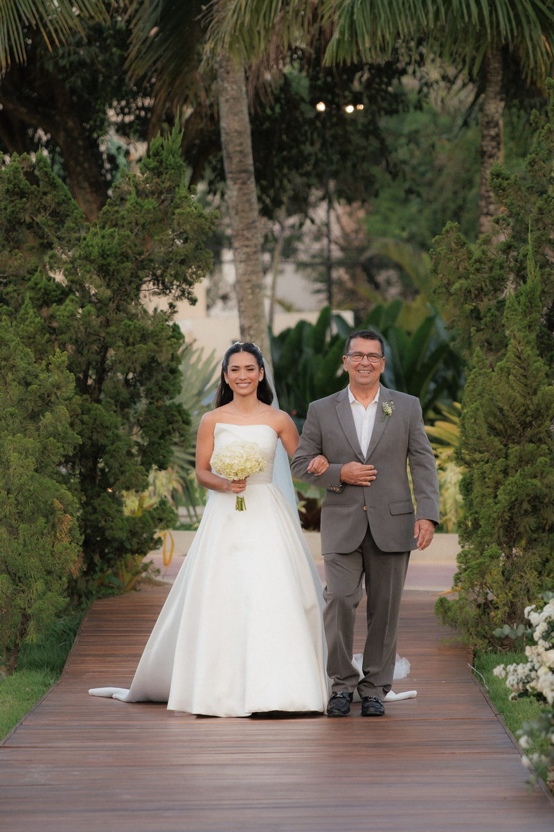 Sarah apareceu com uma presença serena e encantadora, seu vestido de noiva Internovias evidenciou sua beleza. O modelo minimalista tomara que caia, com modelagem evasê criava um equilíbrio elegante entre volume e fluidez. A cauda longa e circular se abria de forma ampla e contínua, mantendo seu desenho mesmo em áreas irregulares do terreno. Sem renda, bordados ou aplicações, o vestido se apoia exclusivamente na alfaiataria do corpo, na qualidade do tecido e na proporção do corte, resultando em um visual sofisticado, luminoso e atemporal.