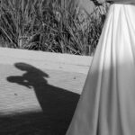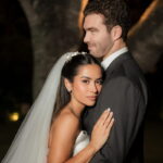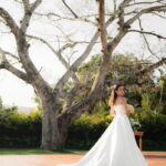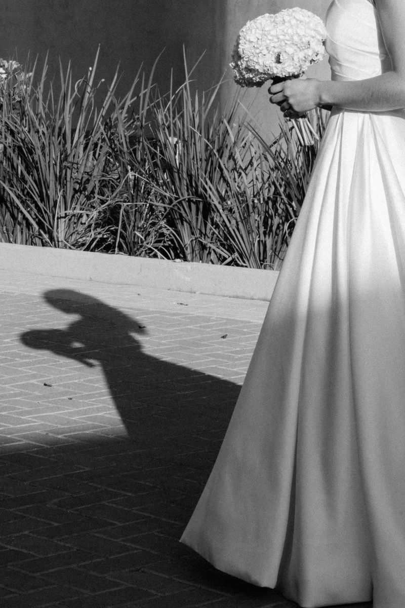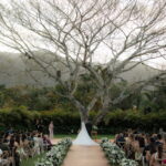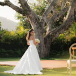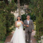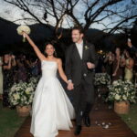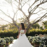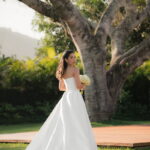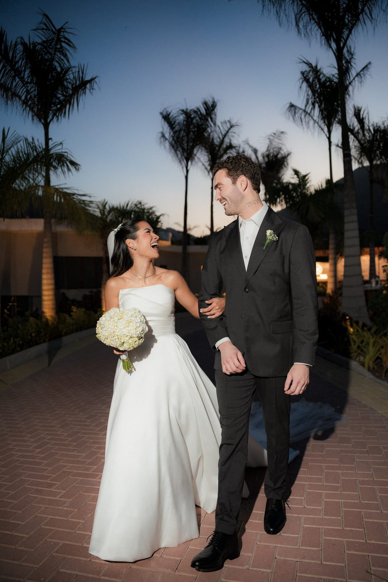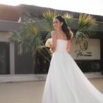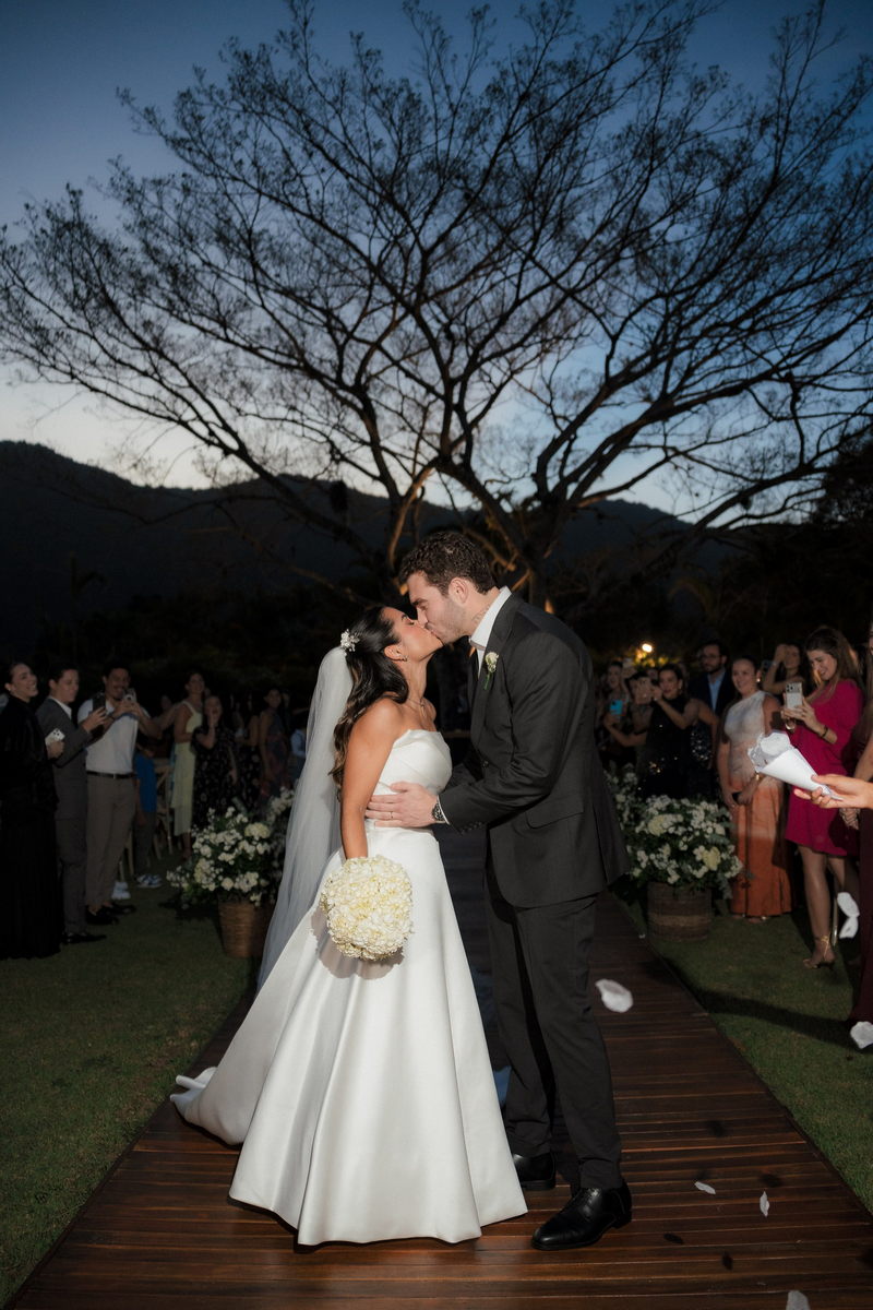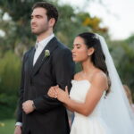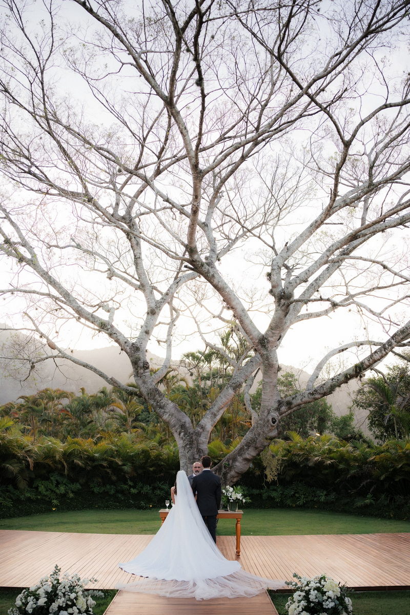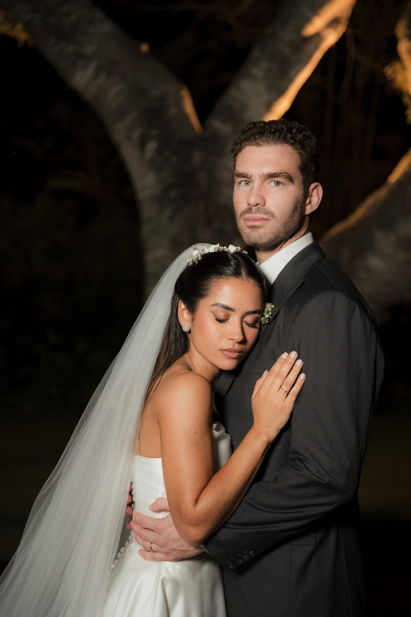 Sarah apareceu com uma presença serena e encantadora, seu vestido de noiva Internovias evidenciou sua beleza. O modelo minimalista tomara que caia, com modelagem evasê criava um equilíbrio elegante entre volume e fluidez. A cauda longa e circular se abria de forma ampla e contínua, mantendo seu desenho mesmo em áreas irregulares do terreno. Sem renda, bordados ou aplicações, o vestido se apoia exclusivamente na alfaiataria do corpo, na qualidade do tecido e na proporção do corte, resultando em um visual sofisticado, luminoso e atemporal.
