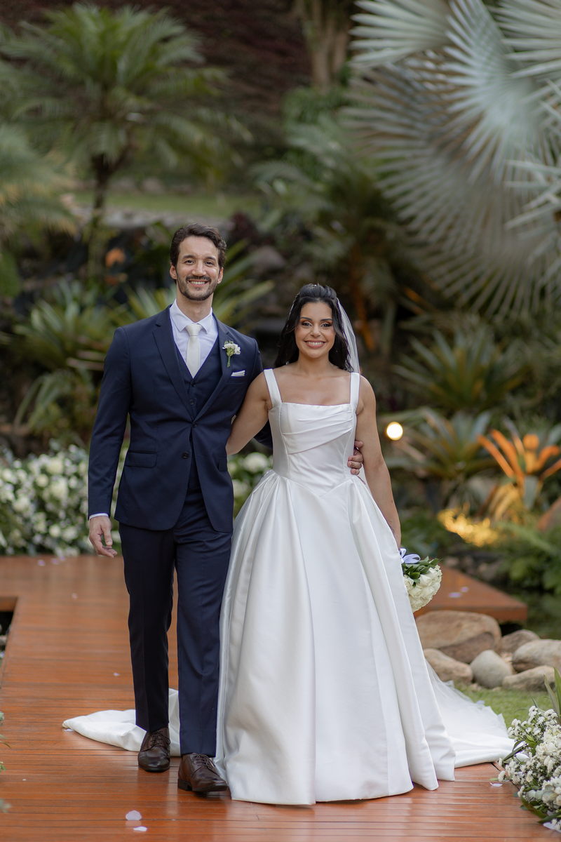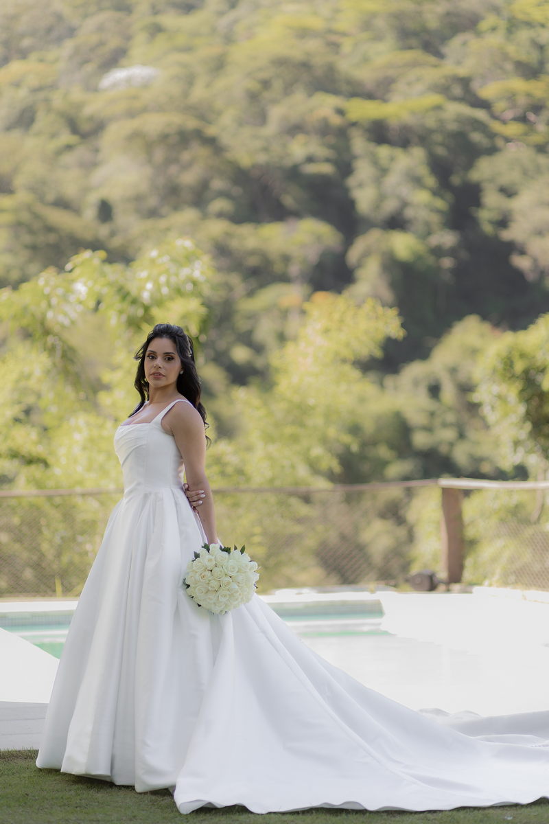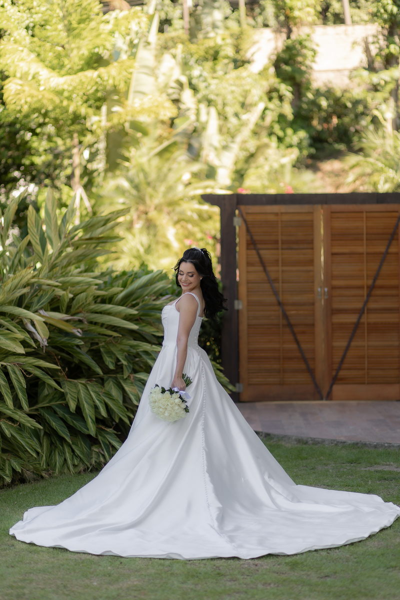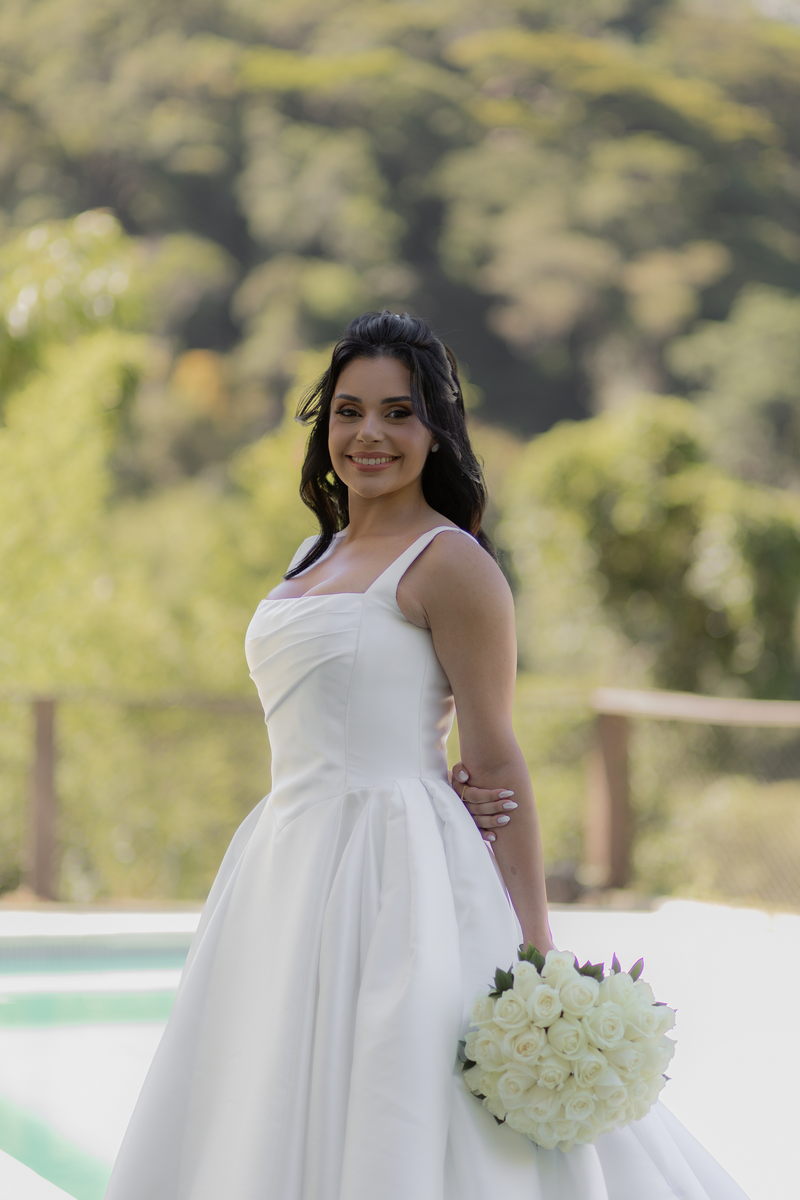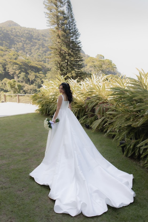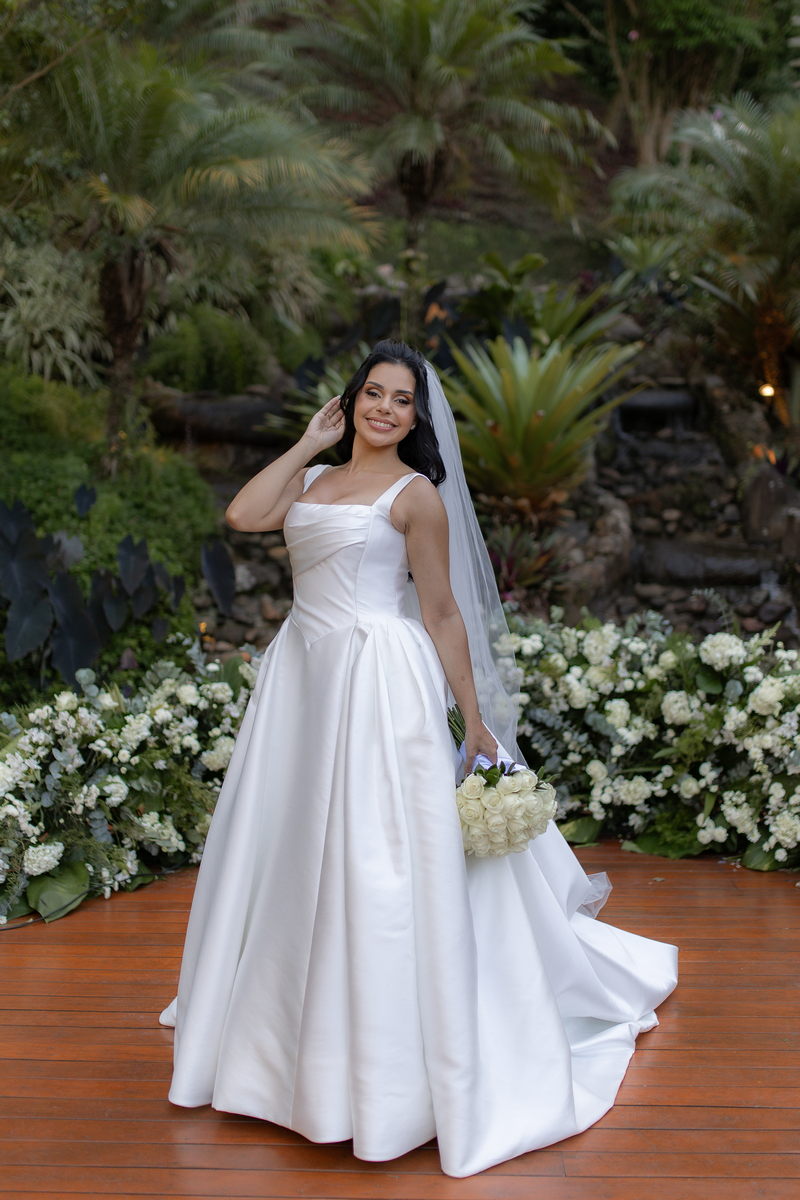 Andressa estava deslumbrante de noiva, com sua beleza natural e sorriso encantador. O vestido de noiva Internovias escolhido por ela merece atenção especial: modelo com caimento impecável, minimalista e extremamente sofisticado. O decote com drapeado diferenciado valorizava o colo e trazia feminilidade sem excessos, enquanto as alças largas complementavam o desenho elegante da parte superior. A saia volumosa, com brilho suave do tecido e uma cauda longa que acompanhava cada passo, criava uma silhueta de impacto e movimento fluido. Na parte de trás, a fileira de botões delicados completava o design com acabamento primoroso.
