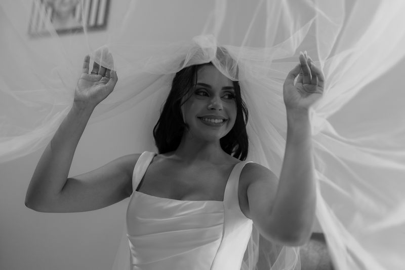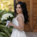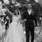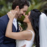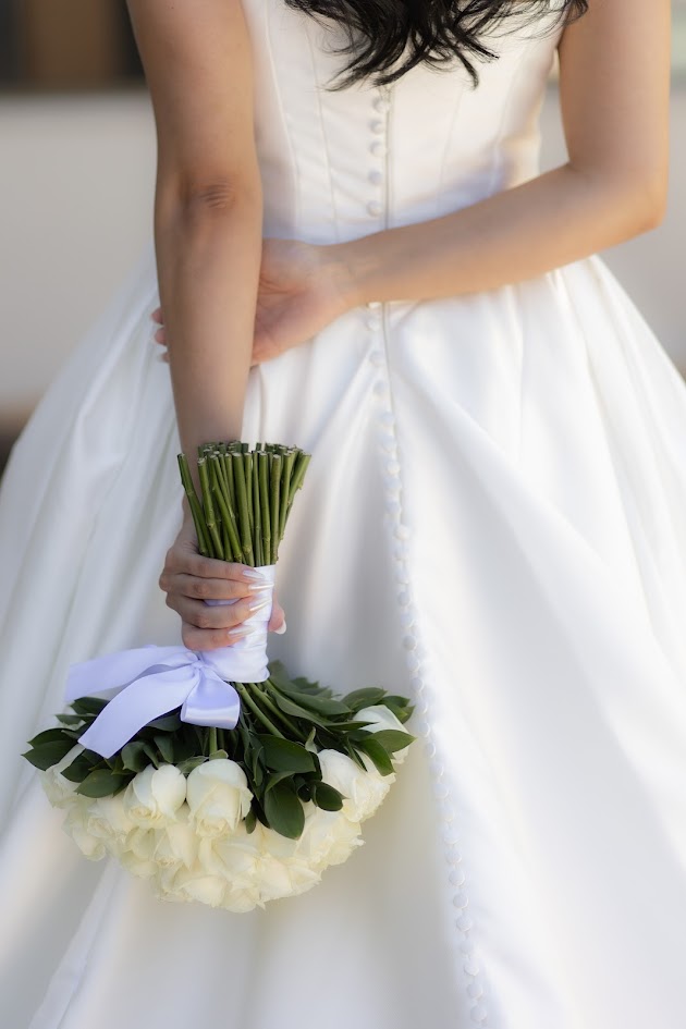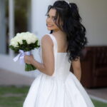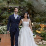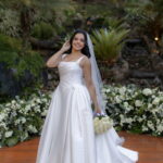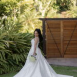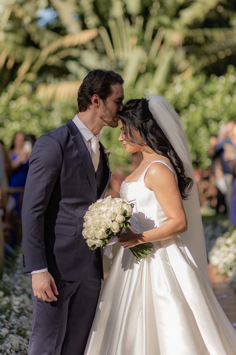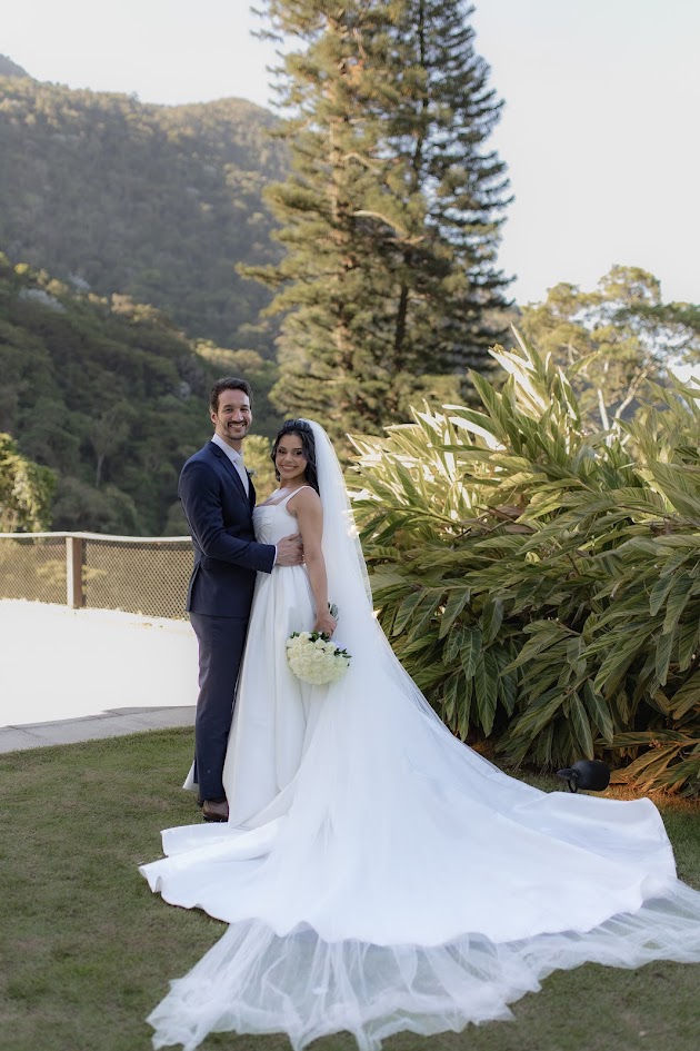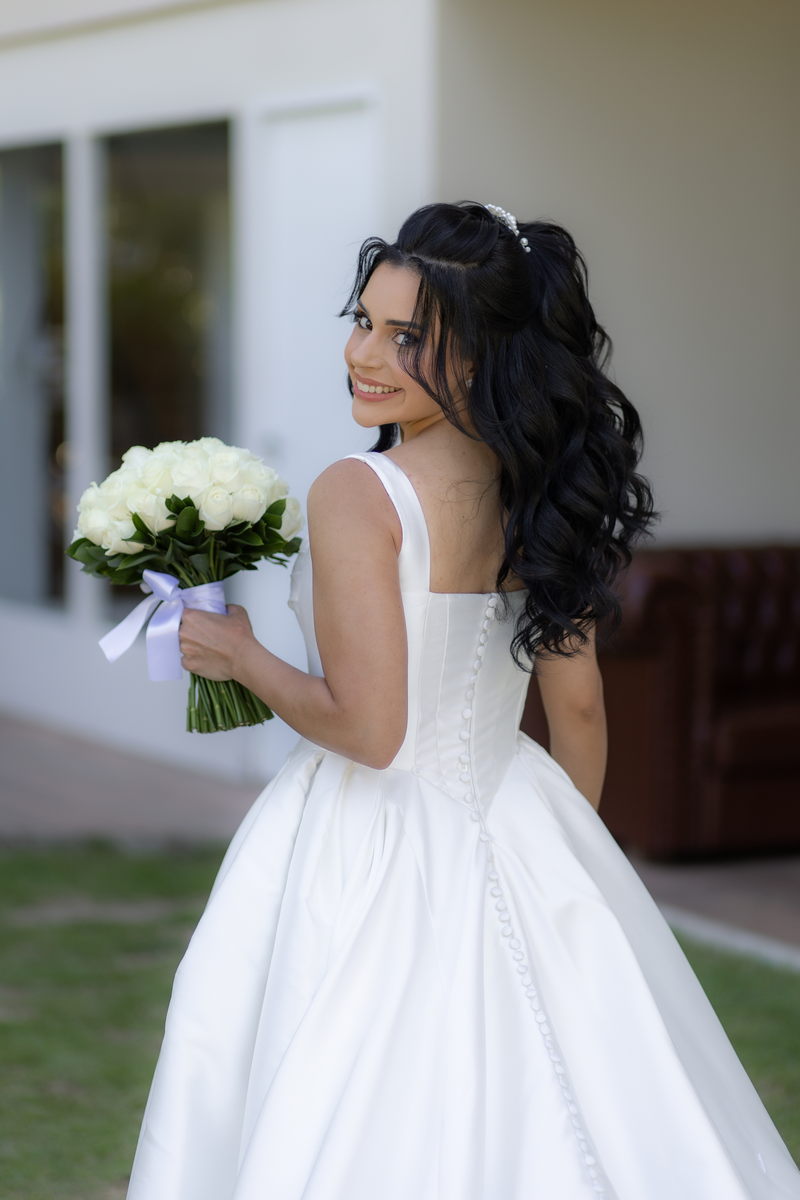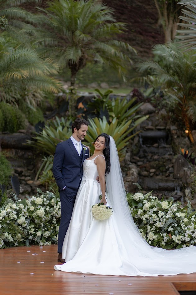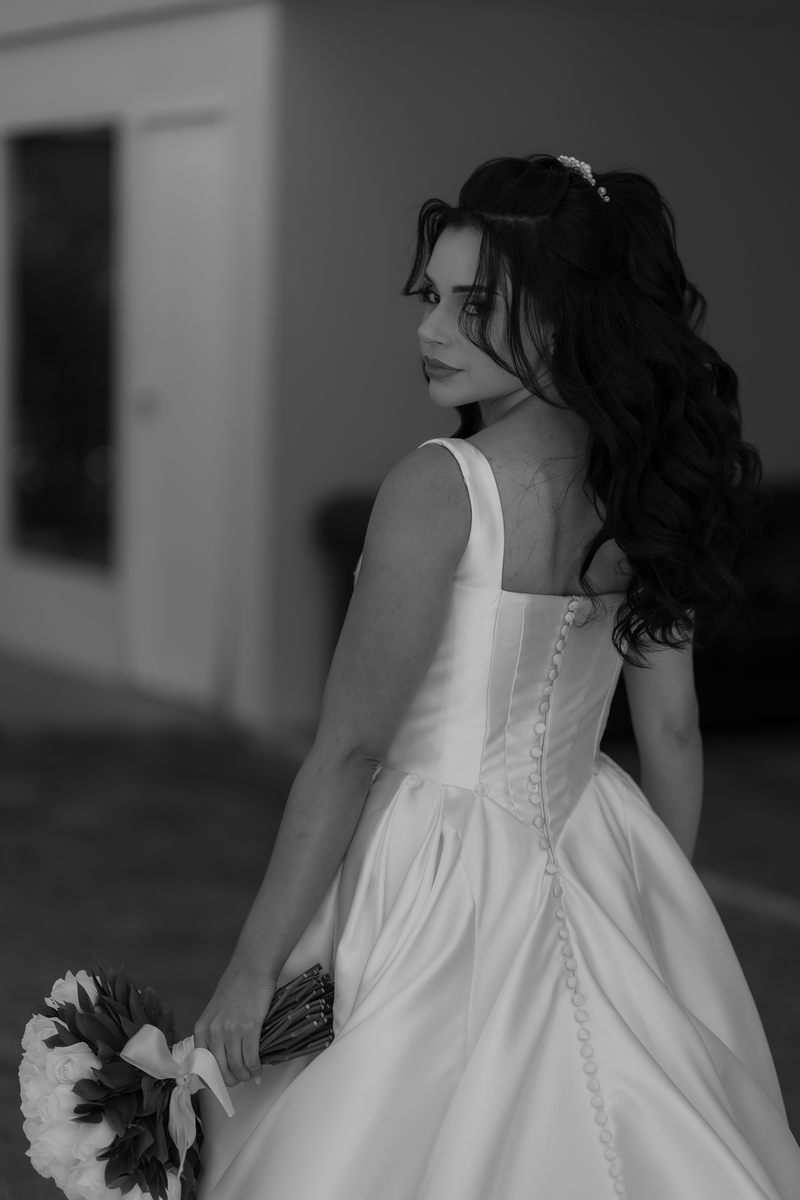 Andressa estava deslumbrante de noiva, com sua beleza natural e sorriso encantador. O vestido de noiva Internovias escolhido por ela merece atenção especial: modelo com caimento impecável, minimalista e extremamente sofisticado. O decote com drapeado diferenciado valorizava o colo e trazia feminilidade sem excessos, enquanto as alças largas complementavam o desenho elegante da parte superior. A saia volumosa, com brilho suave do tecido e uma cauda longa que acompanhava cada passo, criava uma silhueta de impacto e movimento fluido. Na parte de trás, a fileira de botões delicados completava o design com acabamento primoroso.